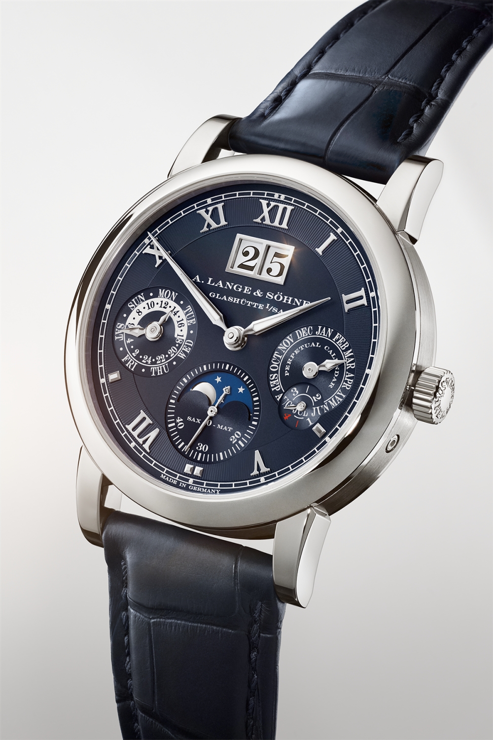 Để giữ lại bố cục quen thuộc của dòng Lange 1, mặt số được đảo gương. Chỉ báo năng lượng cót được thay thế bằng hiển thị ngày trong tuần dạng retrograde, trong khi mặt hiển thị giờ lệch tâm và lịch ngày cỡ lớn được sắp xếp lại tương ứng. Rotor trung tâm của calibre L086.1 được skeleton hóa, cho phép quan sát các chi tiết hoàn thiện của bộ máy bên dưới.