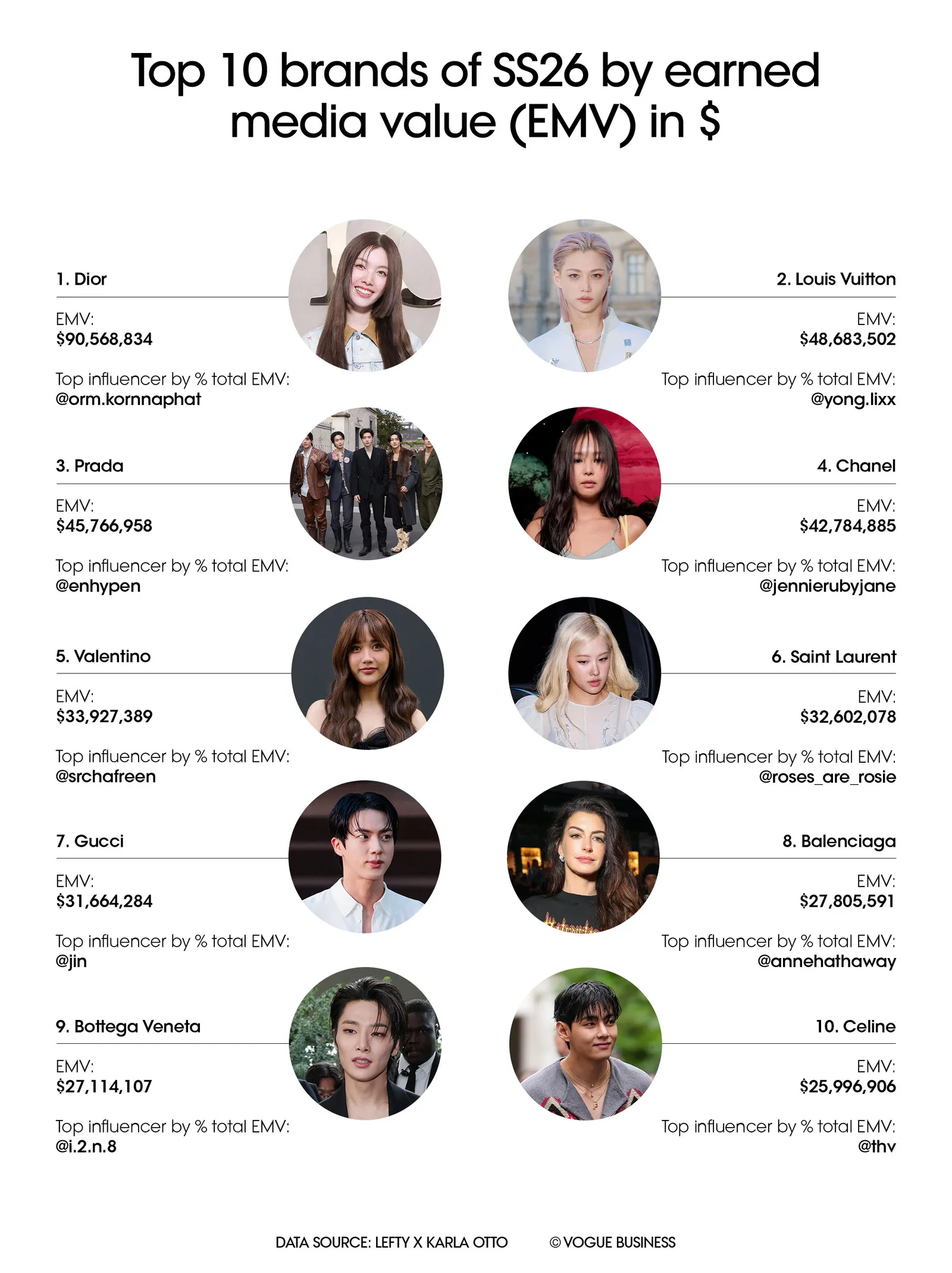 Thế nhưng, thời trang ngày nay không đơn thuần là những màn trình diễn trên runway. Một “sàn diễn vô hình” khác cũng trở thành tâm điểm chú ý – Nơi những ngôi sao giải trí đang nắm trong tay một quyền lực mới: Quyền lực của sự lan tỏa. Trong thời đại nơi một bức ảnh có thể lan đi toàn cầu chỉ trong vài phút, người mặc đôi khi còn tạo chú ý nhiều hơn thứ họ mặc. Vì thế, các tuần lễ thời trang không chỉ so kè thiết kế, mà còn cạnh tranh bằng sức ảnh hưởng truyền thông – EMV. Vậy tại mùa Xuân Hè 2026 này, ai là người thống trị bảng xếp hạng này?