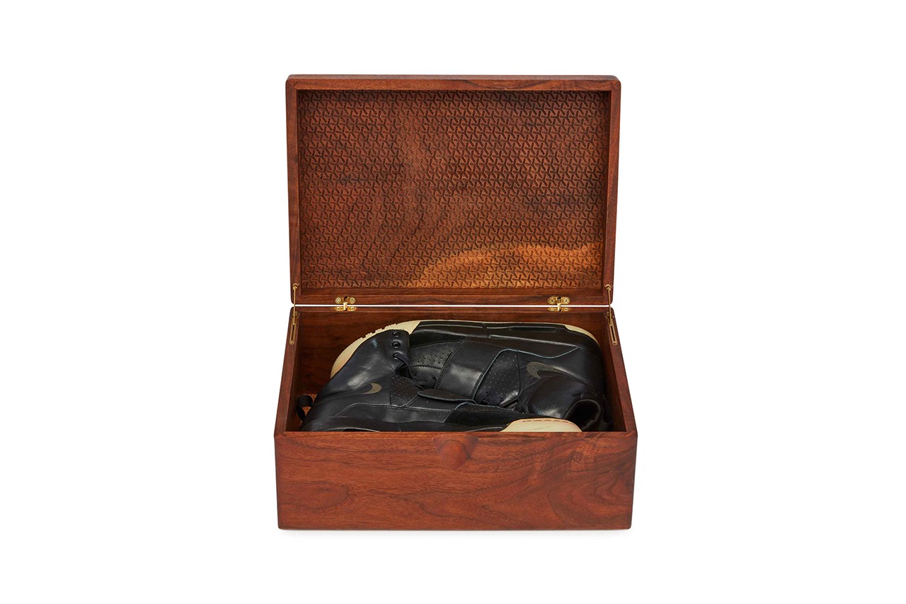 Kích cỡ đôi giày là 12 US (tương đương size 43 tại Việt Nam), được gia công từ công ty thiết kế danh tiếng Innovation Kitchen tại Oregon, Mỹ bởi hai nhà chế tác West Smith và Mark Smith trực tiếp gia công. Phần trên giày bao phủ bằng lớp da mềm màu đen với các chi tiết đục lỗ. Cùng với đó là dấu Swoosh ton-sur-ton nằm trên, dây thắt kinh điển của Nike Yeezy và một ổ khóa dây ánh hồng với ký tự Y. Và cuối cùng, đôi giày được đựng trong một chiếc hộp gỗ, được bắn laser và điêu khắc bởi anh em nhà Smith.