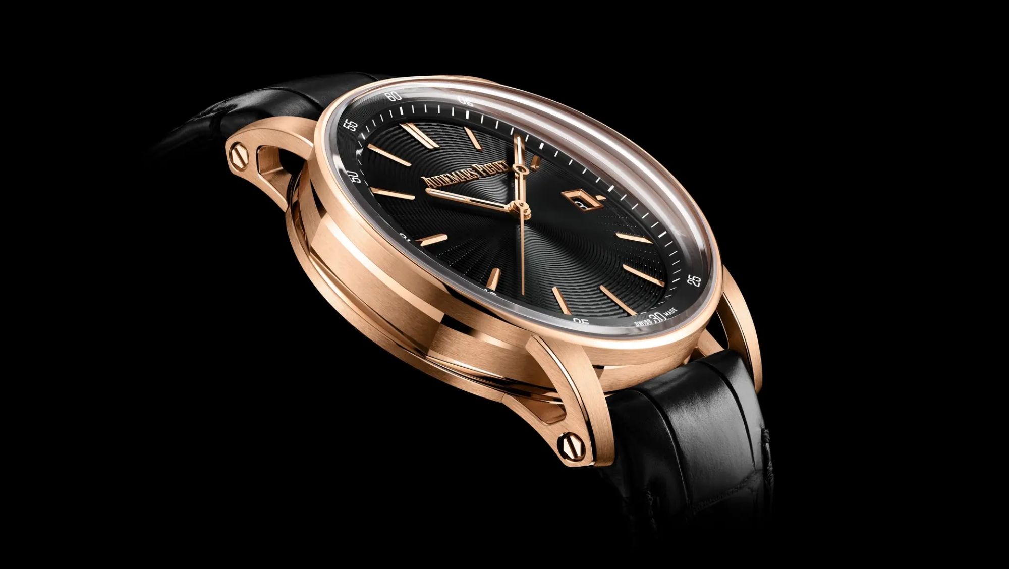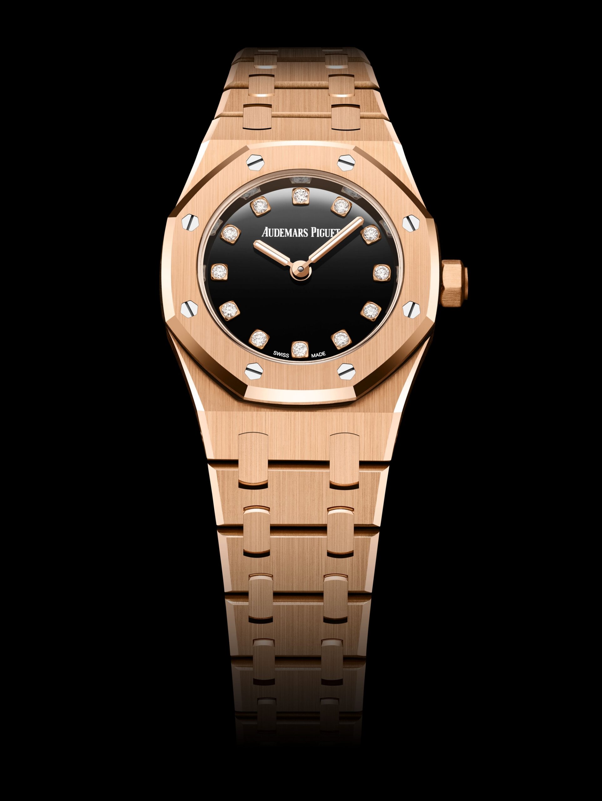 Phiên bản đầu tiên gây ấn tượng với mặt số onyx đen đánh bóng như gương – bề mặt giàu chiều sâu và đồng nhất toát lên cảm giác mạnh mẽ và thanh lịch. Các cọc giờ kim cương cắt brilliant được bố trí khéo léo trên mặt số, tạo nên sự tương phản rõ nét và lan tỏa vẻ tinh tế sang trọng. Onyx – loại đá thường gắn liền với ý nghĩa sức mạnh và sự bảo hộ mang đến chiều sâu biểu tượng cho cỗ máy bằng vàng hồng 18 carat này.