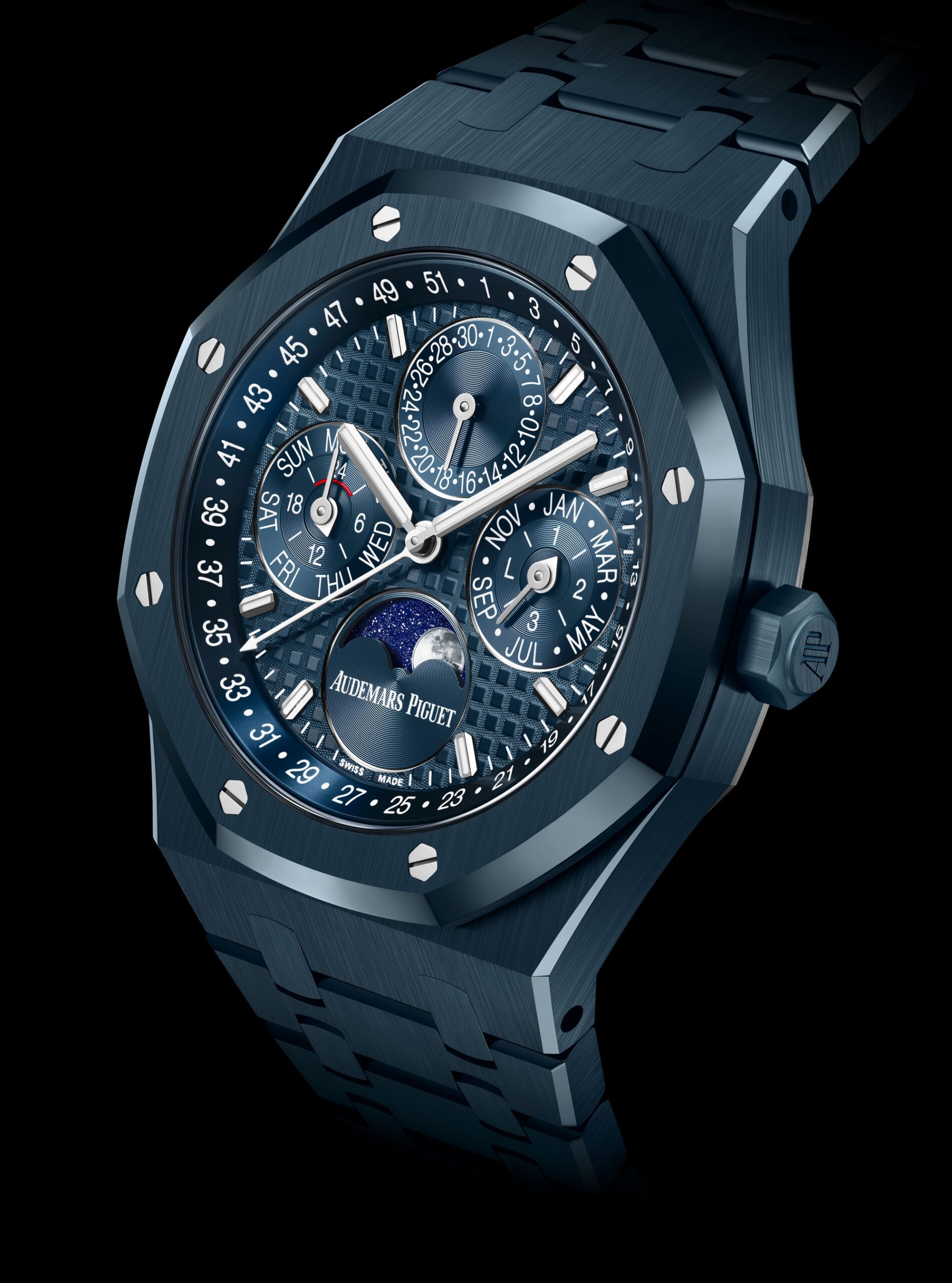 Được thiết kế với ưu tiên hàng đầu là tính công thái học và sự dễ sử dụng, mẫu đồng hồ còn gây ấn tượng bởi mặt số hài hòa, giúp việc đọc các thông tin lịch trở nên trực quan và rõ ràng. Vỏ và dây đều được chế tác toàn bộ bằng ceramic “Bleu Nuit, Nuage 50” – sắc xanh đặc trưng gắn liền với lịch sử của Audemars Piguet – đem lại sự nhẹ nhàng vượt trội và tôn lên nét thanh thoát của tổng thể thiết kế. Độ sâu của màu sắc này càng trở nên cuốn hút nhờ hiệu ứng tương phản giữa các bề mặt đánh bóng và phủ satin, tạo nên một màn trình diễn ánh sáng đầy mê hoặc.