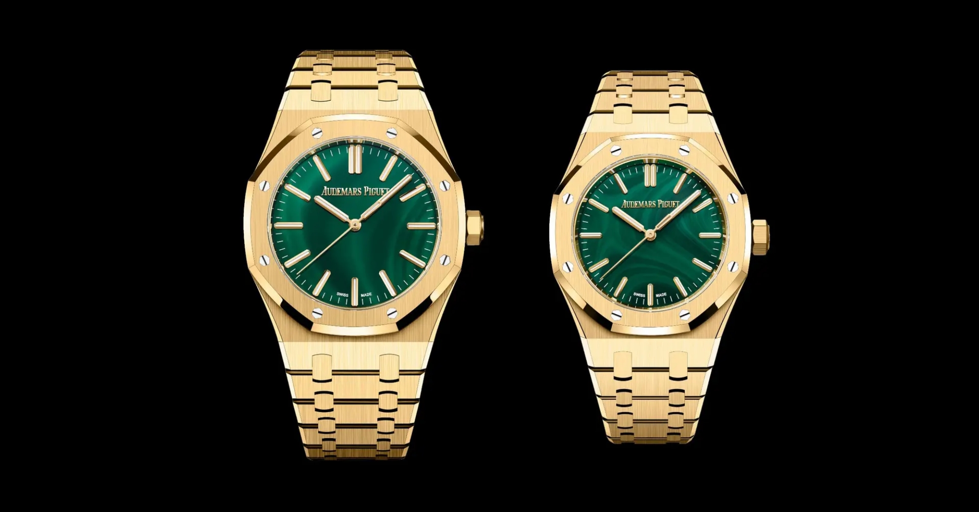 Audemars Piguet mang đến vẻ đẹp say đắm cho 2 phiên bản Royal Oak Selfwinding mới, được chế tác bằng chất liệu vàng trong hai kích thước là 37 mm và 41 mm, đi kèm dây đeo vàng đồng bộ. Điểm nhấn nổi bật của hai cỗ máy thời gian này nằm ở mặt số đá malachite tự nhiên đầy cuốn hút.