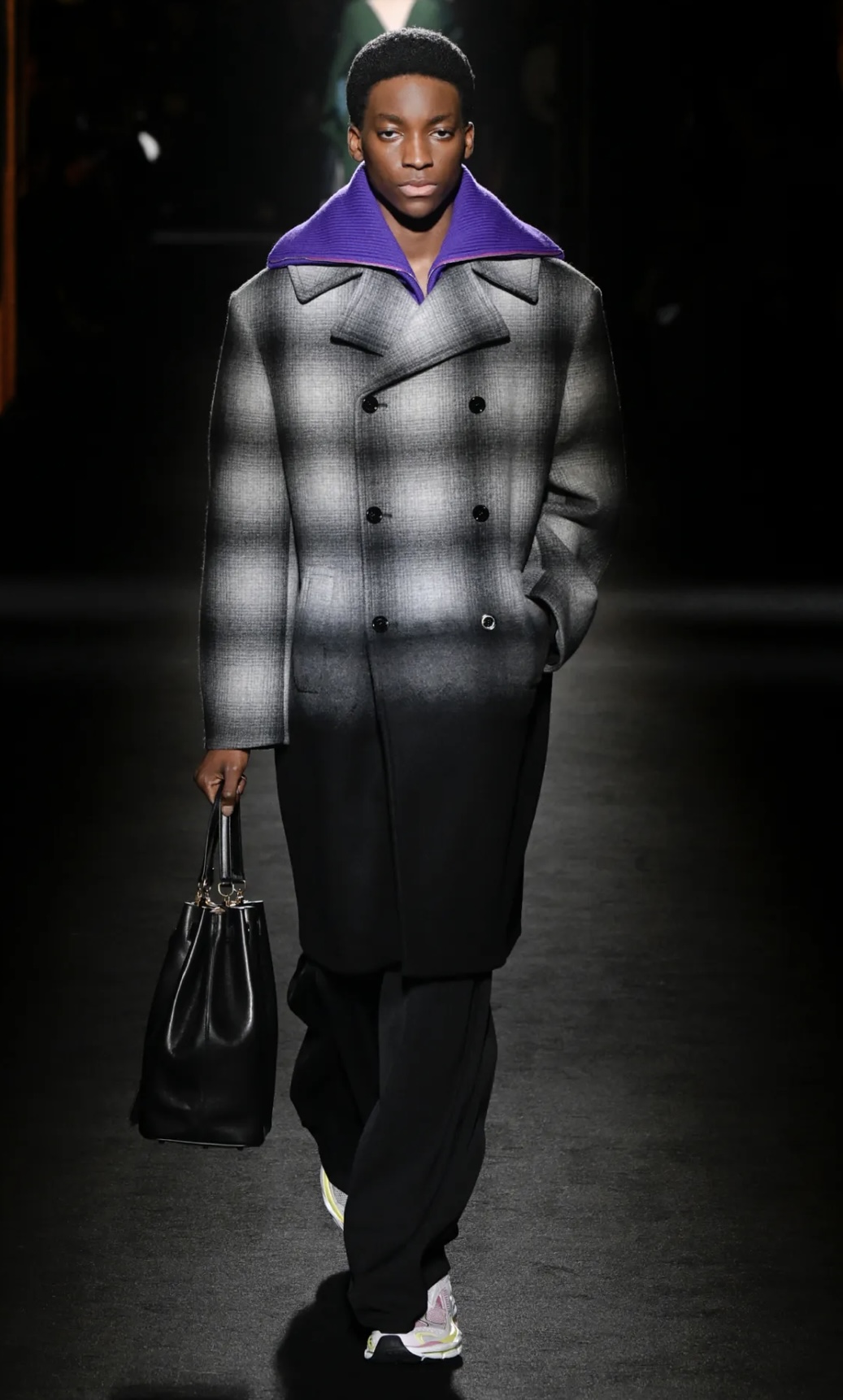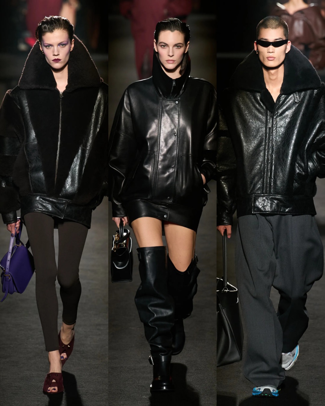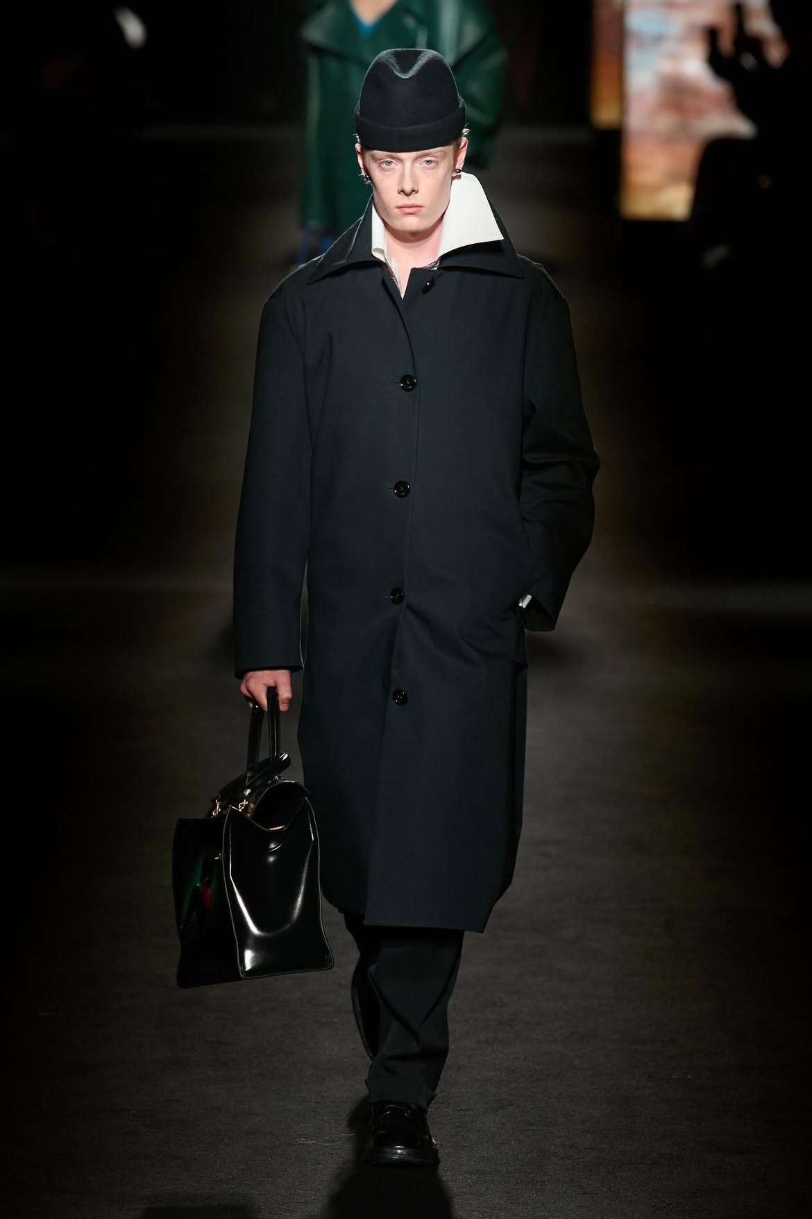 Show mở màn đầy ấn tượng với loạt trang phục đen — Gam màu chủ đạo của mùa này cũng như DNA quen thuộc của Balenciaga như chiếc bomber da phom bong bóng với phần lưng phồng kiểu cocoon. Áo peacoat điêu khắc với cổ áo vươn cao như cánh hoa loa kèn. Áo khoác sĩ quan đầy quyền lực với cổ và ve áo dựng đứng khỏi bờ vai hơi khom.