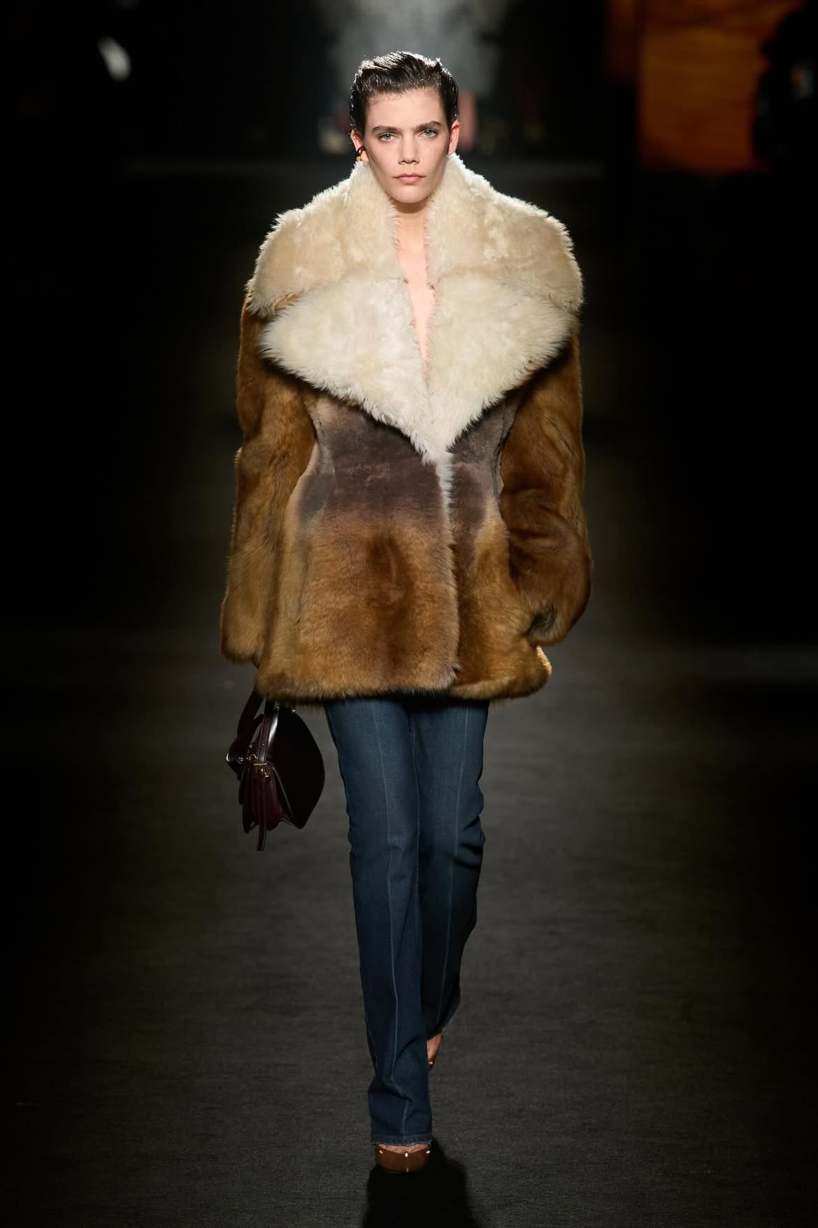 Phụ kiện cũng tạo điểm nhấn thú vị: Phiên bản mềm mại và hơi nhàu của chiếc túi Hourglass, cùng những đôi giày brogue đính đinh lệch chuẩn, kết quả của màn hợp tác với J.M. Weston.