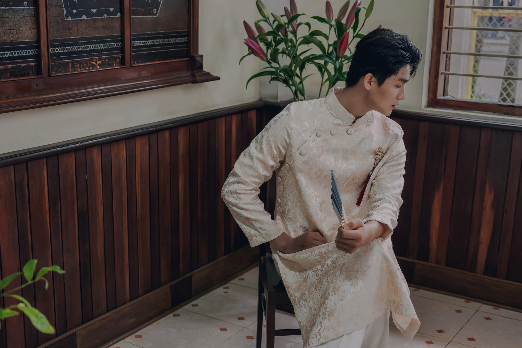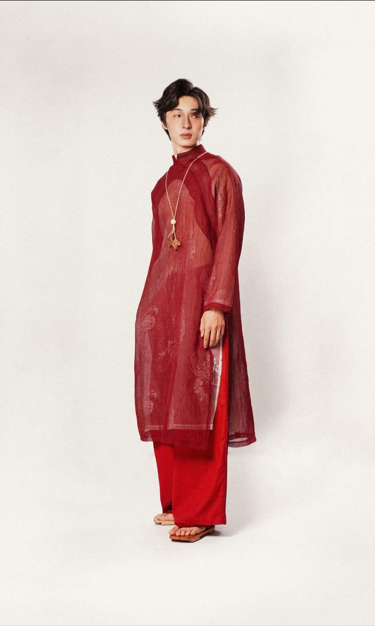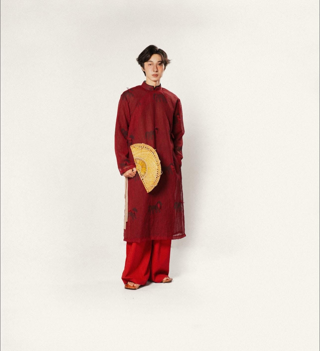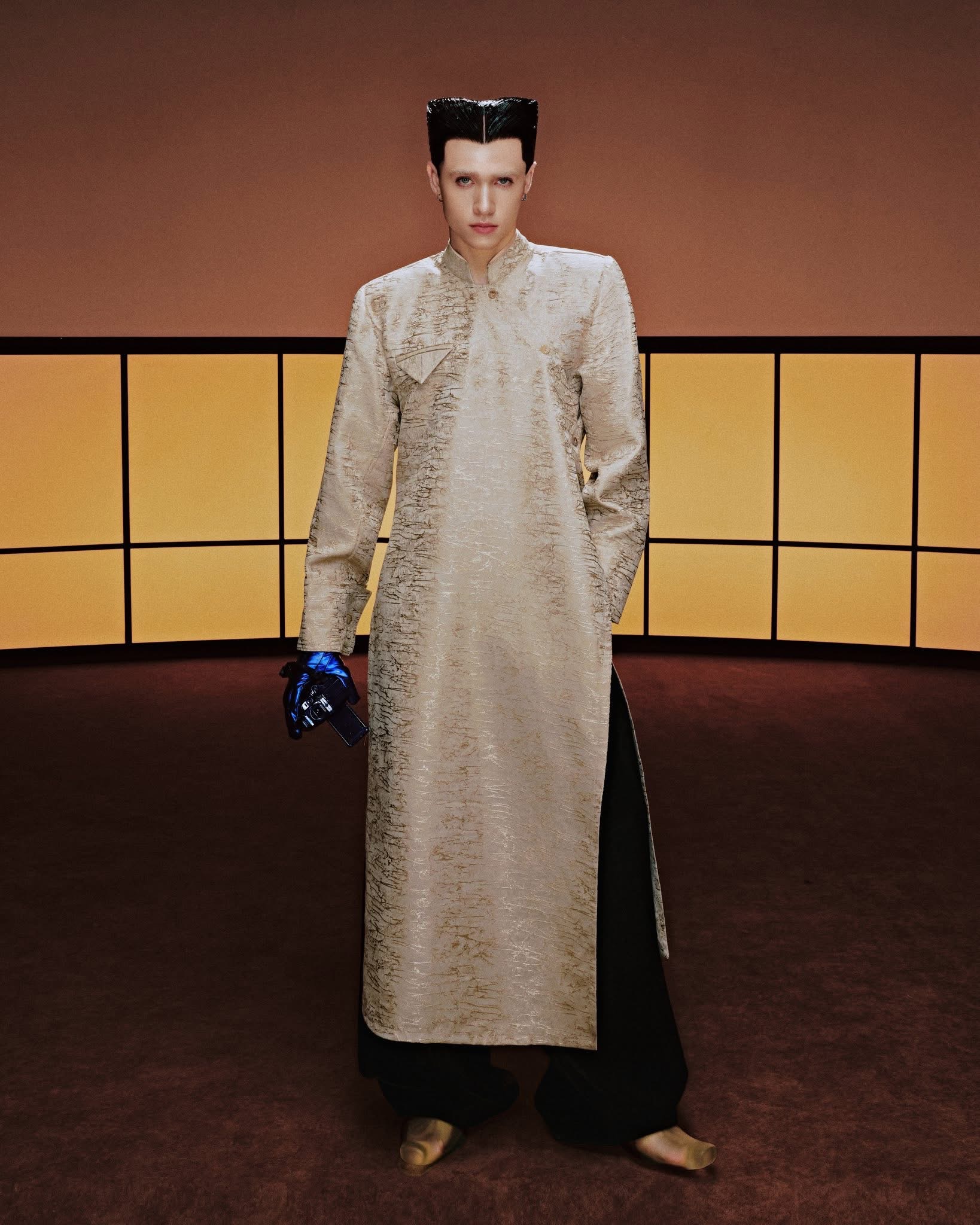 Hoàng Thị ’26 Là hành trình xuôi về miền Tây, nơi dòng Cửu Long đánh thức những ký ức dịu êm về người đàn ông đã bình thản đi qua bao mùa nước nổi mà thương hiệu THER muốn mang đến cho bộ sưu tập áo dài 2026. Ảnh hưởng của Đông Dương được thể hiện qua các trang phục gam màu phảng phất nét cổ xưa như xanh rêu mái đình, ánh vàng nhạt của tường vôi cũ và sắc đỏ mùa lễ hội. Tất cả tạo nên một không gian thị giác nơi người đàn ông hiện diện như phần hồn của kiến trúc và văn hoá phương Nam là sự cân bằng, chỉn chu và đầy tự trọng.