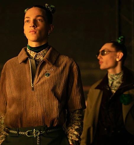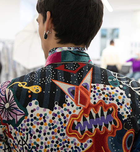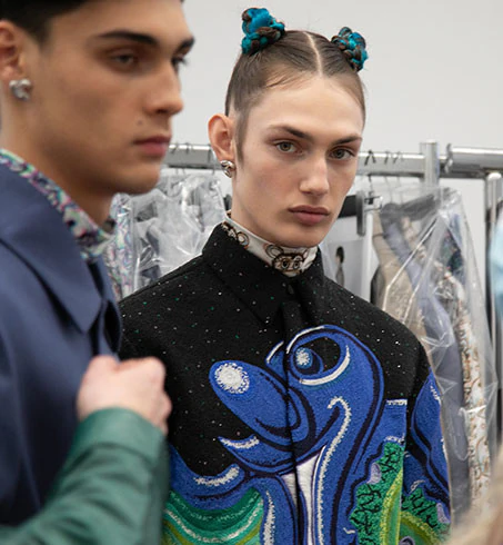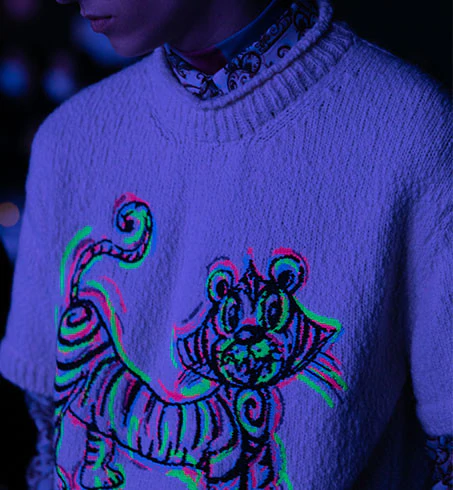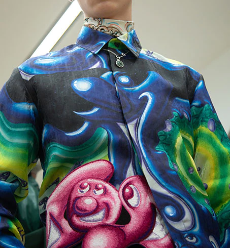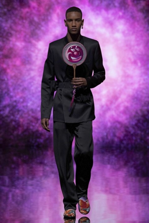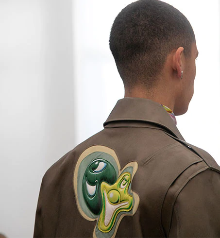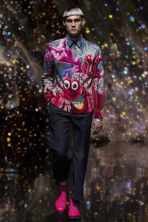 Từng thiết kế trong bộ sưu tập đều mang chi tiết điểm nhấn của những tác phẩm vui nhộn của Kenny Scharf. Kim Jones tinh tế diễn thể chúng bằng kỹ thuật in 3D và thêu mũi sa hạt (french knot), tạo nên những giá trị đỉnh cao, vừa tôn vinh kỹ nghệ thủ công di sản, vừa mang hơi thở của thời trang đương đại.