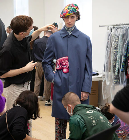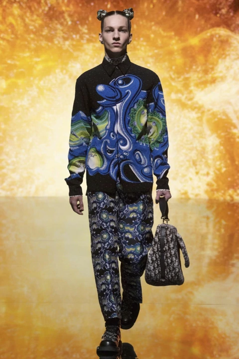 Trong bộ sưu tập Dior Men Fall 2021, Kim Jones hợp tác cùng nghệ sĩ thị giác người Mỹ, Kenny Scharf, để tạo ra một loạt các tác phẩm nghệ thuật đặc sắc, hóm hỉnh. Khi nhắc đến triết lý sáng tạo của Kenny, mọi người thường nhắc đến những tác phẩm mang cảm hứng vui nhộn. Là sự hòa lẫn giữa văn hóa đại chúng (pop-culture) và khoa học viễn tưởng; của những nhân hoạt hình và nghệ thuật siêu thực.