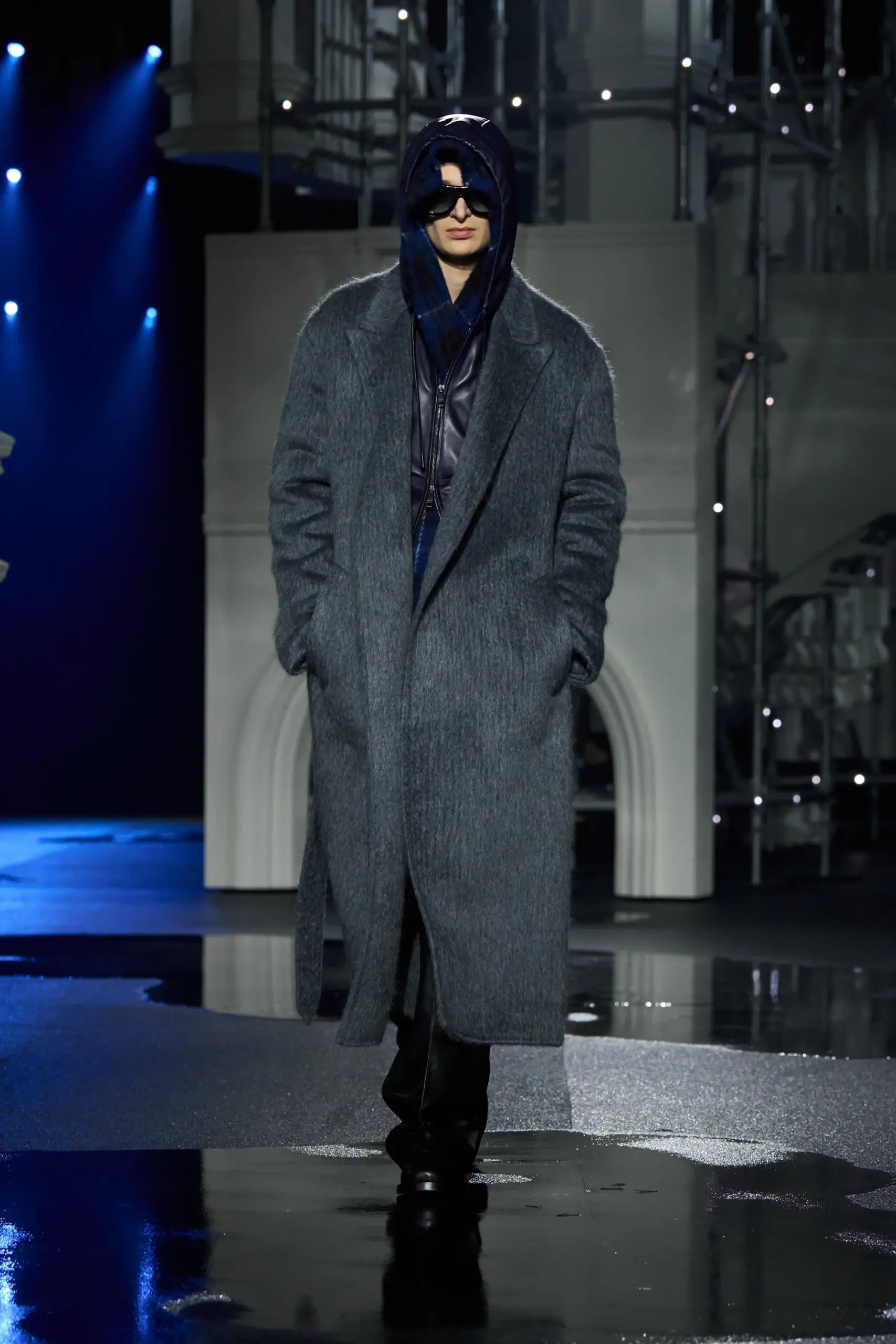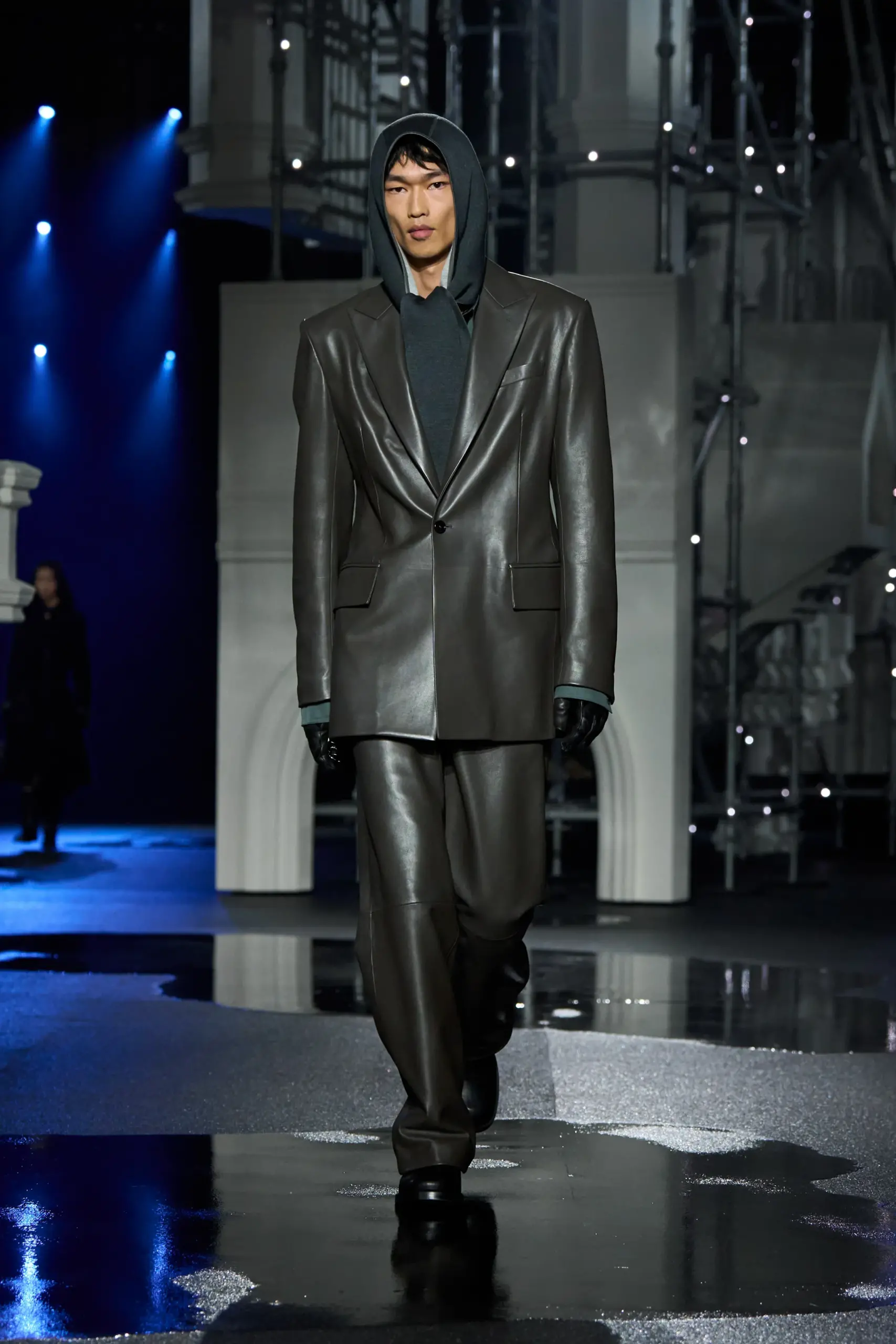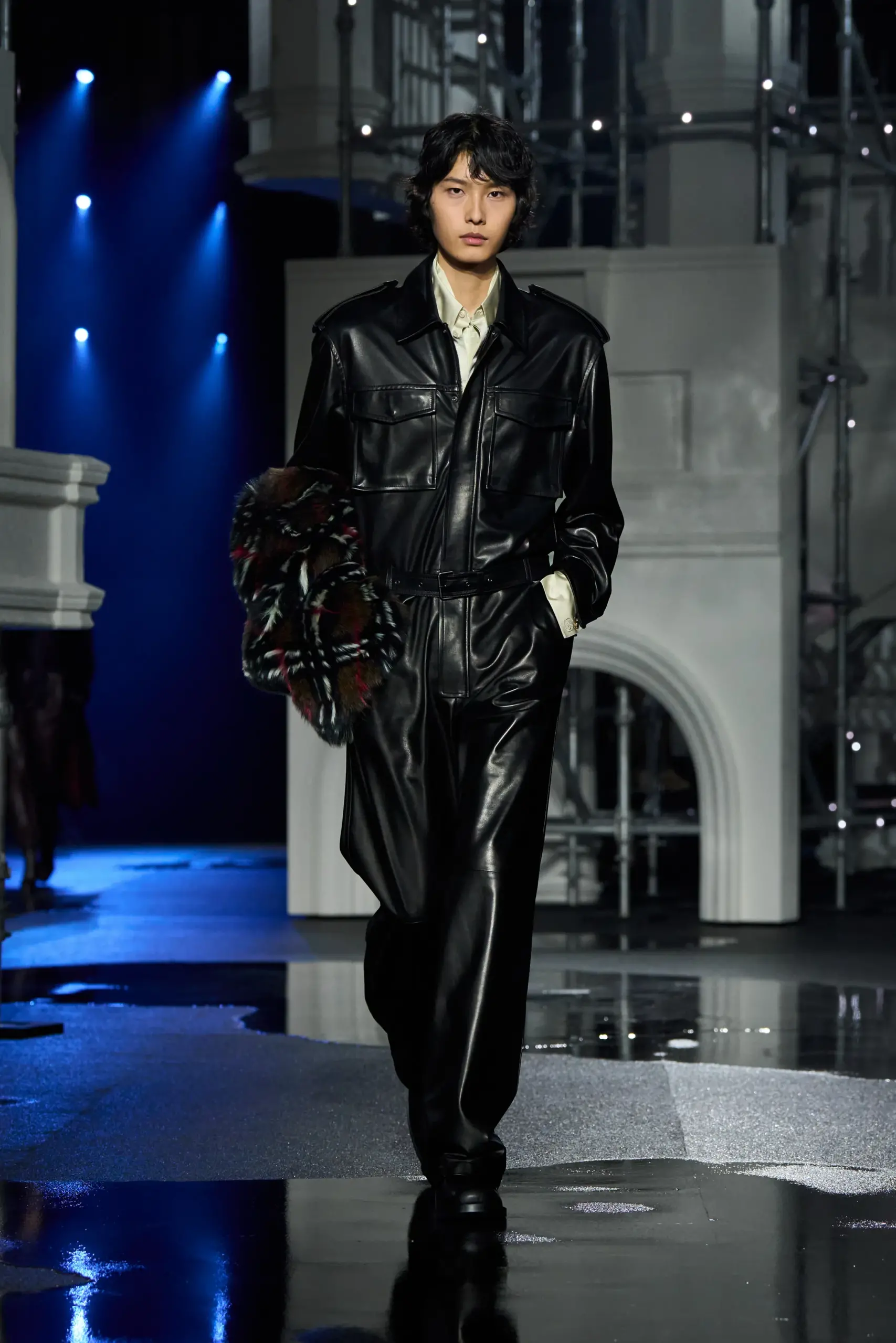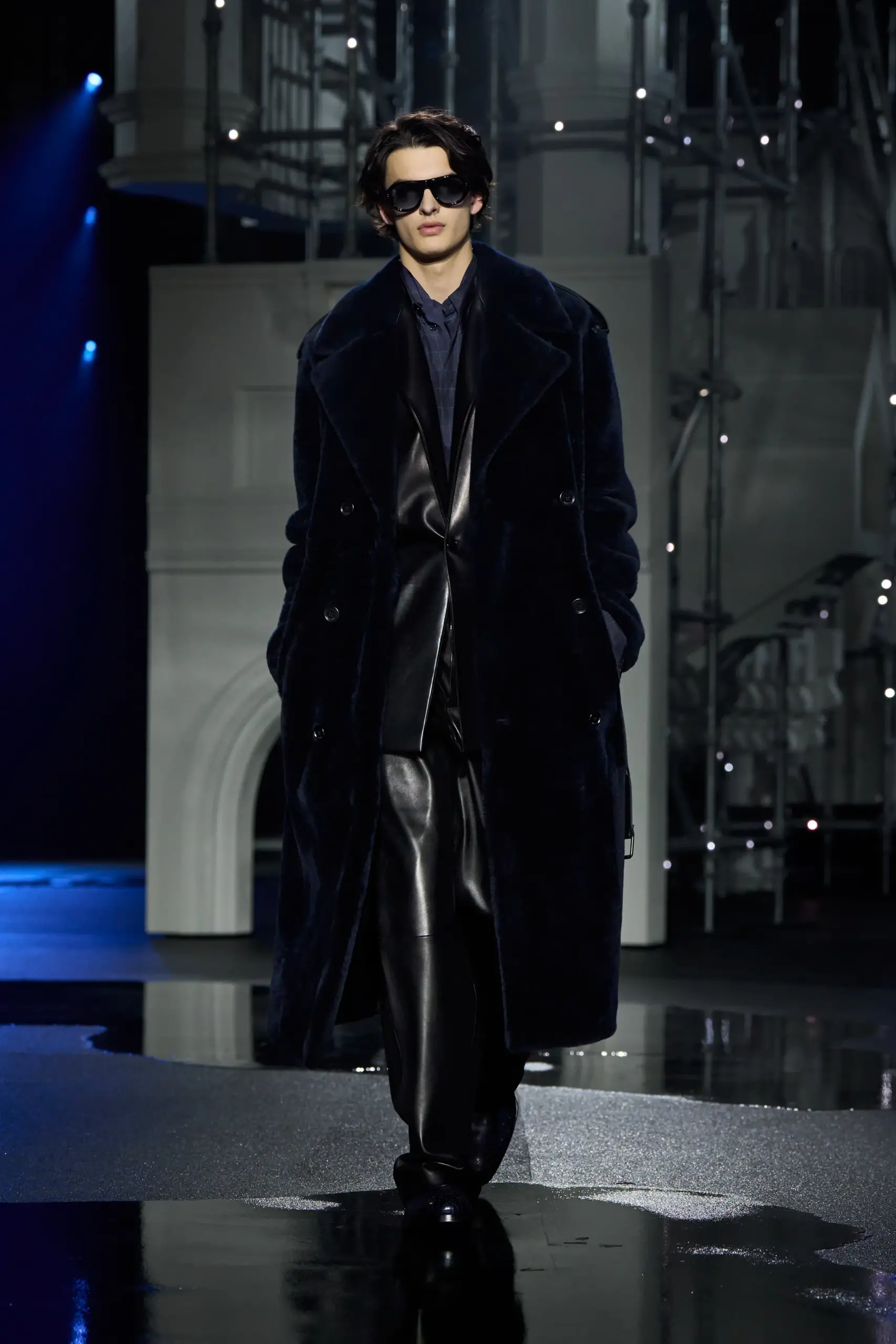 Ngoài trenchcoat, Lee còn giới thiệu loạt thiết kế “chống chọi thời tiết” khác như váy kilt da mềm mịn, bomber phối quần tracksuit ôm dáng, cùng những mẫu áo khoác dạ sắc sảo với ve áo hoặc cổ dựng bằng da, mang hơi hướm quân đội.