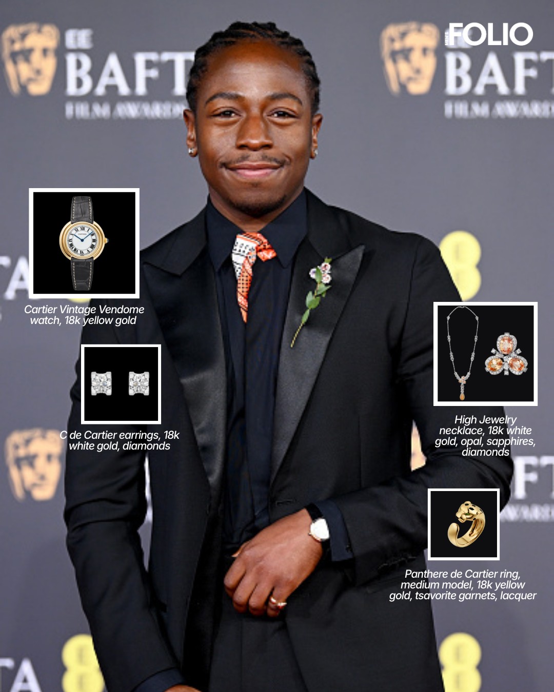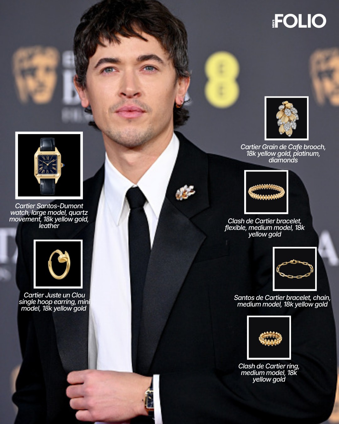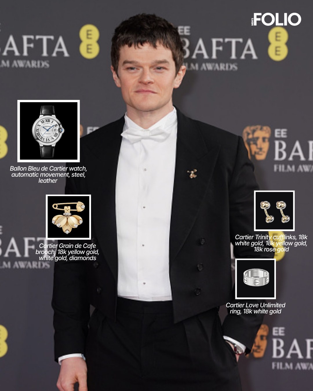 Paul Mescal lựa chọn các thiết kế Reflection de Cartier, Juste un Clou và đồng hồ Tank Basculante từ bộ sưu tập lưu trữ. David Jonsson nổi bật với trang sức High Jewelry cùng đồng hồ Vendome vintage và nhẫn Panthère de Cartier. Chiến thắng hai hạng mục quan trọng, Robert Aramayo tạo điểm nhấn với trâm cài Grain de Café và đồng hồ Ballon Bleu de Cartier. Tom Blyth và Harry Lawtey hoàn thiện diện mạo bằng các thiết kế biểu tượng như Santos Dumont và Tank Américaine.