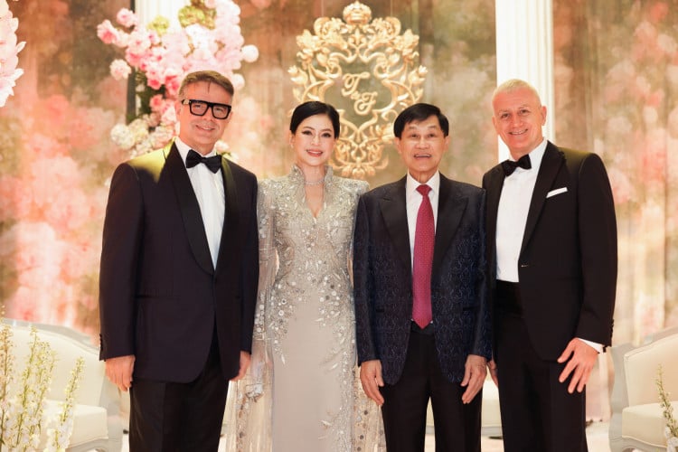Vợ chồng tỷ phú Johnathan Hạnh Nguyễn và phu nhân Thuỷ Tiên chụp ảnh cùng ông Laurent Negrin (Giám đốc kinh doanh toàn cầu của Stefano Ricci) và Ông Michele D’Ercole (Chủ tịch Phòng thương mại Ý tại Việt Nam)