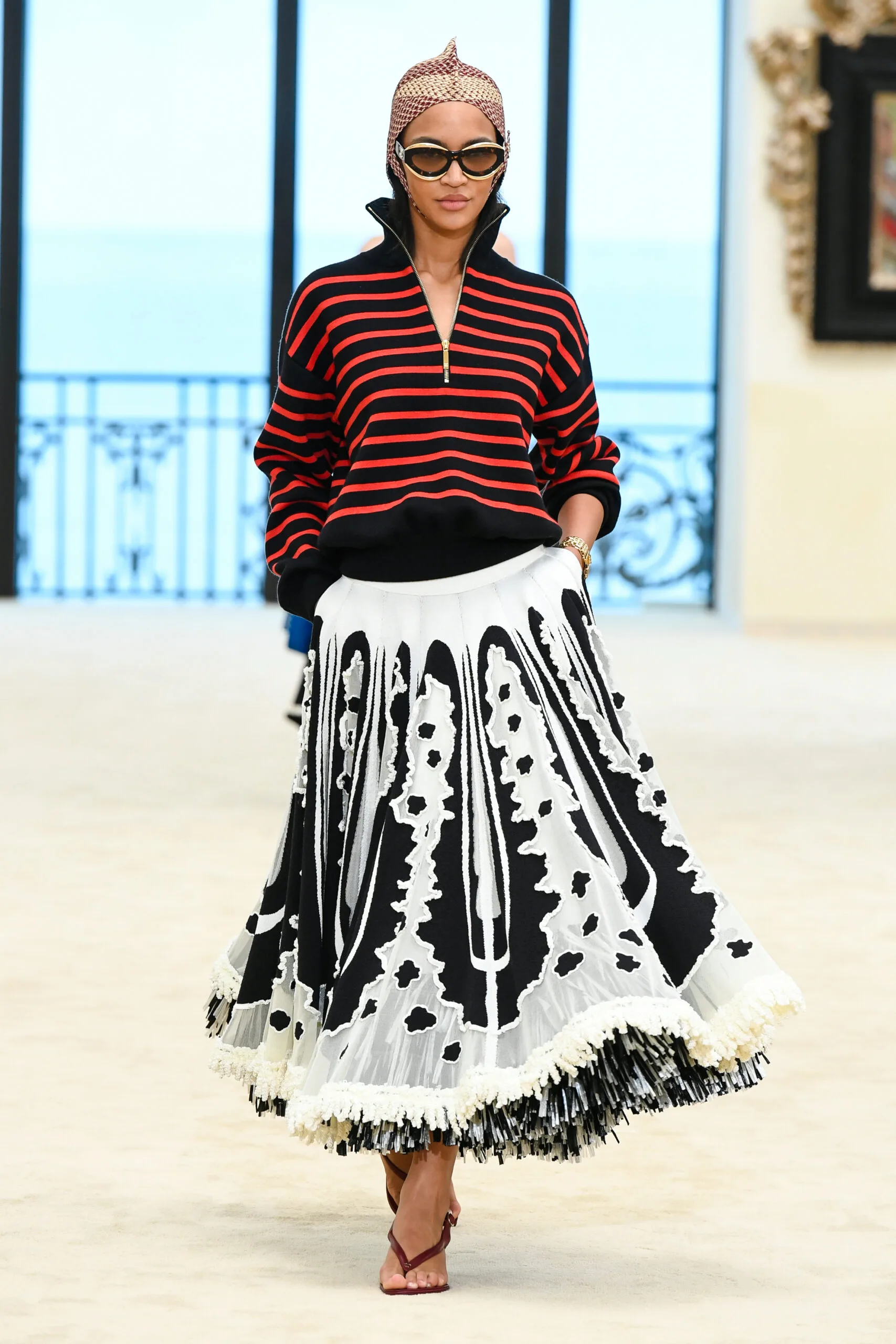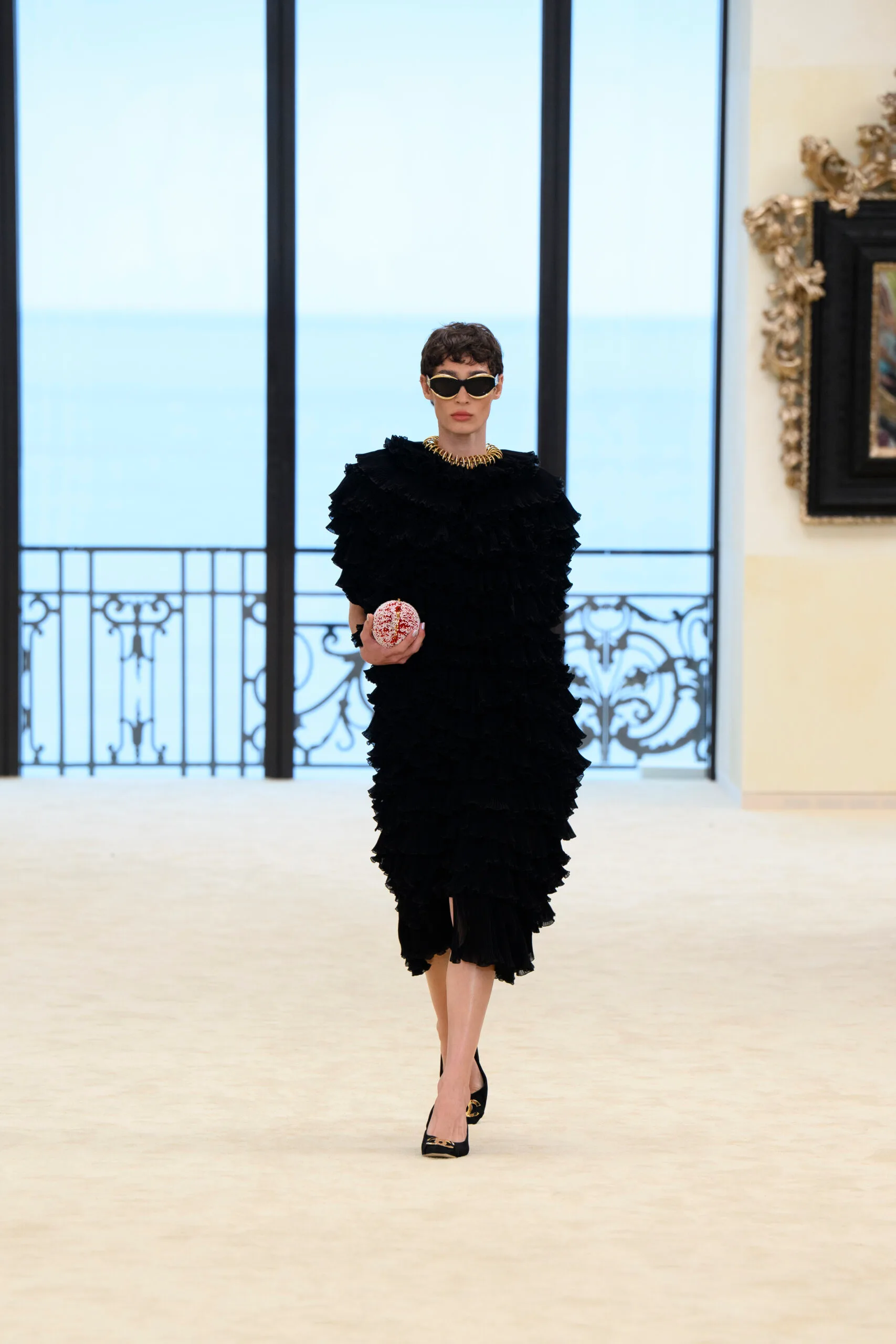 Hơn một thế kỷ sau, Matthieu Blazy quay lại đúng địa điểm ấy cho bộ sưu tập Cruise 2027, không phải một sự hoài niệm, mà như một hành động mang tính chiến lược. Trong không gian salon phủ gương vươn ra biển, nơi đường chân trời trở thành phông nền, show diễn được dàn dựng như một chuyển động liên tục giữa hai thế giới: Nội thất couture và ngoại cảnh tự nhiên.