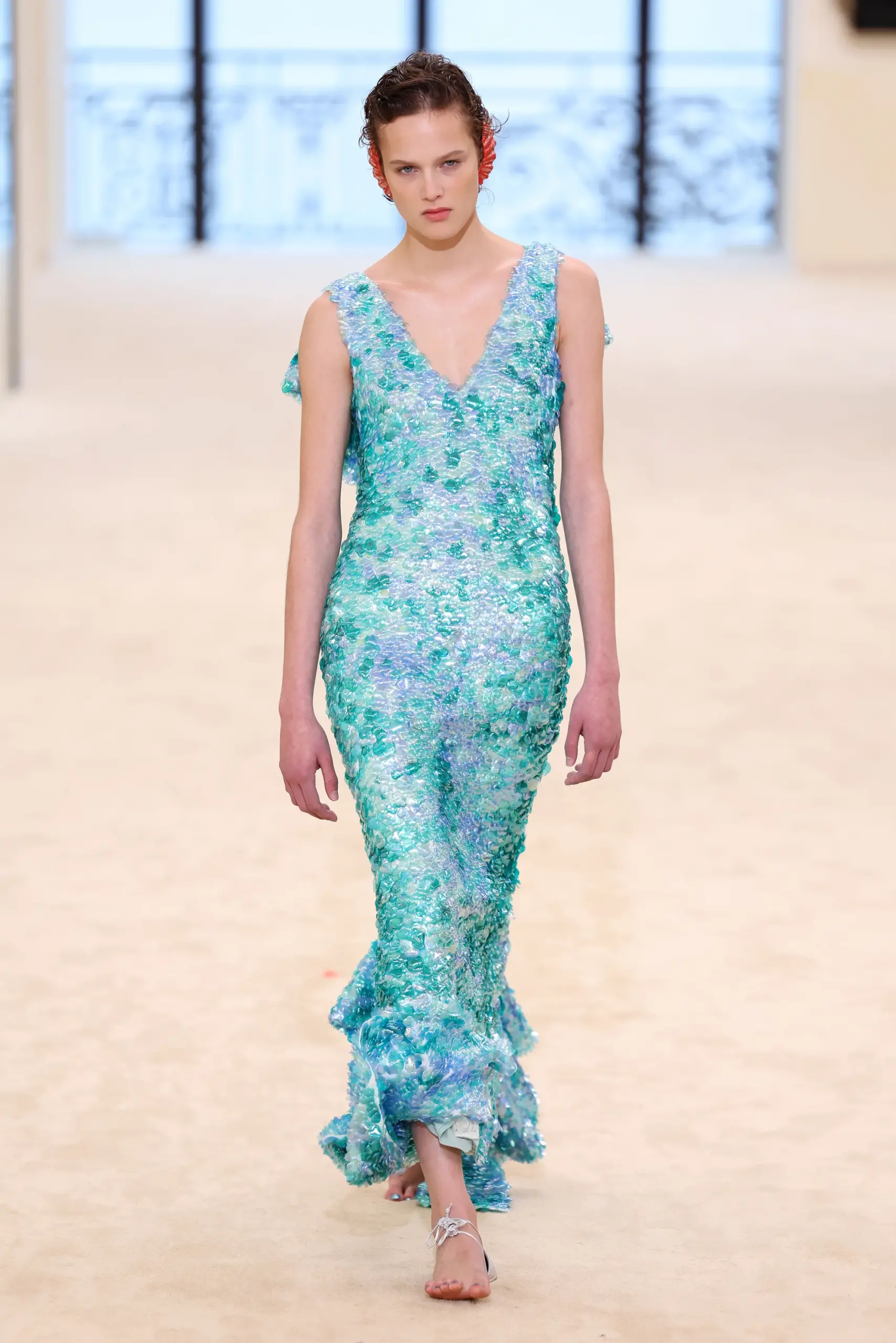 Khi show diễn dần đến đoạn kết, yếu tố mộng tưởng bắt đầu lấn át tâm trí người xem. Gam màu trên trang phục chuyển sang tông màu san hô và xanh ngọc. Sequin phản chiếu ánh sáng như mặt nước. Người mẫu đi chân trần, tóc ẩm, như vừa bước ra từ biển cả. Hình tượng nàng tiên cá được Blazy giới thiệu trước buổi diện không xuất hiện như một motif trang trí, mà như một lớp nghĩa mới cho Chanel: Một huyền thoại đang được viết lại, gắn với biển, với chuyển động và với cảm xúc nguyên sơ.