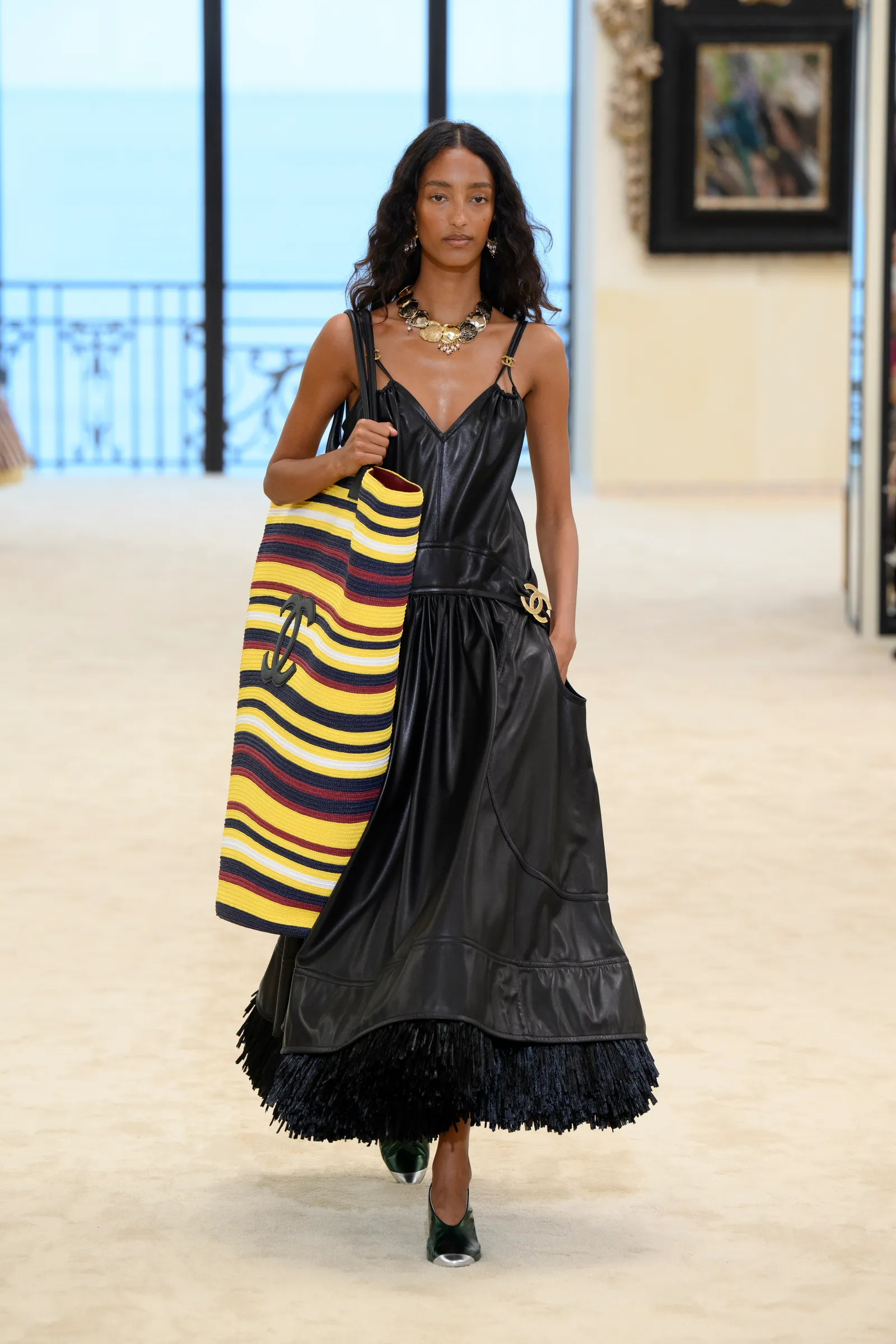Điểm then chốt nằm ở việc anh phá vỡ các ranh giới quen thuộc. Không còn sự phân chia giữa trang phục đi biển, đồ công sở hay trang phục dạ tiệc – Tất cả được đặt chung và kết nối lẫn nhau. Một chiếc váy đen có thể đi cùng túi beach bag bằng vải terry và túi tote. Đồ bơi len lỏi vào trang phục ban ngày. Tweed – Chất liệu biểu tượng của Chanel – được nới lỏng, kẻ sọc Basque, phối cùng kính bơi và mũ swim cap.
