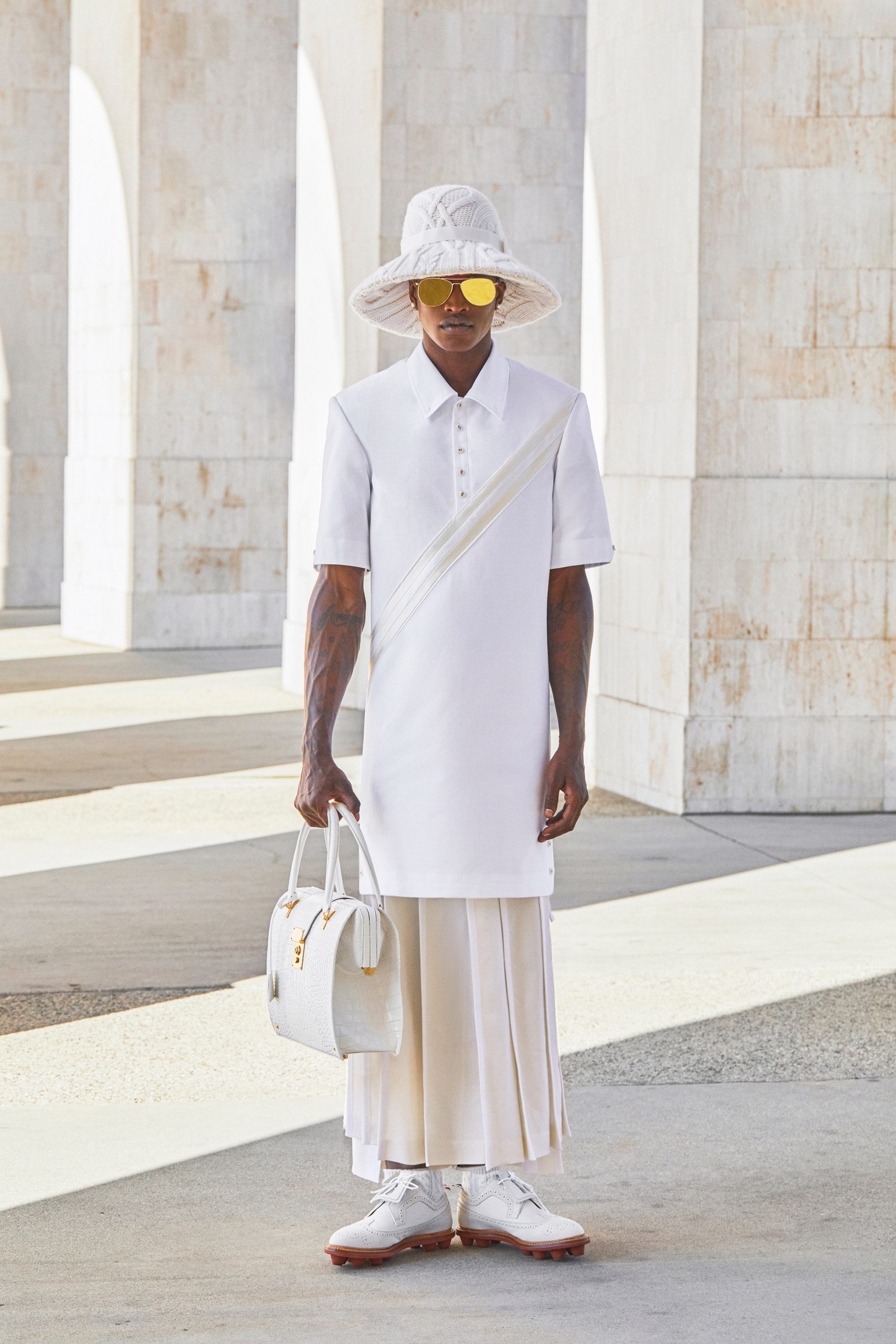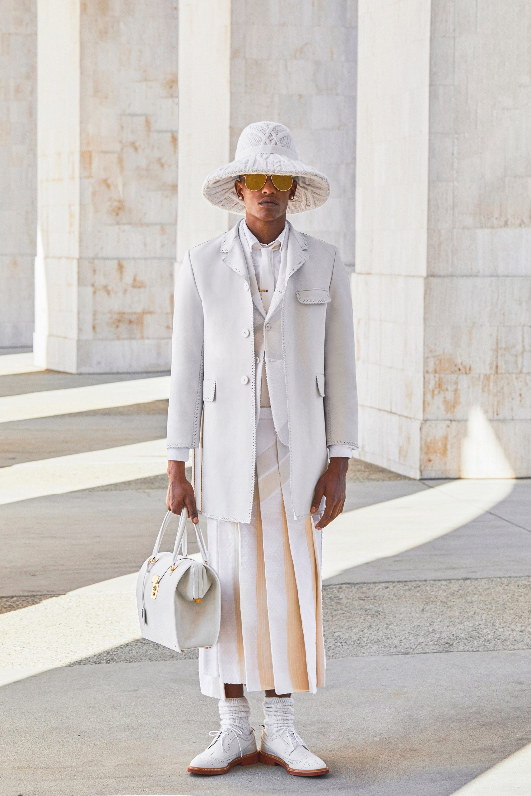 Thật khó để ngưng nghĩ về sự ngọt ngào thuần túy từ show diễn của Thom Browne tại một sân vận động vắng vẻ ở Los Angeles. Đó là một niềm vui đơn giản đến nhức nhối, giống như một chiếc bánh ngọt hoàn hảo, đắt tiền với một cái tên vui nhộn. Có vẻ như Browne đã tìm thấy một sự rõ ràng trong xu hướng lưỡng tính của mình. Trong nhiều năm qua, các bộ sưu tập của Browne đã luôn đánh vào các điểm bất cập về nam giới trong thời trang: những con người bảo thủ trở nên tức giận hay thô bạo khi thấy nam giới diện váy hay đầm, như thể lý do duy nhất của việc mặc quần áo là để trông “ổn”. Thật buồn cười và đáng buồn khi con người ngày nay vẫn nghĩ về thời trang với cùng một thái độ, như thể việc trông đẹp, lạ hoặc hài hước là vô đạo đức. Nhưng qua đôi mắt nhìn của Browne, chúng trở nên lay động lòng người.