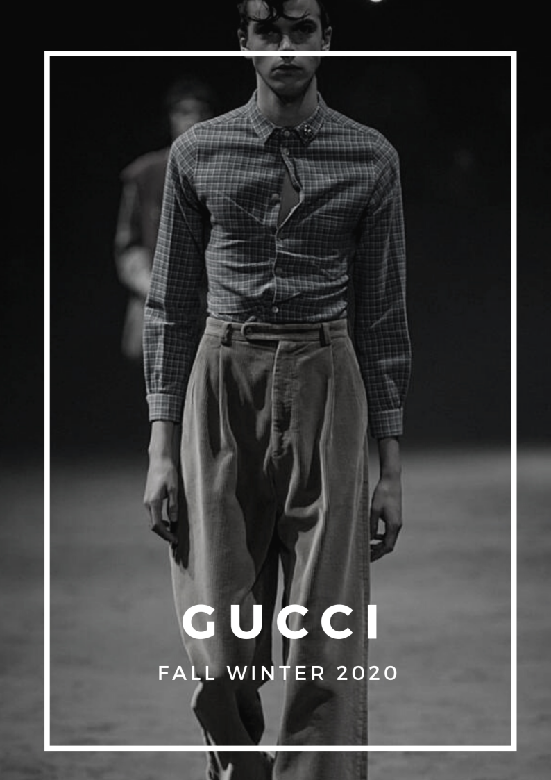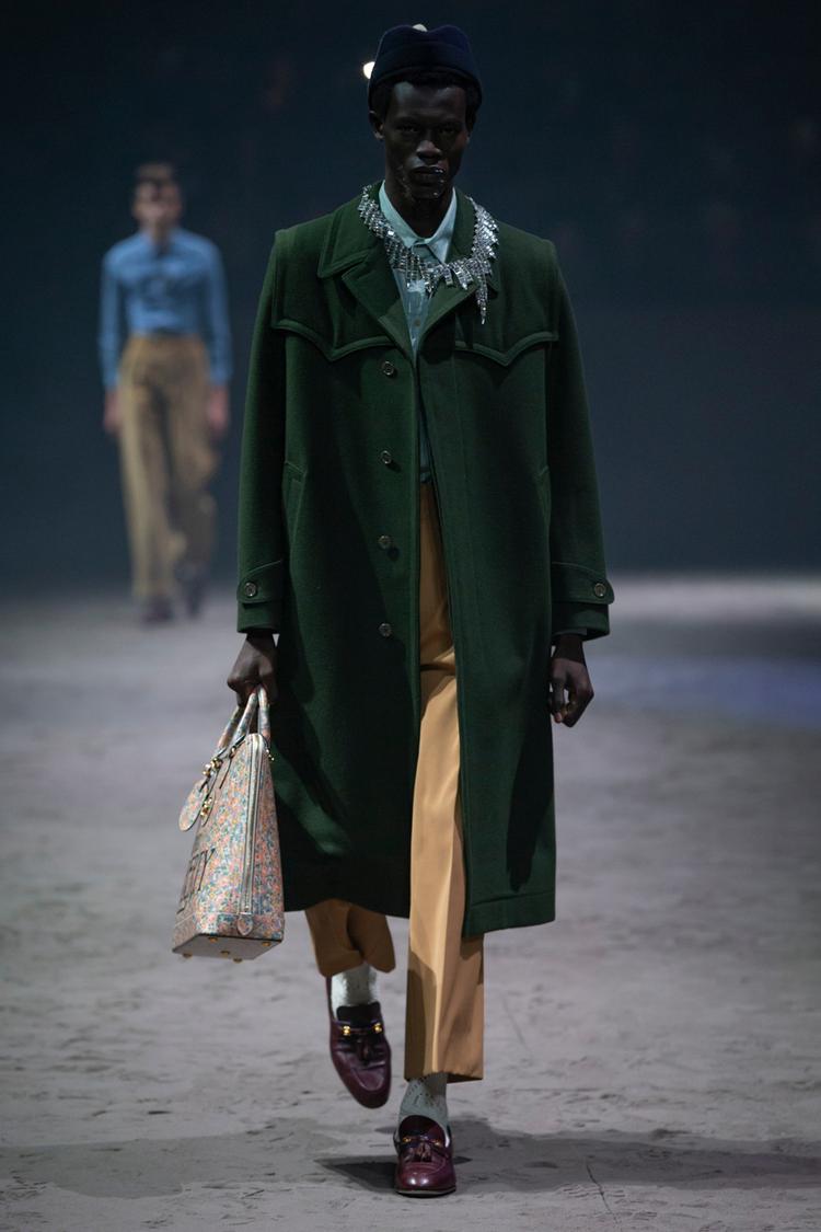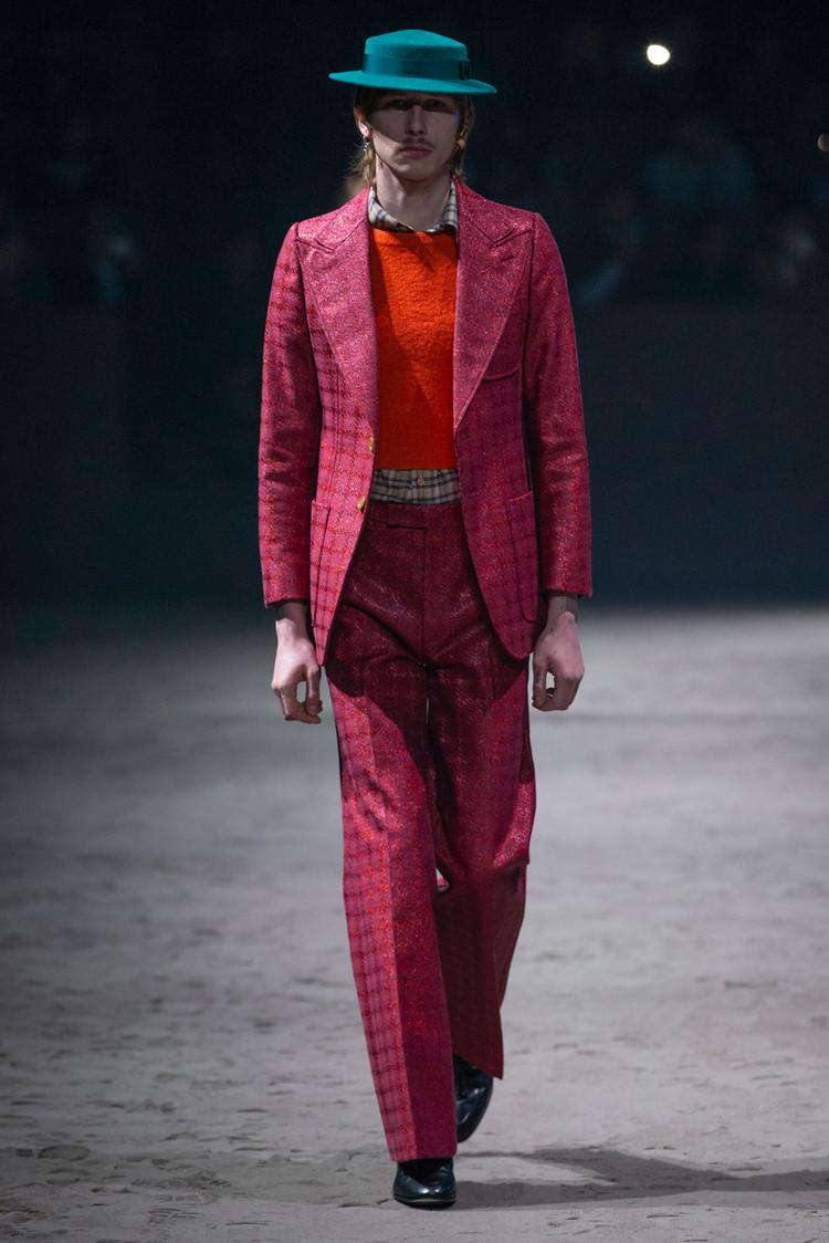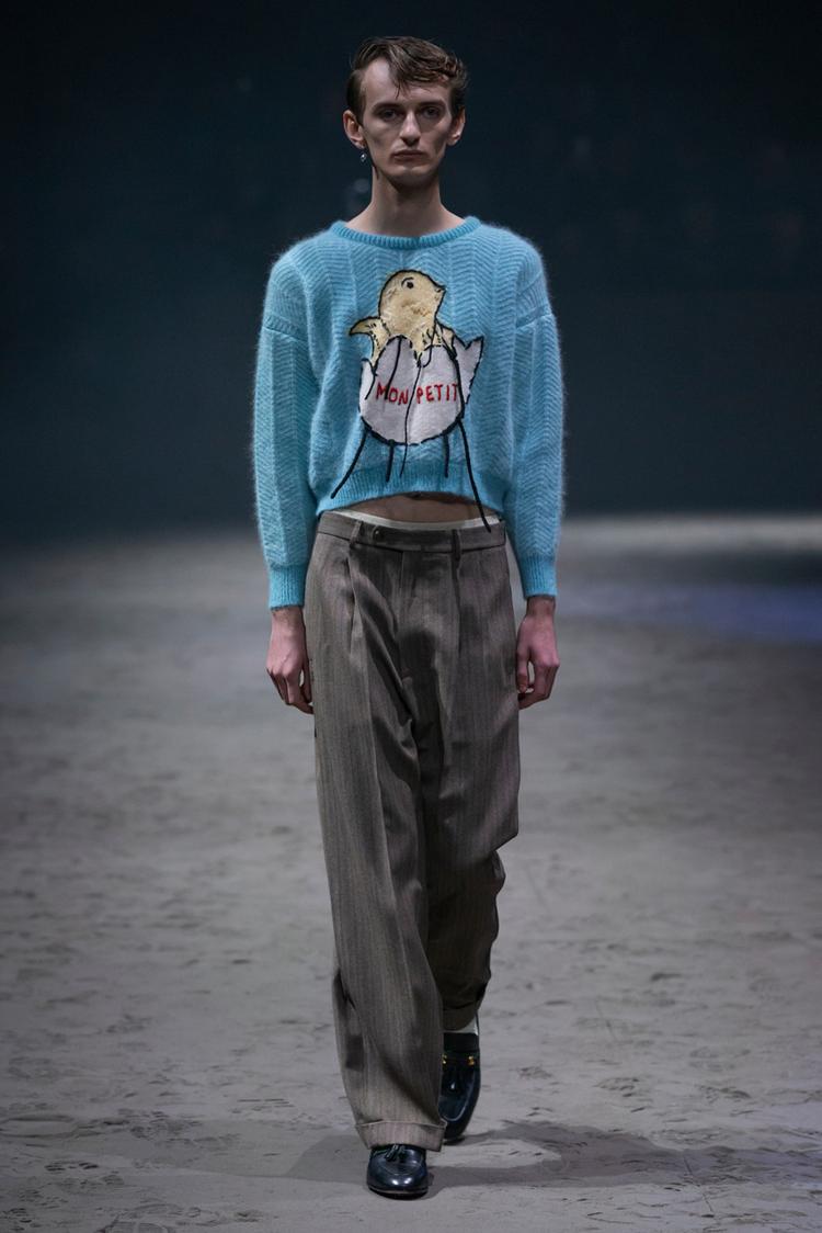 Kỷ niệm cho năm thứ năm gắn bó của Alessandro Michele, Gucci đã tổ chức show diễn menswear đầu tiên kể từ năm 2017 vào tháng 1 năm nay. Trên sàn diễn cát với con lắc làm trung tâm, các thiết kế độc đáo hàm chứa ý nghĩa sâu xa về ý niệm linh hoạt giới, phá bỏ những quy tắc về sự nam tính độc hại, cũ kỹ mà xã hội đặt ra cho phái mạnh. Nổi bật trong đó là một loạt các mẫu váy búp bê, kết hợp với quần jeans rách và quần tây xám, áo len xù lông màu xanh hồng mềm mại, áo crop top và rất nhiều quần áo rực rỡ. Michele miêu tả ý tưởng về những chàng trai trung học đáng yêu, trẻ con và tốt bụng, khi mà sự nam tính độc hại không được phép xuất hiện. Đây chính là sự cấp tiến trong tư duy: đã đến lúc người đàn ông được tự do khỏi những ràng buộc xã hội và các hình mẫu cứng nhắc.