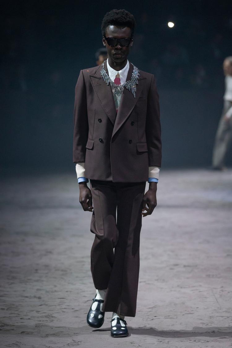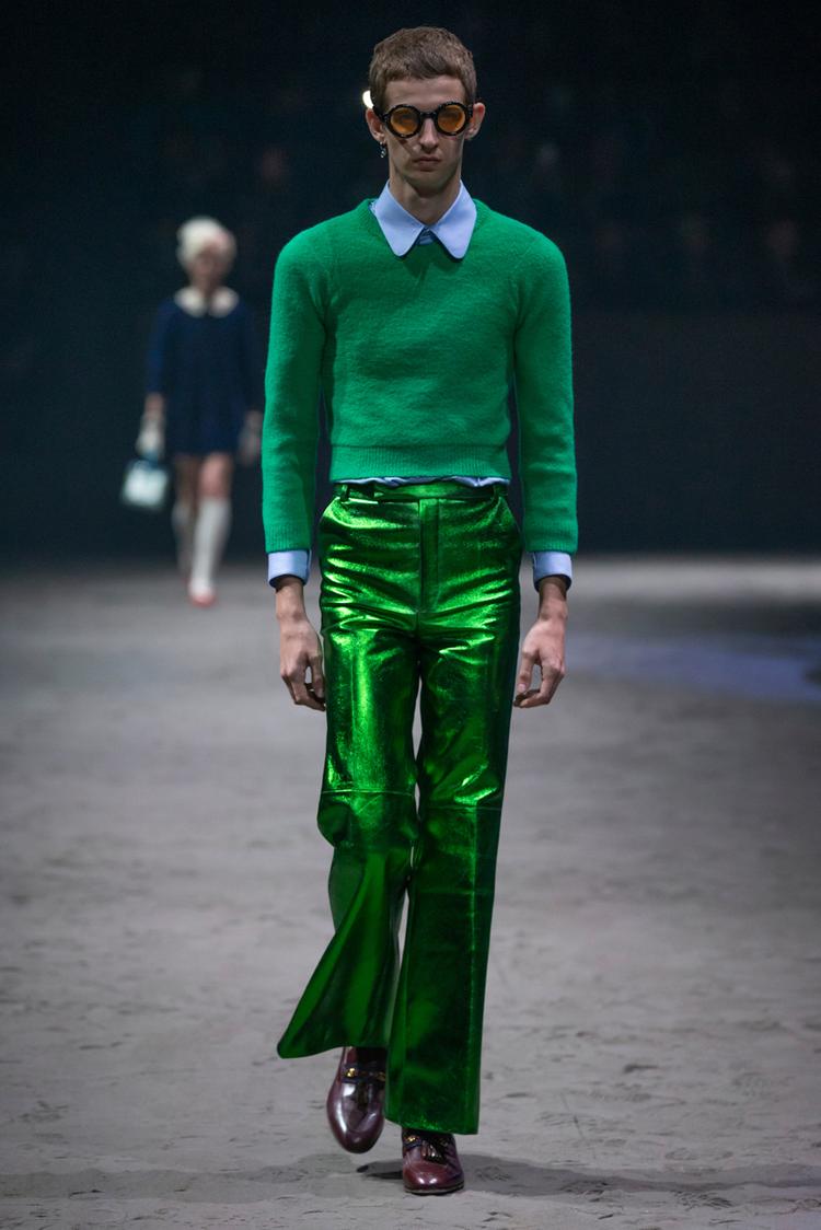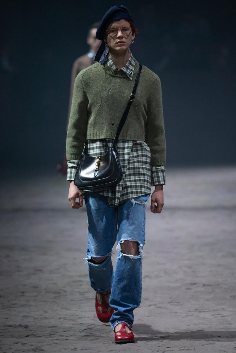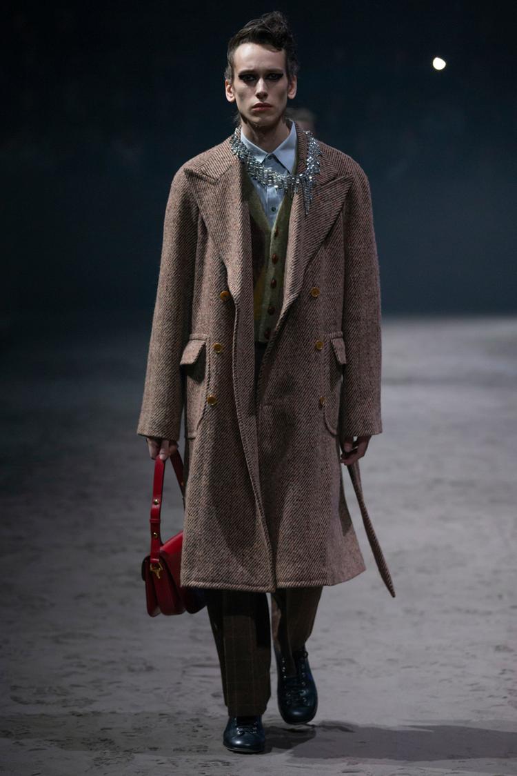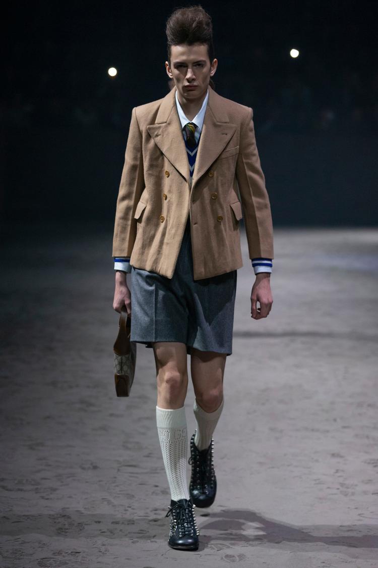 Kỷ niệm cho năm thứ năm gắn bó của Alessandro Michele, Gucci đã tổ chức show diễn menswear đầu tiên kể từ năm 2017 vào tháng 1 năm nay. Trên sàn diễn cát với con lắc làm trung tâm, các thiết kế độc đáo hàm chứa ý nghĩa sâu xa về ý niệm linh hoạt giới, phá bỏ những quy tắc về sự nam tính độc hại, cũ kỹ mà xã hội đặt ra cho phái mạnh. Nổi bật trong đó là một loạt các mẫu váy búp bê, kết hợp với quần jeans rách và quần tây xám, áo len xù lông màu xanh hồng mềm mại, áo crop top và rất nhiều quần áo rực rỡ. Michele miêu tả ý tưởng về những chàng trai trung học đáng yêu, trẻ con và tốt bụng, khi mà sự nam tính độc hại không được phép xuất hiện. Đây chính là sự cấp tiến trong tư duy: đã đến lúc người đàn ông được tự do khỏi những ràng buộc xã hội và các hình mẫu cứng nhắc.