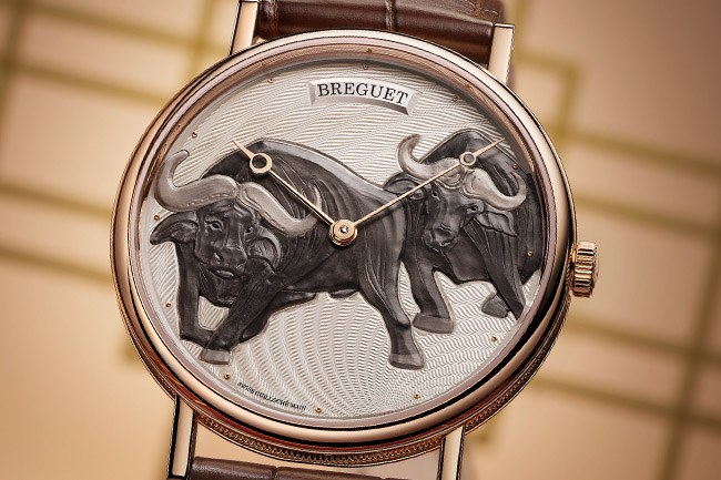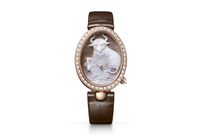 Breguet Reine de Naples phiên bản giới hạn 8 chiếc được tạo ra nhằm bày tỏ lòng tôn kính đối với loài trâu, linh vật đứng thứ 2 trong 12 con giáp. Theo đó, hình tượng con trâu được thể hiện một cách điềm tĩnh nhờ nghệ thuật chạm khắc đơn sắc trắng và nâu, đồng thời nổi bật với chất liệu vàng hồng cùng kim cương.