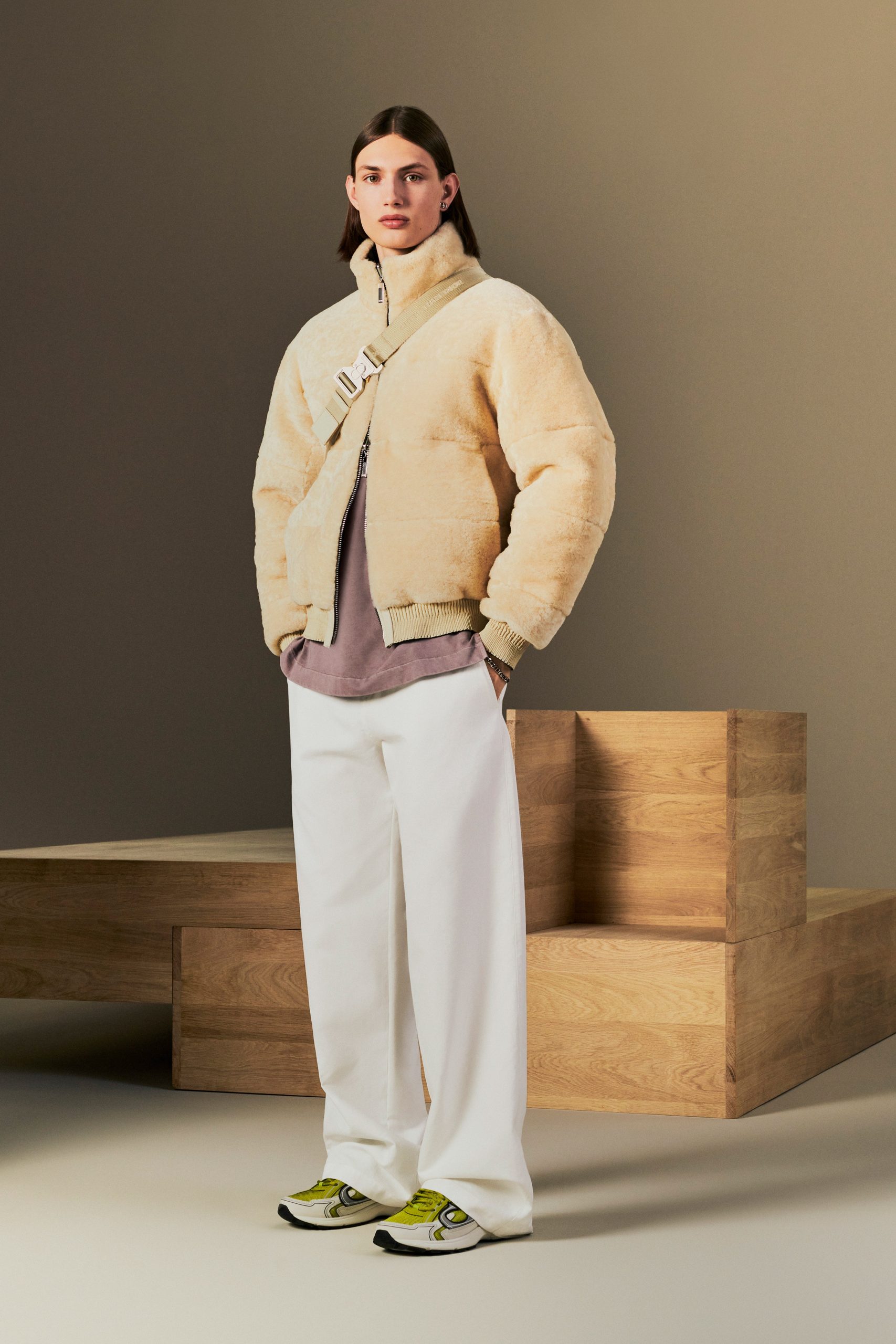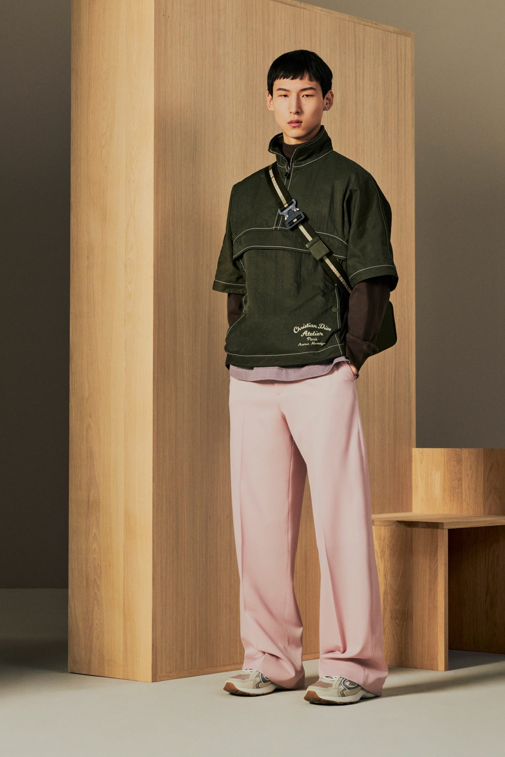Đúng với tinh thần thư thả, bộ sưu tập Dior Men Resort 2022 tựa như vườn đào ngày xuân dịu mắt với những gam màu thiên nhiên – nâu, be, xanh lá đậm và hồng phấn. Nổi tiếng với những đường may chỉn chu trong thời trang may đo, song đến với Resort 2022, Kim Jones không quên nới rộng phom dáng, từ những thiết kế áo khoác phồng (puffer coat) đến quần dài kín gót. Các thiết kế mang phong cách loungewear nhưng được gia công theo chất lượng may đo hiện đại, vốn dĩ là dấu ấn mà vị giám đốc sáng tạo đang phát triển cho Dior Men. Chất liệu của bộ sưu tập đa dạng, từ cotton, lụa đến len dệt kim, shearling, da chần bông và nylon giữ ấm.