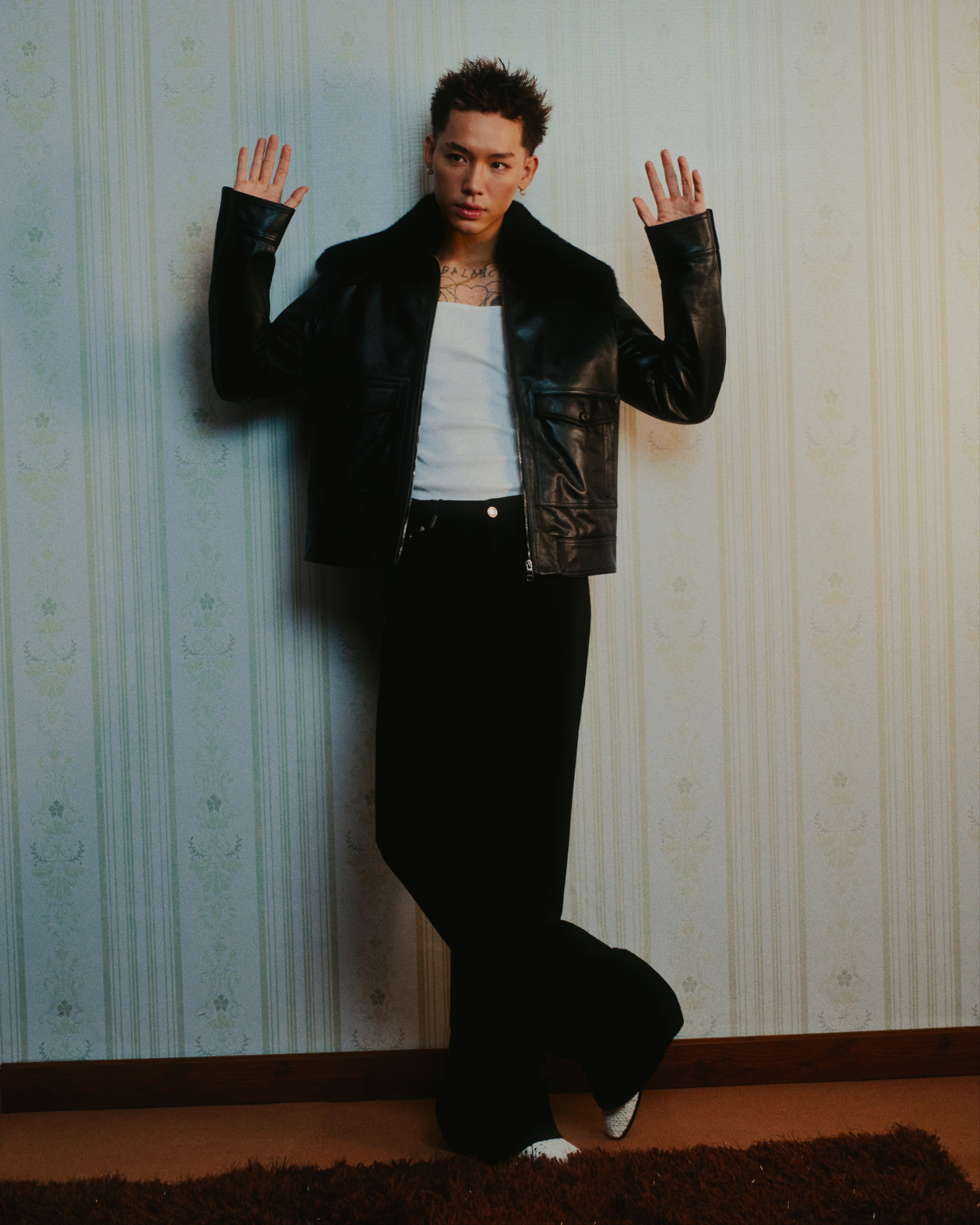 Trong bộ hình, tinh thần Sartorial được thể hiện qua nhiều lớp chuyển đổi từ áo tank tối giản kết hợp cùng quần trousers mang tinh thần thư giãn đến áo khoác da và tailoring jacket thể hiện sự kiểm soát và cấu trúc và những set phối hoàn chỉnh cân bằng giữa casual và formal.