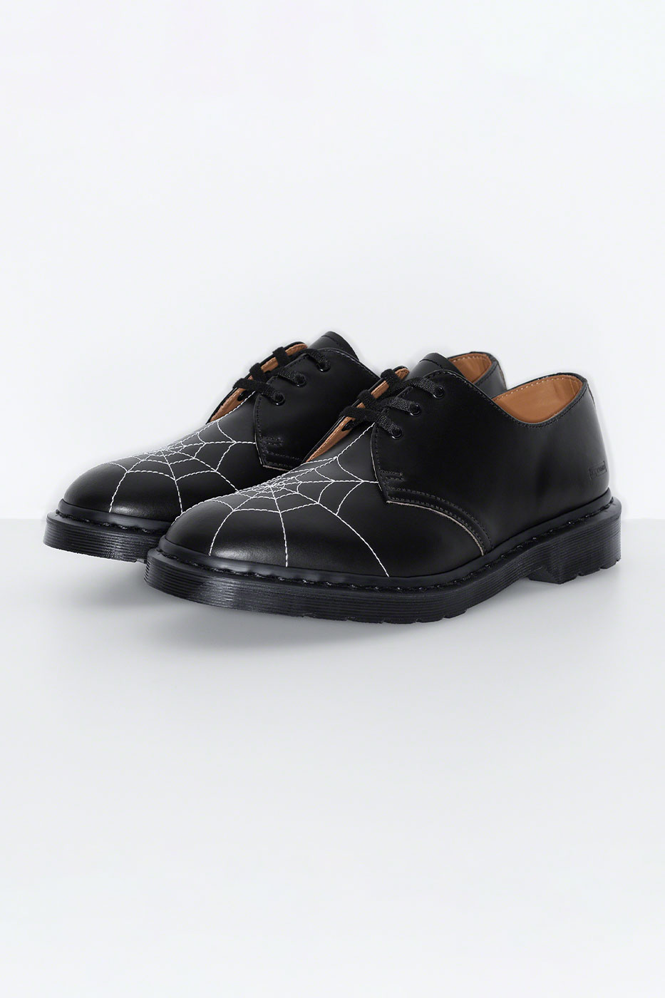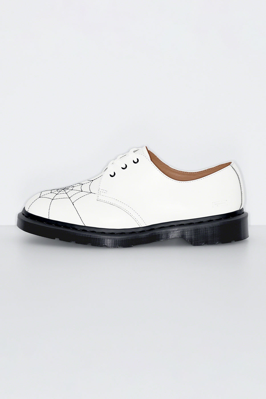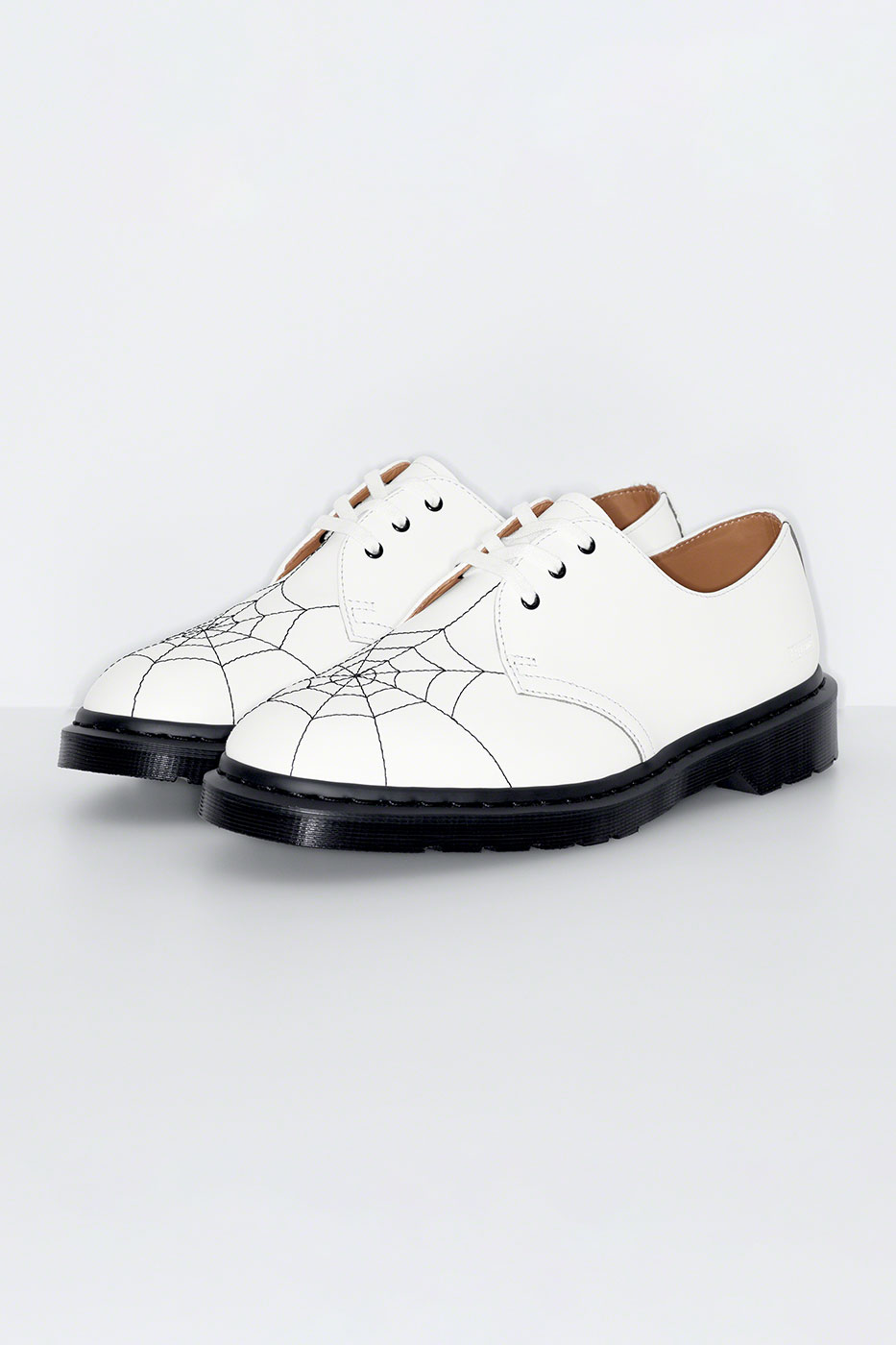Phong cách giày oxford mang tính biểu tượng của Dr. Martens được mang lớp vỏ bọc từ chất liệu da trơn cổ điển, ở trên mũi là hình ảnh mạng nhện thêu để tạo điểm nhấn tương phản.