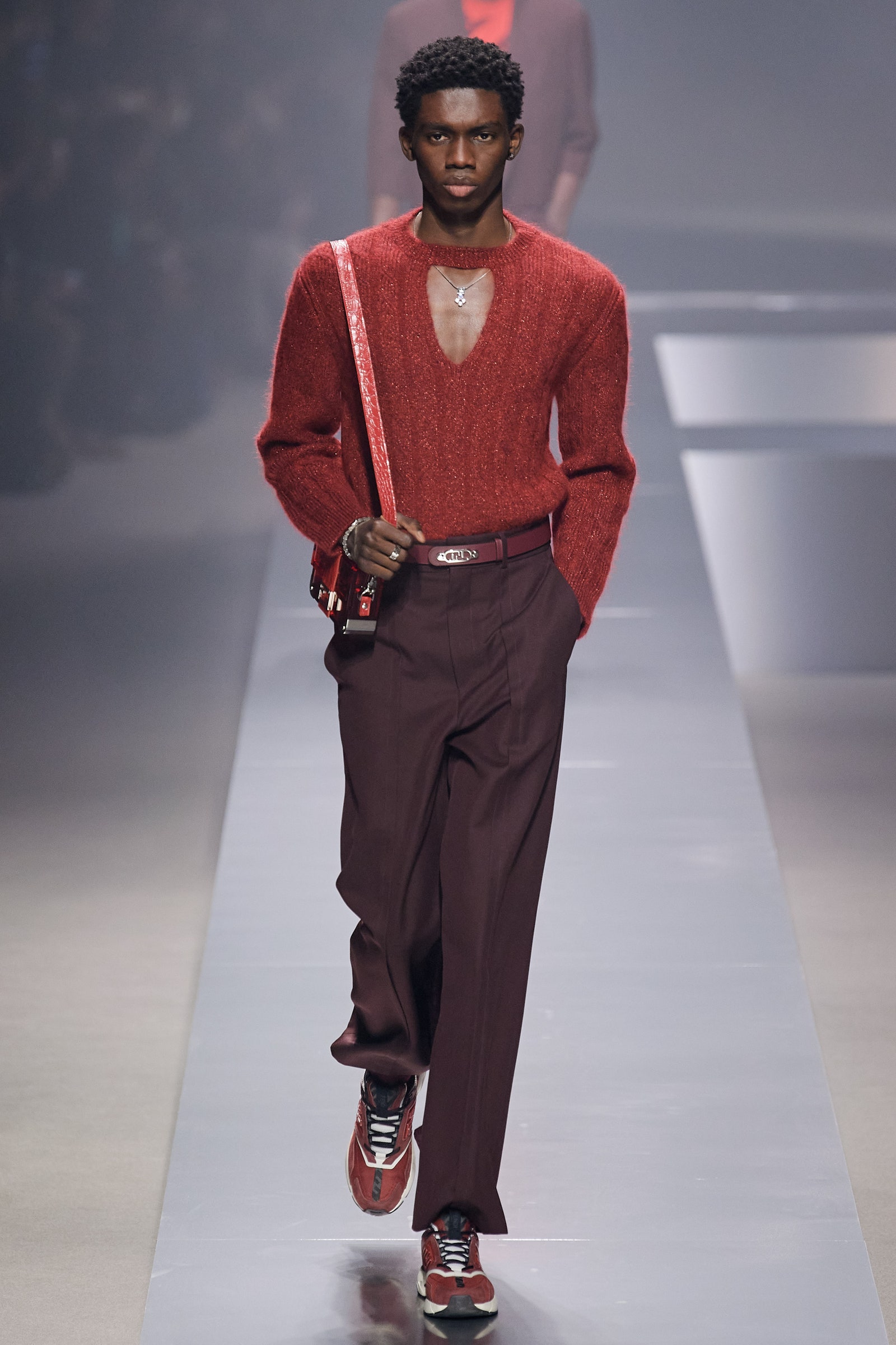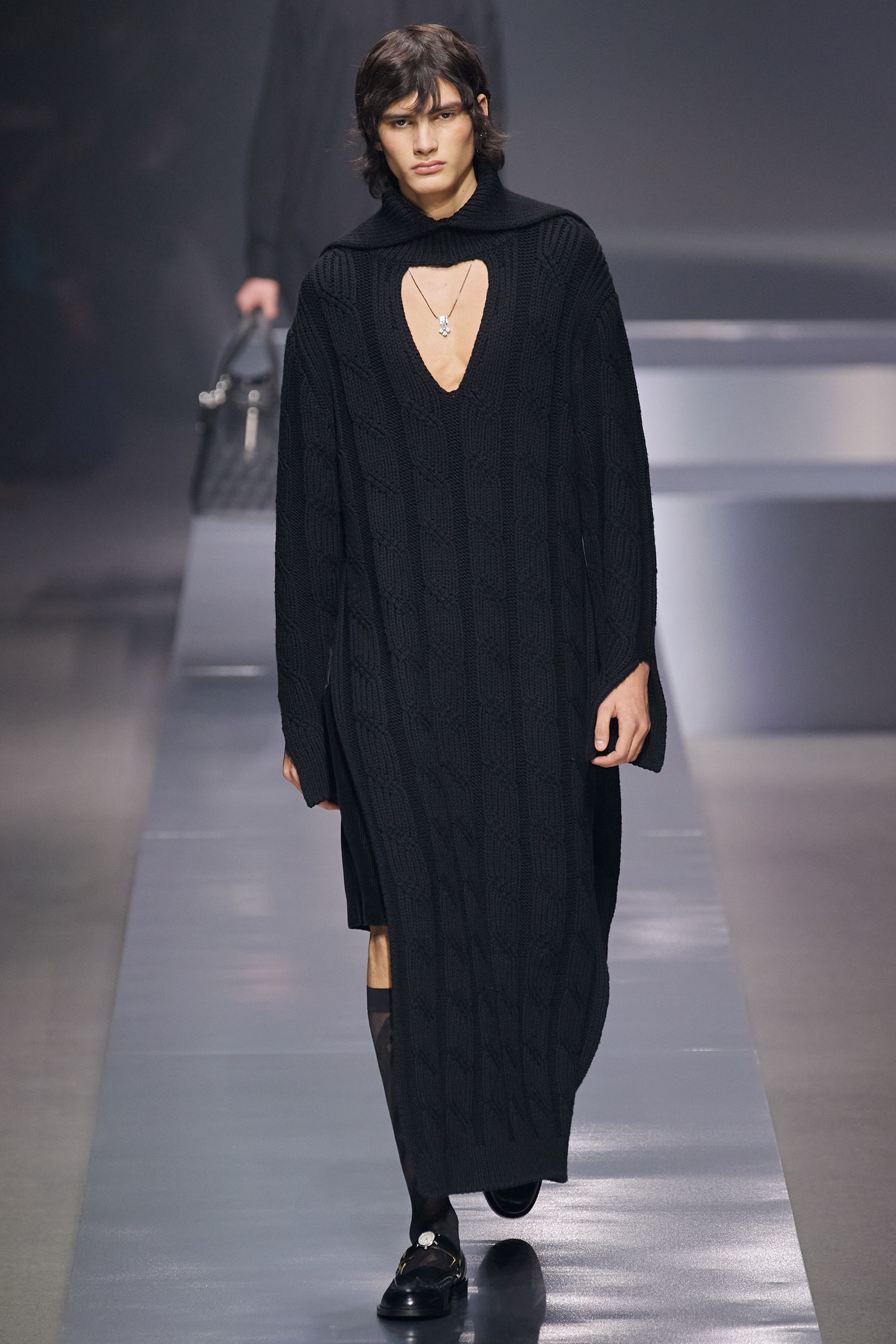 Thiết kế áo dệt kim được nhà mốt cắt xén với phần cổ hình chữ V, để lộ chiếc vòng cổ O’Lock được thiết kế bởi Delfina Delettrez Fendi cũng là một điểm sáng giá trong bộ sưu tập lần này.