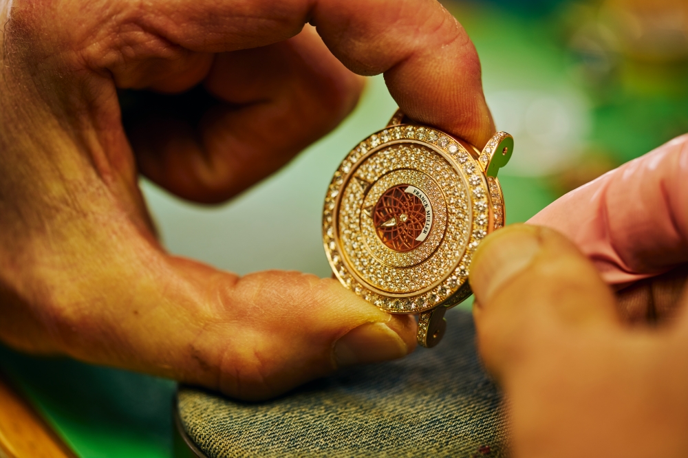 Tại bộ phận đĩa giây được tô điểm với một viên kim cương giác cắt hình tam giác hoặc đá quý với chức năng như một chỉ báo giây tinh tế. Chi tiết ấy còn mang yếu tố thẩm mỹ đầy thi vị, như đang bắt nhịp dòng chảy thời gian liên tục bằng một vẻ đẹp cuốn hút và đầy thanh nhã.