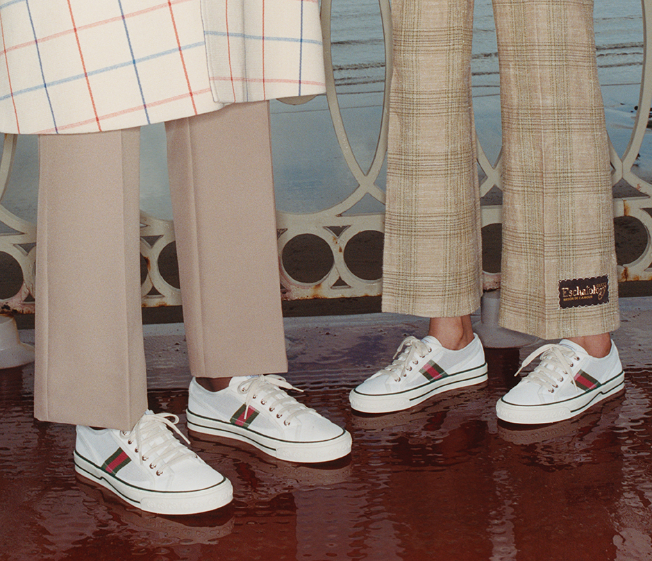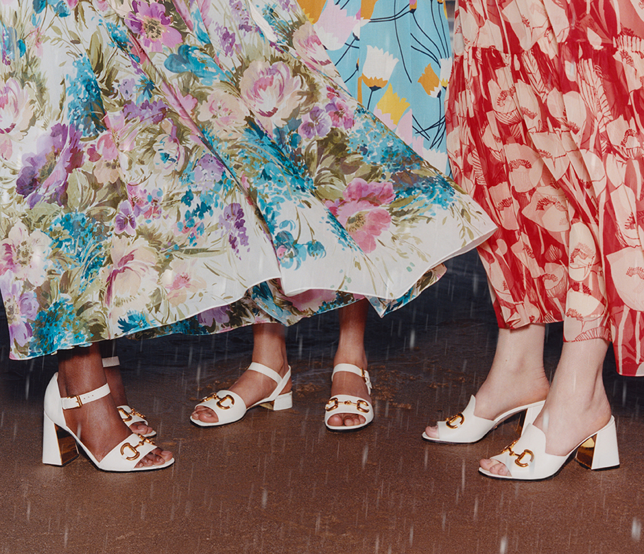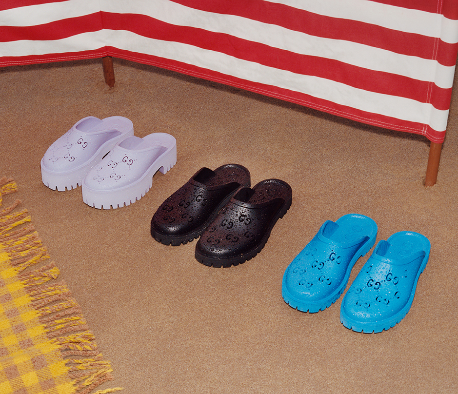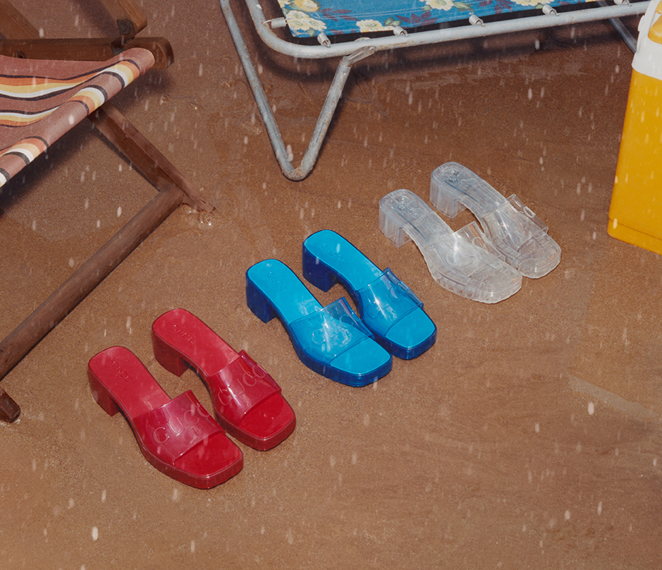 Giày thể thao Gucci Tennis 1977 với phần thân từ vải lưới, dép mule với chi tiết Gucci Horsebit ánh vàng. Riêng cho thời trang nữ, Gucci Towards The Sun còn mang đến các mẫu xăng-đan hồng, đen, trắng và từ chất liệu da dập nổi, đi kèm là dây thắt Vecro và mang biểu tượng GG được làm từ đinh tán kim loại. Các dòng xăng-đan đế dày khác cũng được giới thiệu với chi tiết Gucci Horsebit đặc trưng. Dòng xăng-đan Sylvie biểu tượng cũng kịp có mặt với chi tiết dây xích vàng cùng phần đế làm từ bần. Thiết kế được làm từ cả hai chất liệu da màu trắng và đen, như một đôi xăng-đan hai mảnh hay T-strap. Cả hai kiểu dáng đều sở hữu logo GUCCI ở phần đế trong. Dĩ nhiên không thể thiếu dòng giày lười espadrillas thông dụng những ngày đi biển. Giày được làm từ chấ t liệu da hồng và trắng, mang lại tinh thần cao cấp cho thiết kết vốn đậm chất bohemian.