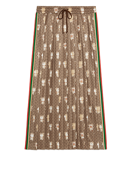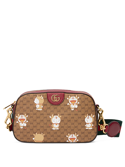 Không bất ngờ khi hình tượng chú mèo máy đáng yêu xuất hiện trên khắp các sản phẩm Gucci. Điều đặc biệt, Doraemon không chỉ mang sắc xanh kinh điển, mà còn được khoác lên lớp “áo vàng” óng ánh. Trên đầu chú là hai chiếc sừng, tượng trưng cho con giáp Tân Sửu năm mới.