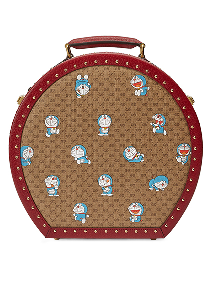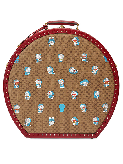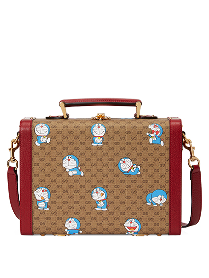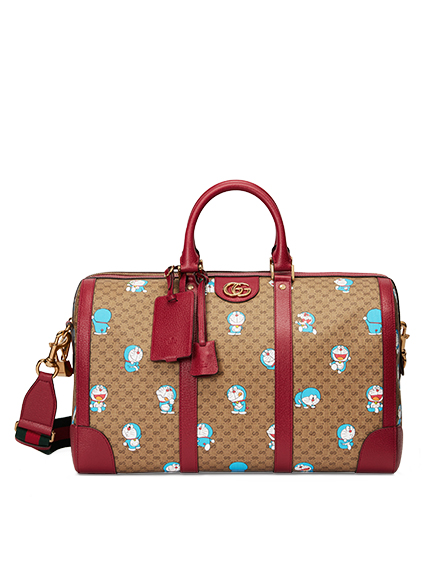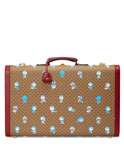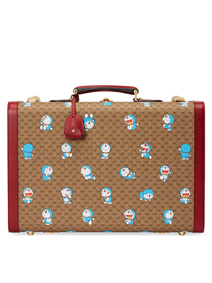 Chi tiết chung trong bộ sưu tập Gucci x Doraemon là mô-típ GG Supreme Canvas phiên bản hoàn toàn mới– chú mèo máy Doraemon trở thành linh vật, xuất hiện vô cùng sinh động trên nền hoa văn monogram kinh điển của thương hiệu. Các thiết kế giày, va li, túi xách tay, nón đều mang trên mình “lớp áo” mới này.