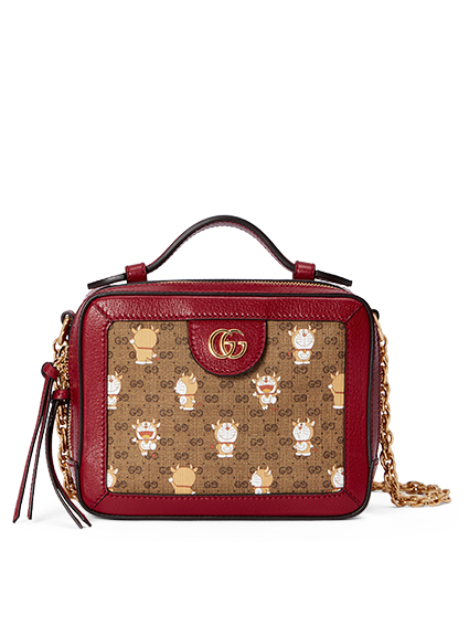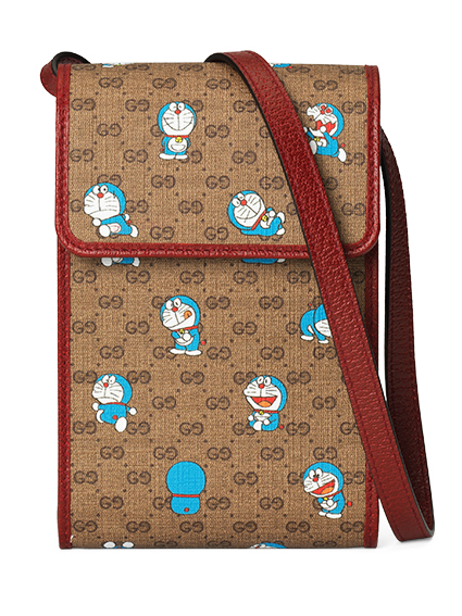 Các dòng túi xách cũng góp mặt trong bộ sưu tập lần này. Họa tiết Doraemon, trùng lặp hay đơn lẻ, đi cùng chất liệu da đỏ và GG Supreme Canvas. Ngoài ra, thương hiệu cũng kịp thiết kế một chiếc ốp lưng iPhone 11 xinh xắn. Chiếc ốp là lựa chọn phải chăng cho các bạn trẻ vốn là fan hâm mộ của Gucci cũng như Doraemon.