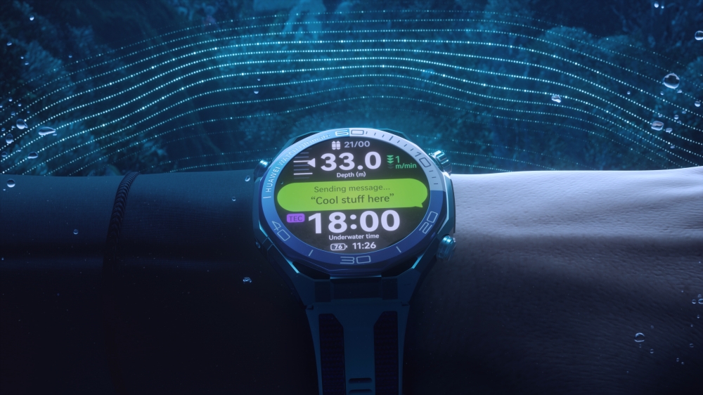 Với công nghệ sóng siêu âm độc quyền, người dùng có thể gửi tin nhắn, biểu tượng cảm xúc hoặc tín hiệu SOS đến các đồng hồ khác trong phạm vi 30 mét dưới nước. Chỉ với 3 giây nhấn giữ, tín hiệu cầu cứu sẽ được truyền đi trong phạm vi 60 mét, giúp mỗi hành trình lặn sâu trở nên an toàn hơn, để người đeo yên tâm chạm đến những giới hạn mới.