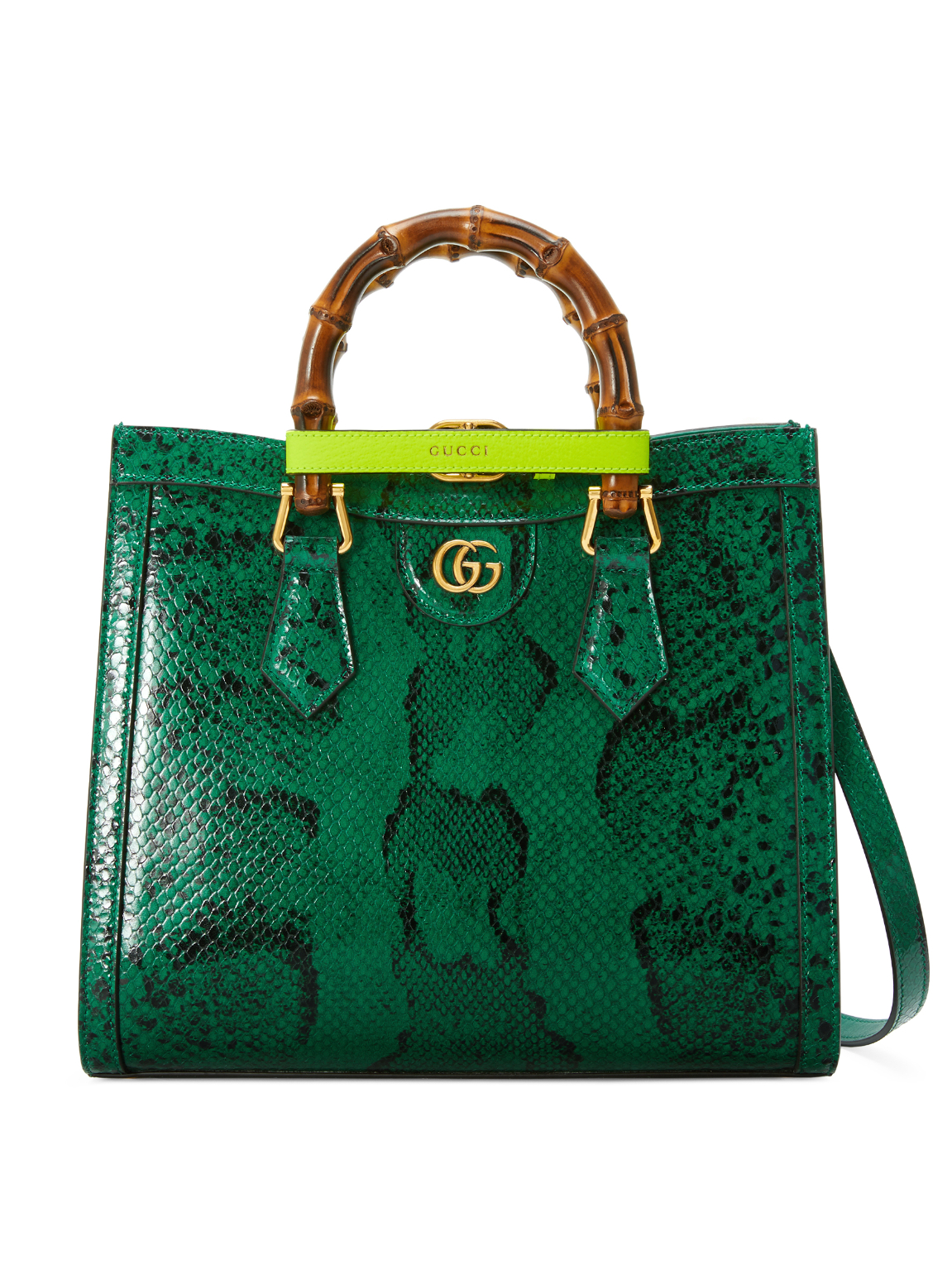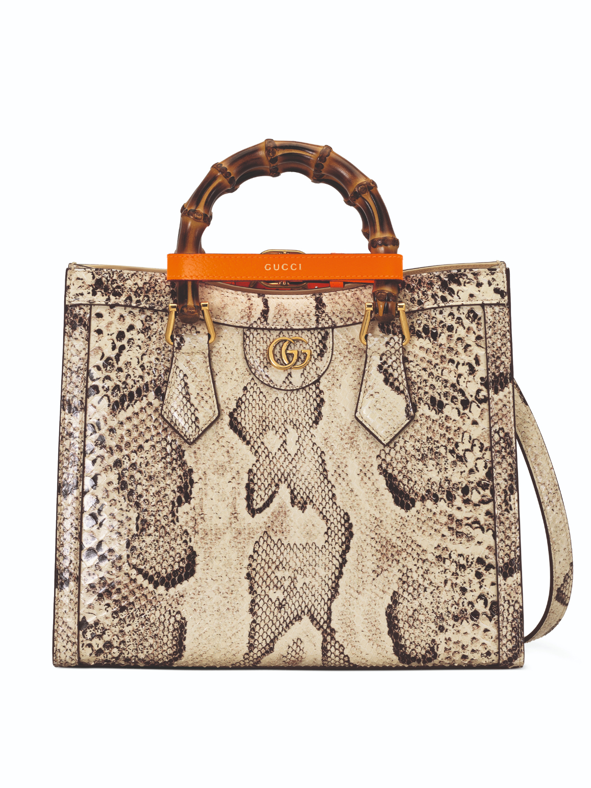Với dung tích rộng rãi và tiện dụng, Gucci Diana không chỉ là món đồ nâng tầm phong cách, mà còn là lựa chọn túi lý tưởng cho những dịp ra đường thường nhật hay những ngày đi làm. Và ngoài những màu sắc trơn phổ biến, nhà mốt còn giới thiệu những phiên bản đắt giá của Gucci Diana, với họa tiết lấy cảm hứng từ 3 loài động vật – trăn, cá sấu và đà điểu. Với họa tiết trăn, ta sẽ được chiêm ngưỡng ở ba phiên bản đen, màu rock ecru và xanh ngọc lục bảo.