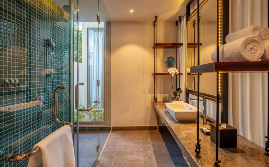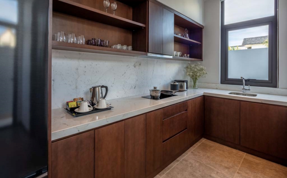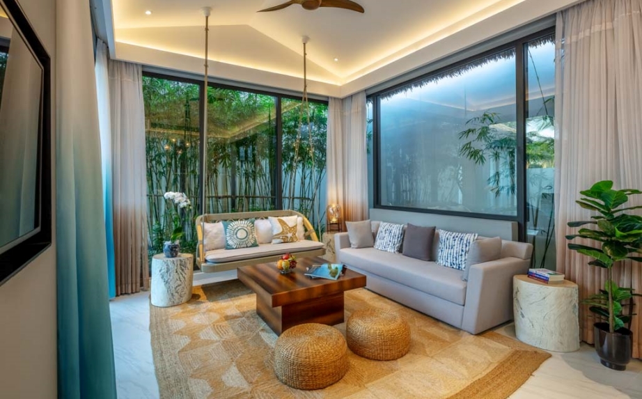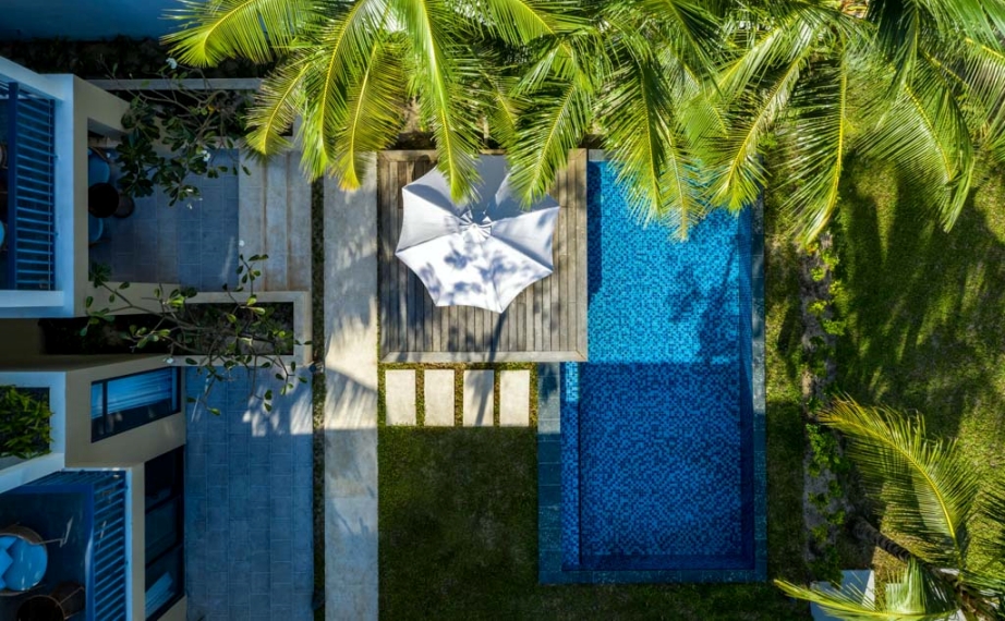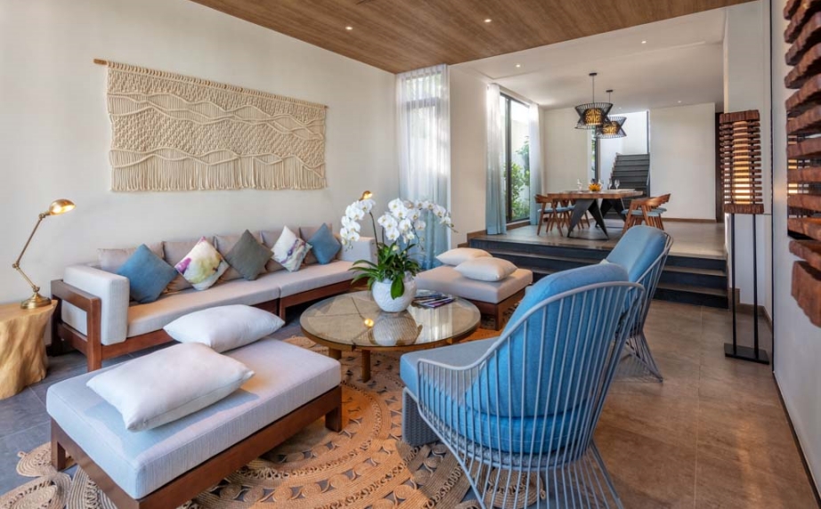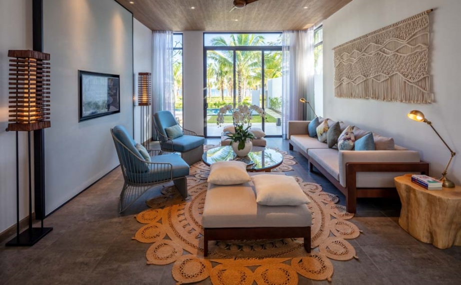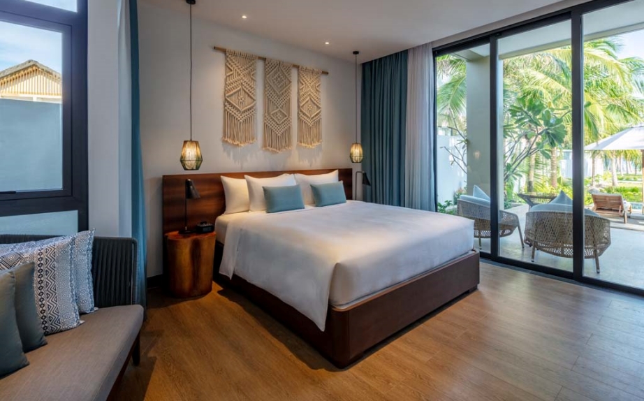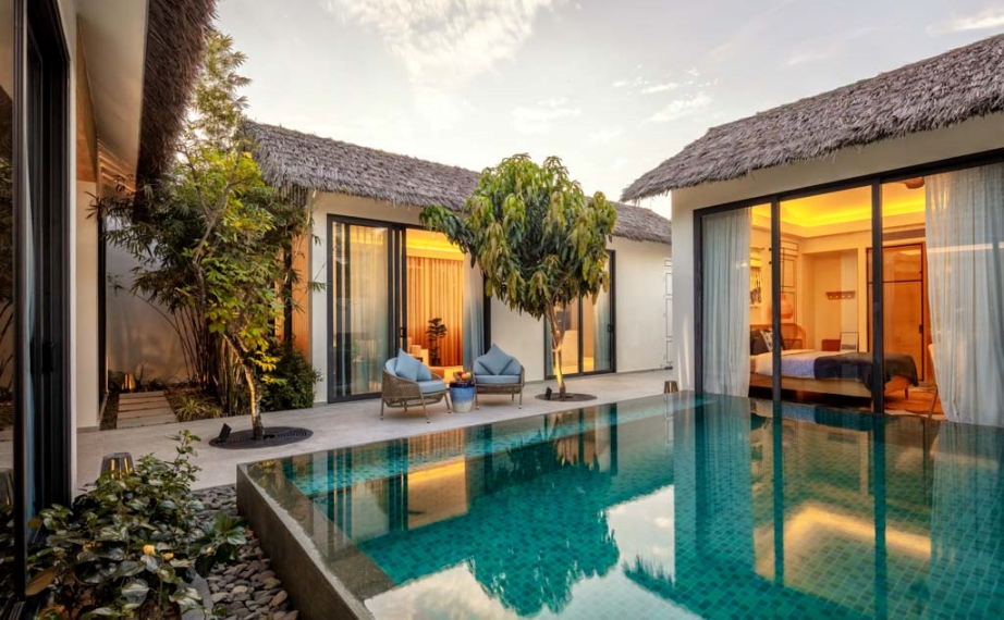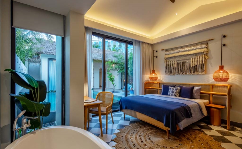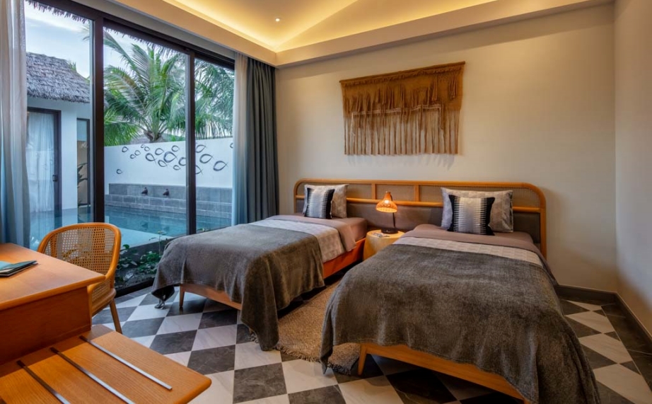 Garden Pool Villa tái hiện lại hình ảnh nếp nhà 3 gian truyền thống, với 3 phòng ngủ có lối vào riêng và không gian sinh hoạt chung bao quanh hồ bơi ngoài trời khép kín. Mỗi phòng ngủ được thiết kế tiện nghi với điểm nhấn trang trí từ hình ảnh làng chài và nội thất làm từ mây, tre mang gam màu trung tính dịu nhẹ, tạo cảm giác gần gũi, thảnh thơi.