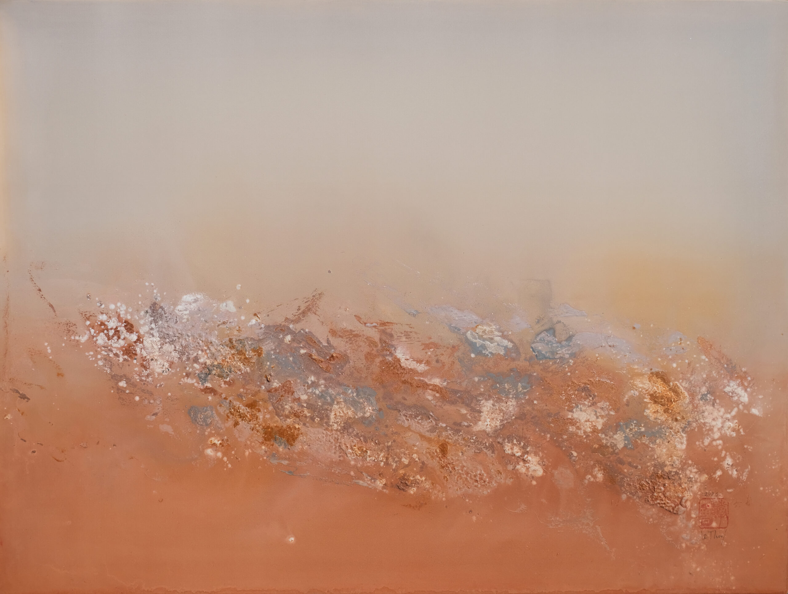 Nối tiếp hàm ý “kho lưu trữ”, loạt tranh lụa Vùng đất hoang vắng của Lê Thuý đề cập đến mối quan hệ giữa con người, đất đai và ký ức trong bối cảnh hậu chiến Việt Nam. Trên nền lụa mỏng, những chi tiết như bề mặt đất nứt nẻ, thảm thực vật khô héo ghi lại vết tích của sự chiếm hữu, bỏ hoang và suy thoái môi trường. Bằng cách xem cảnh quan như một lớp trầm tích, Thúy biến chủ thể những mảnh đất vừa thành một dạng ‘vật chứng’ của lịch sử, vừa là chủ thể phản chiếu những ham muốn, những góc tổn thương cũng như hành trình tái sinh của cộng đồng trên mảnh đất ấy.
