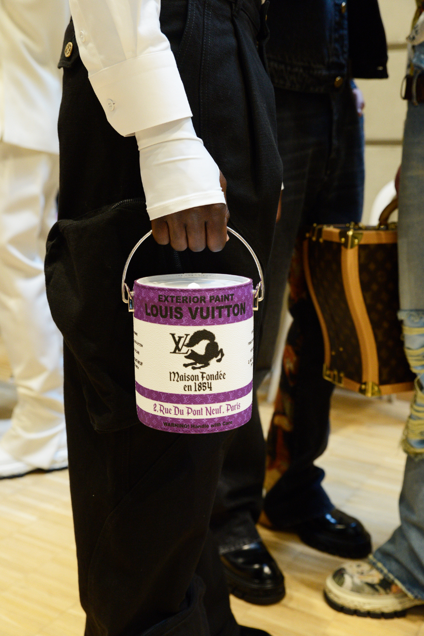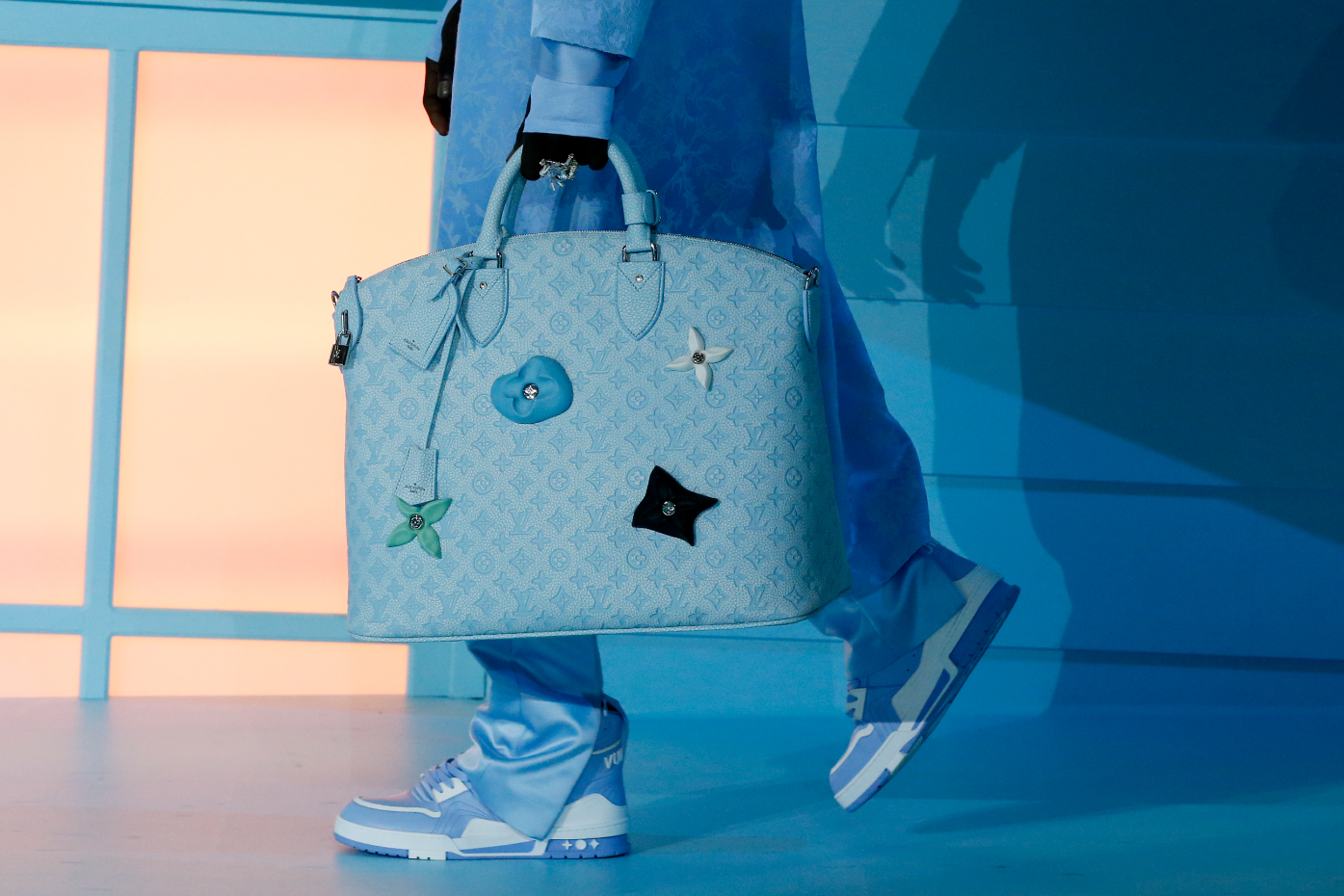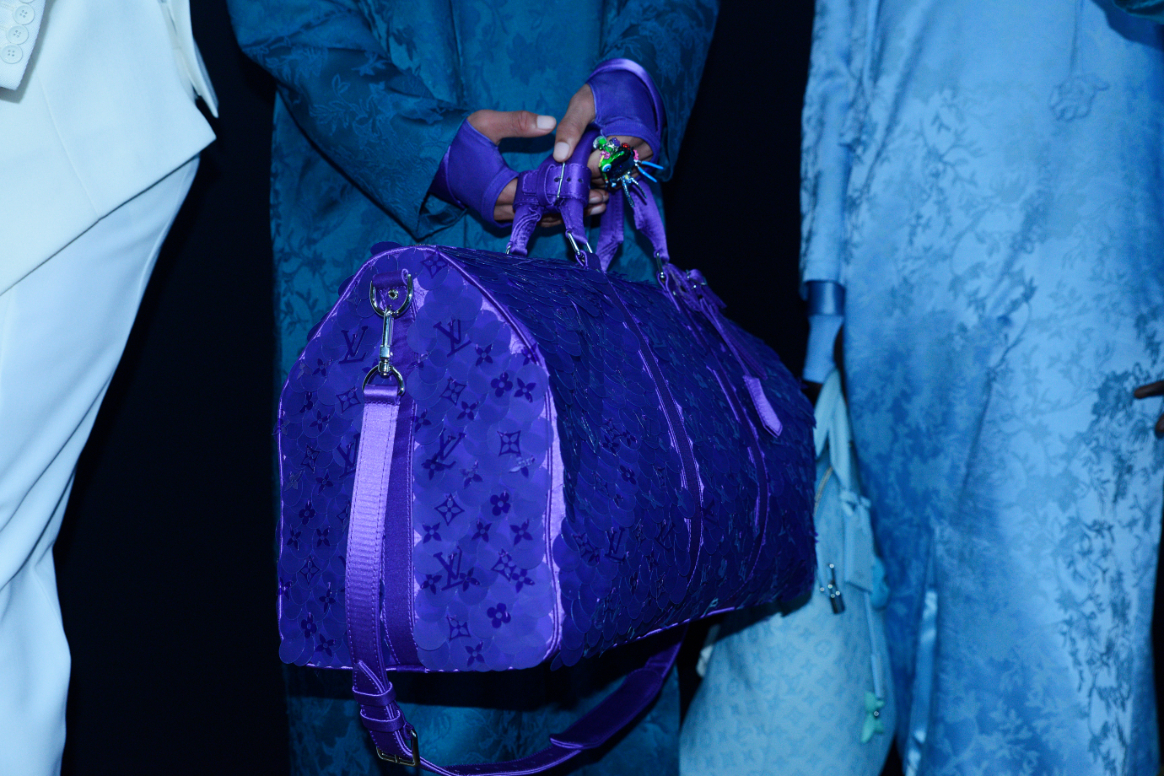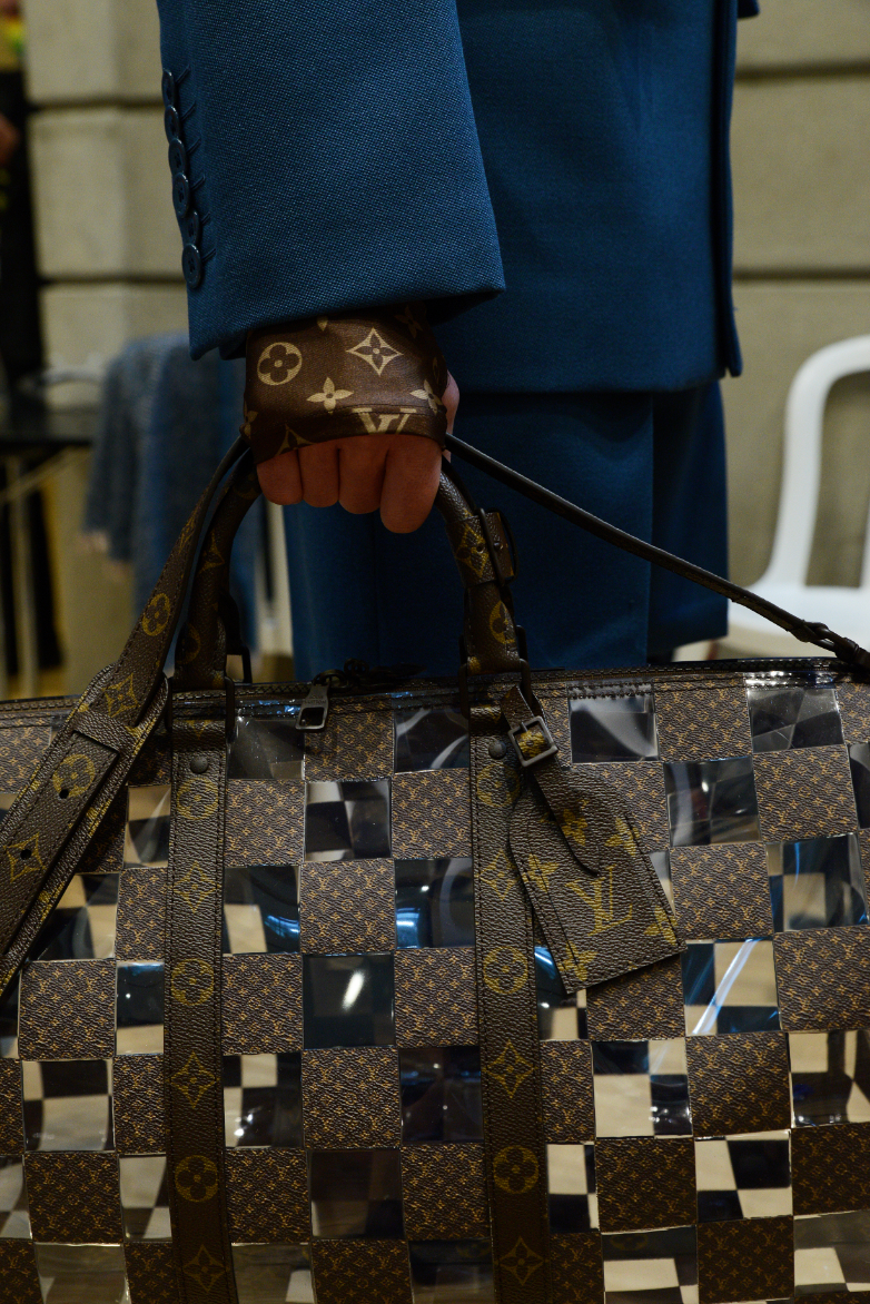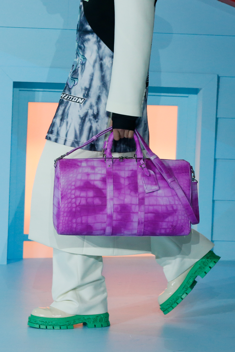 Ấn tượng hơn cả là dòng túi mang hình dáng hộp sơn, hay chiếc túi Darmier Keepalls mang họa tiết monogram “ảo ma” lúc trong lúc nâu, và chiếc túi monogram trắng xanh với chi tiết là những cục bám thường thấy ở những mảng tường leo núi trong nhà, như thể những nấc thang bước lên thiên đàng – nơi Virgil Abloh yên nghỉ.