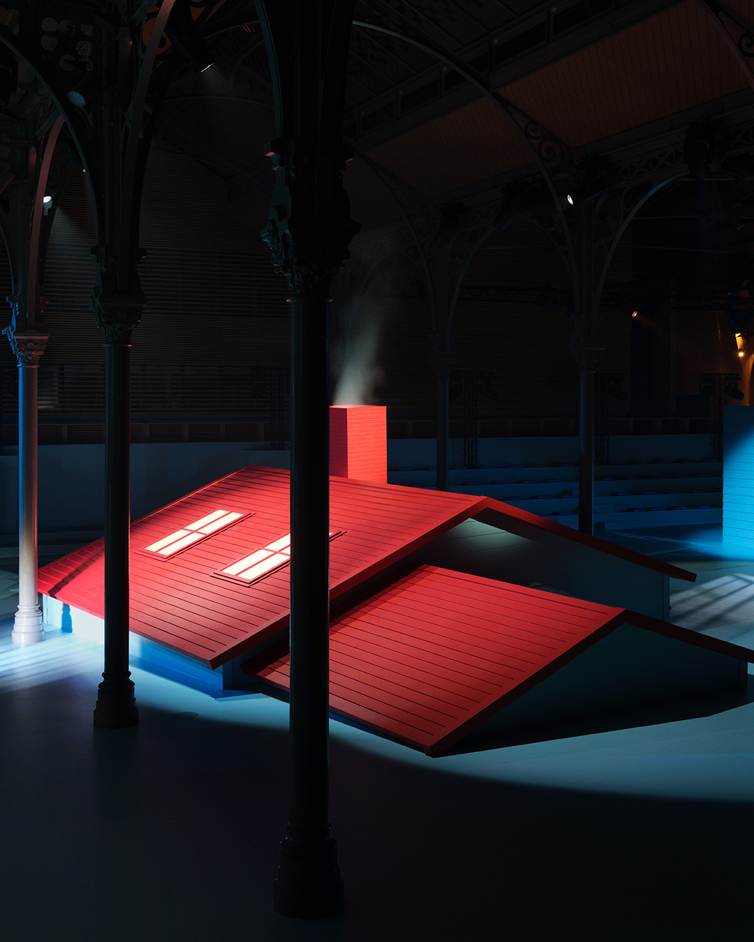 Bước đến không gian biểu diễn chính, vẫn luôn là cảm giác choáng ngợp, thích thú với sự sống động vốn có mà Virgil Abloh, hay đội ngũ sáng tạo của ông, mang lại. Xuyên suốt các bộ sưu tập tại Louis Vuitton, Virgil chưa một lần nào khiến giới thời trang phải trầm trồ với thiết kế bối cảnh độc đáo của mình, khi ông lần lượt tái hiện Con đường Gạch Vàng trong tiểu thuyết Phù thủy xứ Oz, khu Lower East Side của Manhattan, lễ hội hóa trang… Và lần này, PlayLab Inc., studio sáng tạo hợp tác cùng Louis Vuitton từ bộ sưu tập Xuân Hè 2020 đến nay, vẫn nắm bắt được tinh thần đầy sắc màu ấy, dựng nên bối cảnh ngôi nhà trong mơ như chốn địa đàng. Mở đầu với dãy bàn dài của dàn nhạc Chineke!, khán giả trôi vào cảm giác bềnh bồng khi hướng mắt qua chiếc cầu thang phong cách M.C.Escher, nơi những vũ công đang ban bật cùng tấm thảm trampoline. Ở bên dưới chiếc cầu thang là cánh cổng cam, và dàn người mẫu bắt đầu bước ra từ đó.