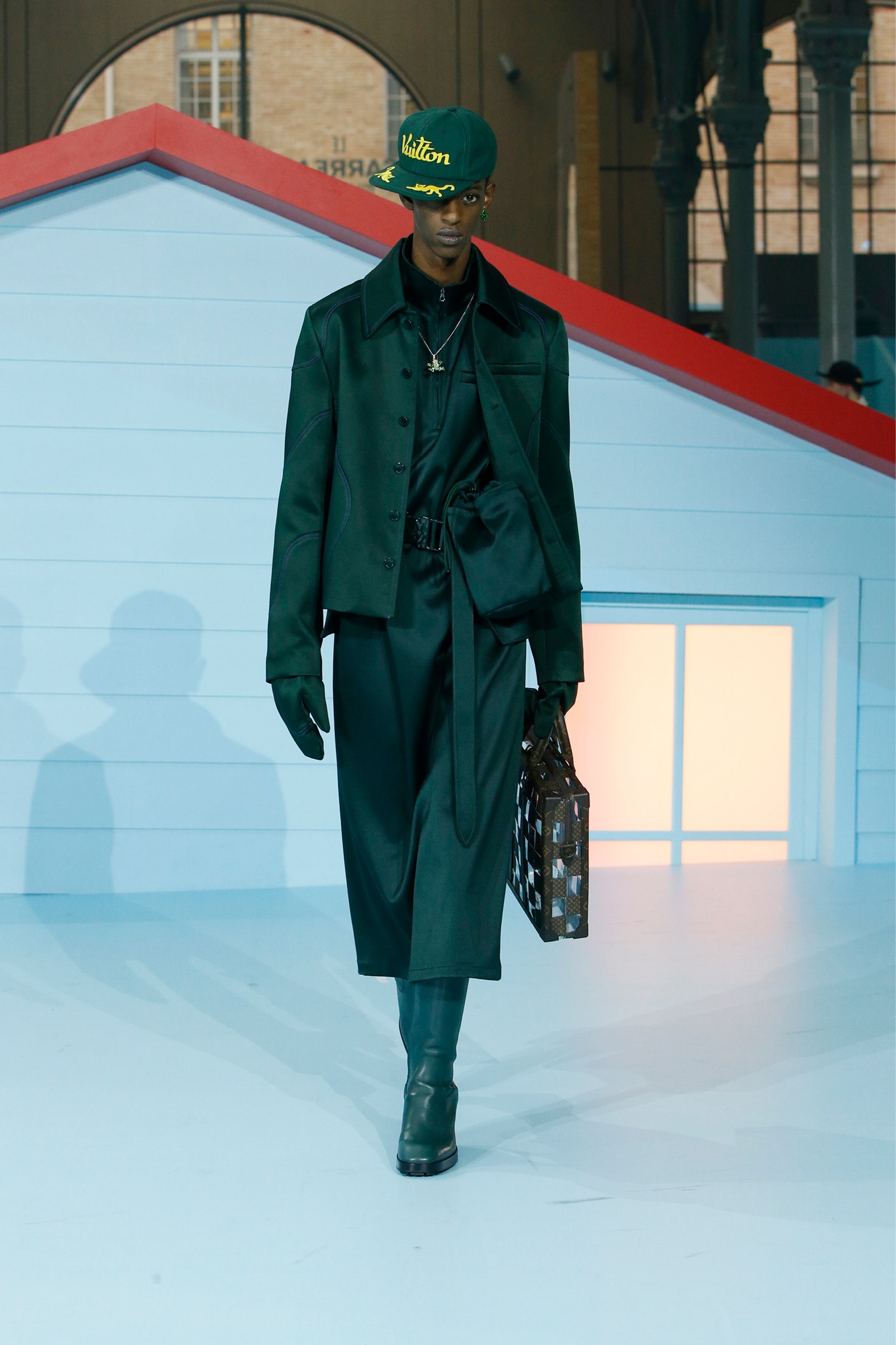 Nếu những bộ cánh phủ đầy hình ảnh vườn hoa là lời gợi nhắc đến lần ra mắt đầu tiên của Virgil Abloh cho Louis Vuitton ở bộ sưu tập Xuân Hè 2019, hoodie mặc cùng chân váy dài phủ chân đại diện cho tham vọng xóa bỏ sự ngăn cách của thời trang đường phố và cao cấp, thì những bộ outfit họa tiết từ hai tác phẩm Souvenir d’ Italie của Giorgio de Chirico và The Painter’s Studio của Gustave Courbet tiếp tục thể hiện niềm say mê đặc biệt của nhà thiết kế quá cố với nghệ thuật hội họa.