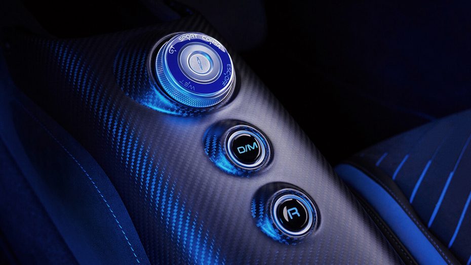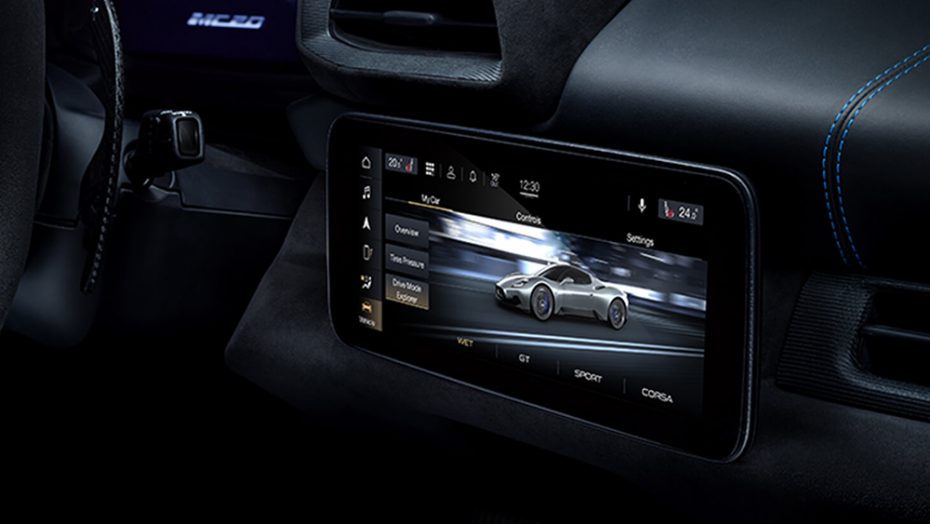 Sự đơn giản cũng được nhấn mạnh với bảng điều khiển trung tâm ốp sợi carbon, chỉ với một vài tính năng tích hợp: bộ sạc điện thoại thông minh không dây, bộ chọn chế độ lái (GT, Wet, Sport, Corsa và phần thứ năm, ESC Off – tắt các chức năng điều khiển), hai nút chọn tốc độ, các nút tùy chỉnh cửa sổ, tùy chỉnh Hệ thống Đa phương tiện và một ngăn chứa đồ tiện dụng bên dưới bệ tỳ tay. Tất cả các phần điều khiển khác đều nằm trên vô lăng, với nút khởi động ở bên trái và Launch Control ở bên phải.