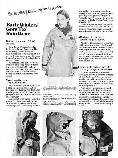 Cả hai đều được cắt may theo phong cách cổ điển thập niên 1970 – dài ngang đùi, phần ngực rộng rãi và tay áo dài. Từ đó, hành trình phủ sóng của Gore-Tex bắt đầu, từ thời trang ứng dụng, dây điện, phẫu thuật thẩm mỹ cho đến những bộ trang phục NASA. Năm 1990, The North Face chính thức kết hợp cùng Gore-Tex để làm nên những bộ trang phục thám hiểm biểu tượng, được sử dụng cho chuyến thám hiểm lịch sử xuyên Nam Cực.