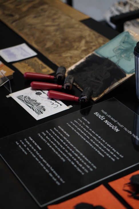 Còn một tác phẩm ấn tượng khác mà tôi từng thực hiện là tại bảo tàng cà phê, Hà Nội. Lấy chủ đề là các câu chuyện cổ tích Việt Nam như Sơn Tinh, Thủy Tinh. Nghệ sỹ origami Nguyễn Linh Sơn sẽ gấp những con vật liên quan đến cốt truyện. Tôi sẽ khắc và in phần phông nền. Đó là một trong những tác phẩm lớn nhất tôi từng thực hiện và làm tốc hành trong 4 ngày.