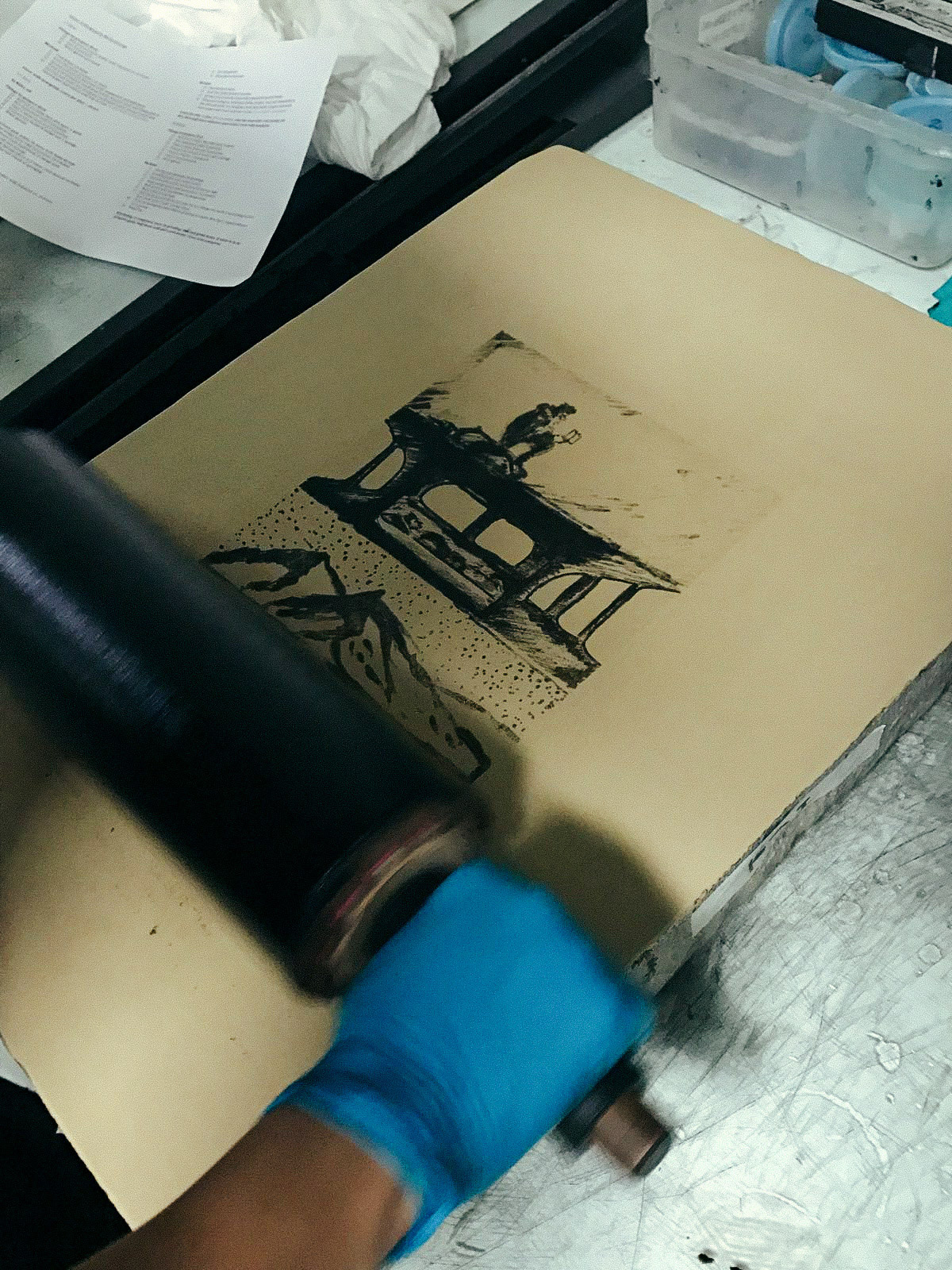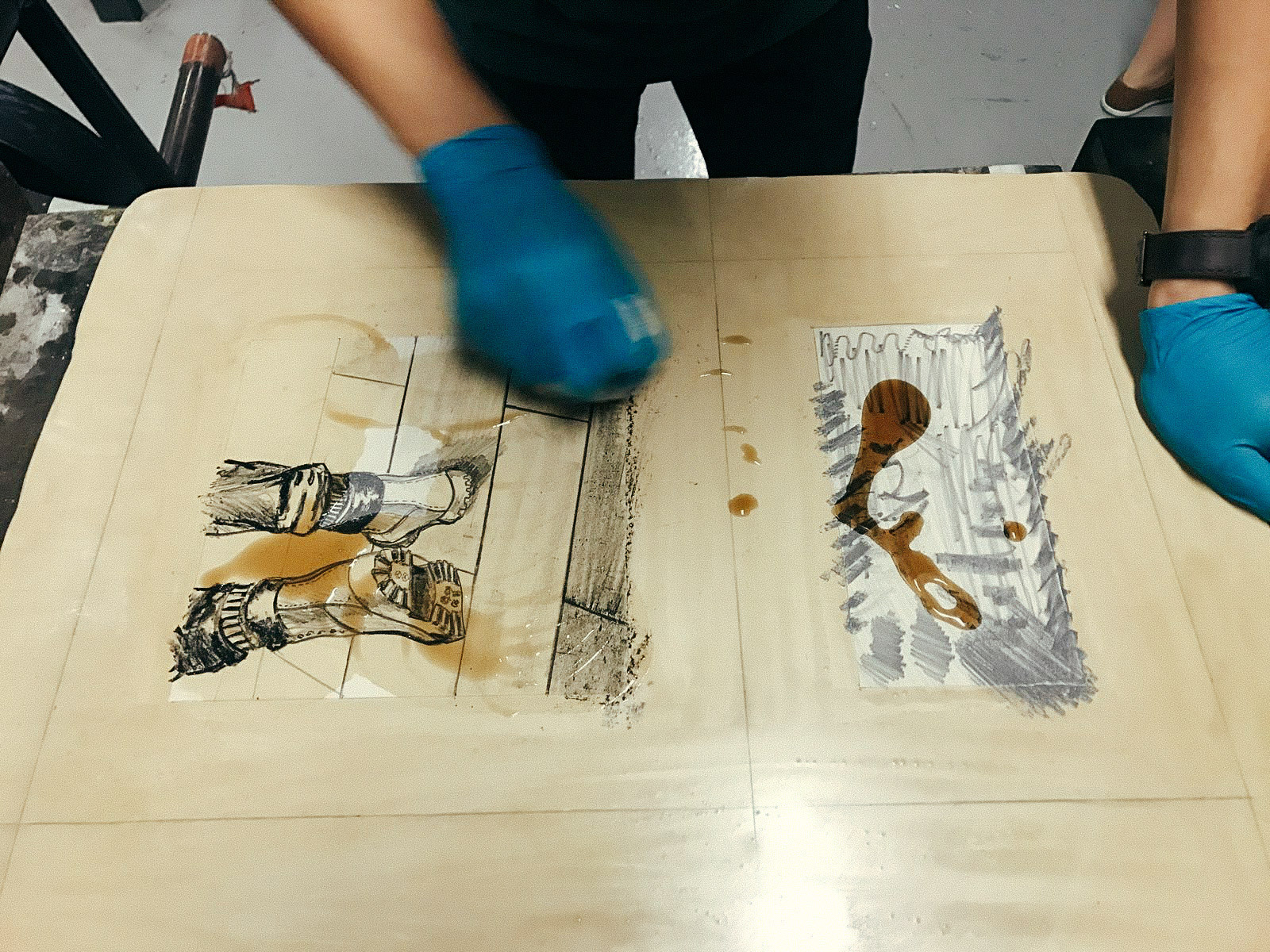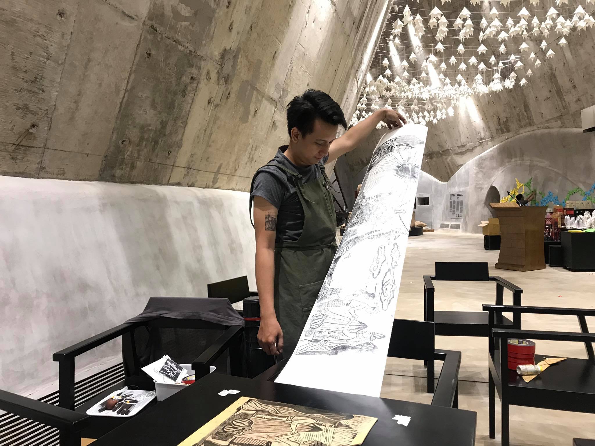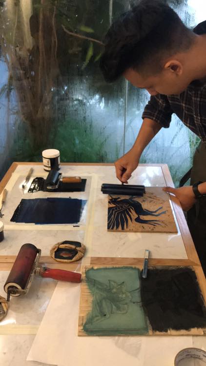 Kai lần đầu biết về print-making khi đi du học tại LASALLE College of the Arts ở Singapore. Lúc đầu, anh chỉ định học về graphic, nhưng lại được các thầy cô định hướng qua ngành fine art. Fine art bao gồm nhiều kỹ thuật và Kai đã chọn print-making. Nghe Kai say sưa kể về khoảng thời gian học ở trường và “ăn dầm nằm dề” trong xưởng, tôi có thể thấy anh đã tận hưởng bộ môn này nhiều thế nào. Anh bảo, mình thích print-making vì nó có nhiều bước. Cái đặc biệt của ngành in là sẽ sử dụng một bảng gọi là bảng ma trận (matrix). Đối với in lụa, đó là cái khung, đối với in lino là bản mộc.