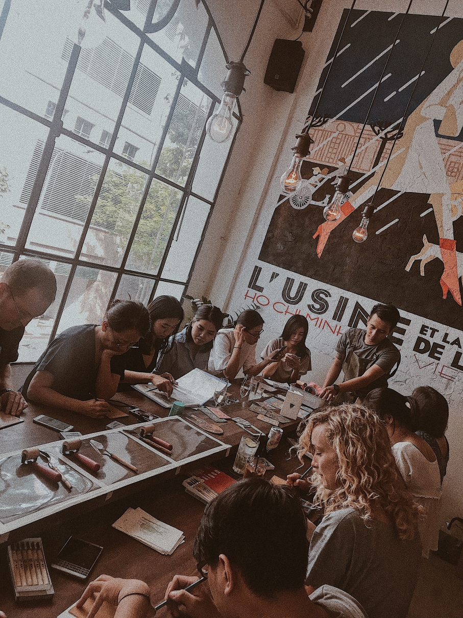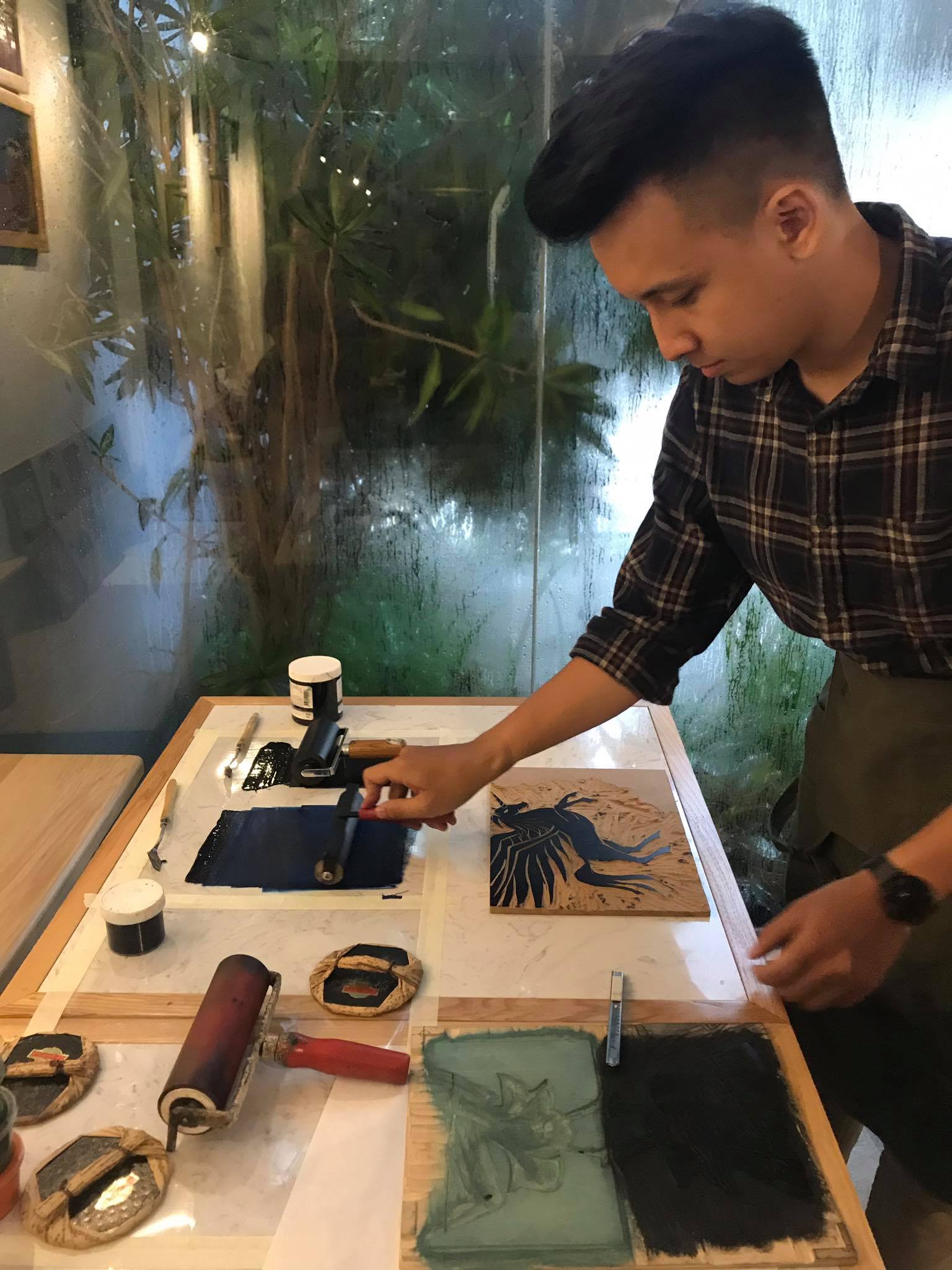 Đó là vào năm 2019, tại lớp in lino ở Chesse coffee. Vốn là một kẻ học đạo, nhưng tôi cũng chỉ biết đến in mộc bản qua tranh Đông Hồ. Do đó, cái tên workshop lúc ấy “in lino” đã khiến tôi vô cùng tò mò và còn ấn tượng hơn với anh hướng dẫn điển trai cùng lối giảng dạy dễ hiểu. Hữu duyên thiên lý, năng tương ngộ. Thật may mắn là hai năm sau, tôi gặp lại anh và có cơ hội hiểu thêm về anh chàng này.