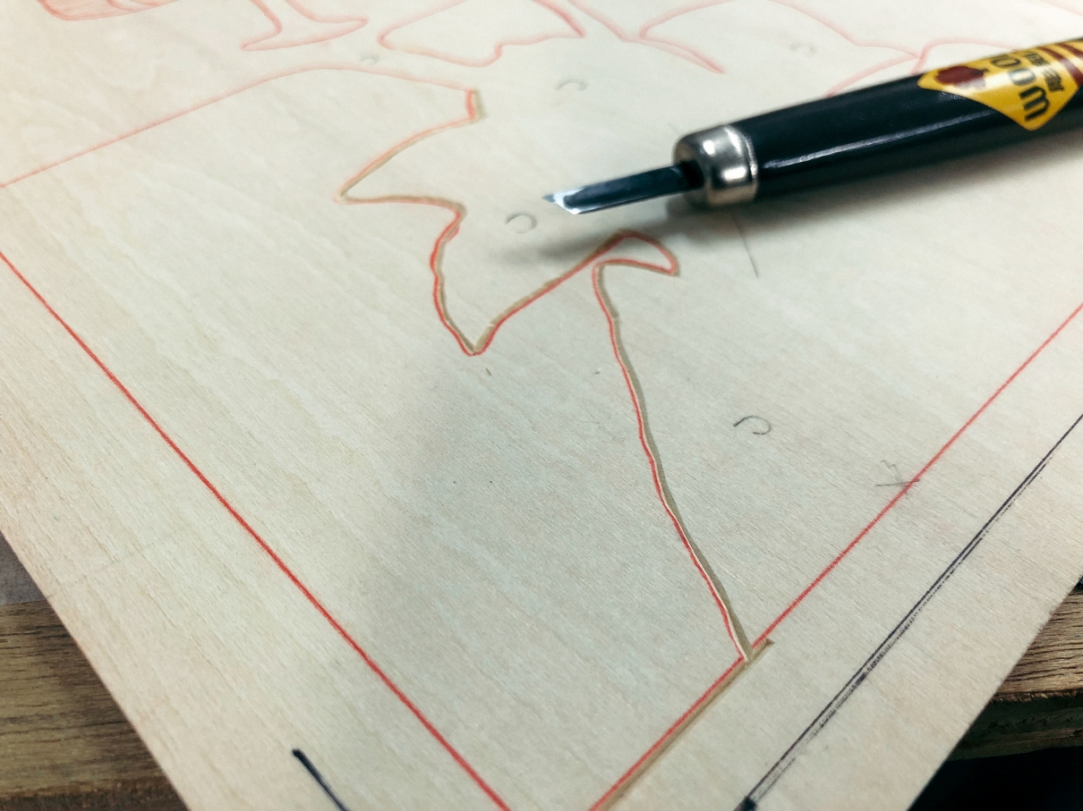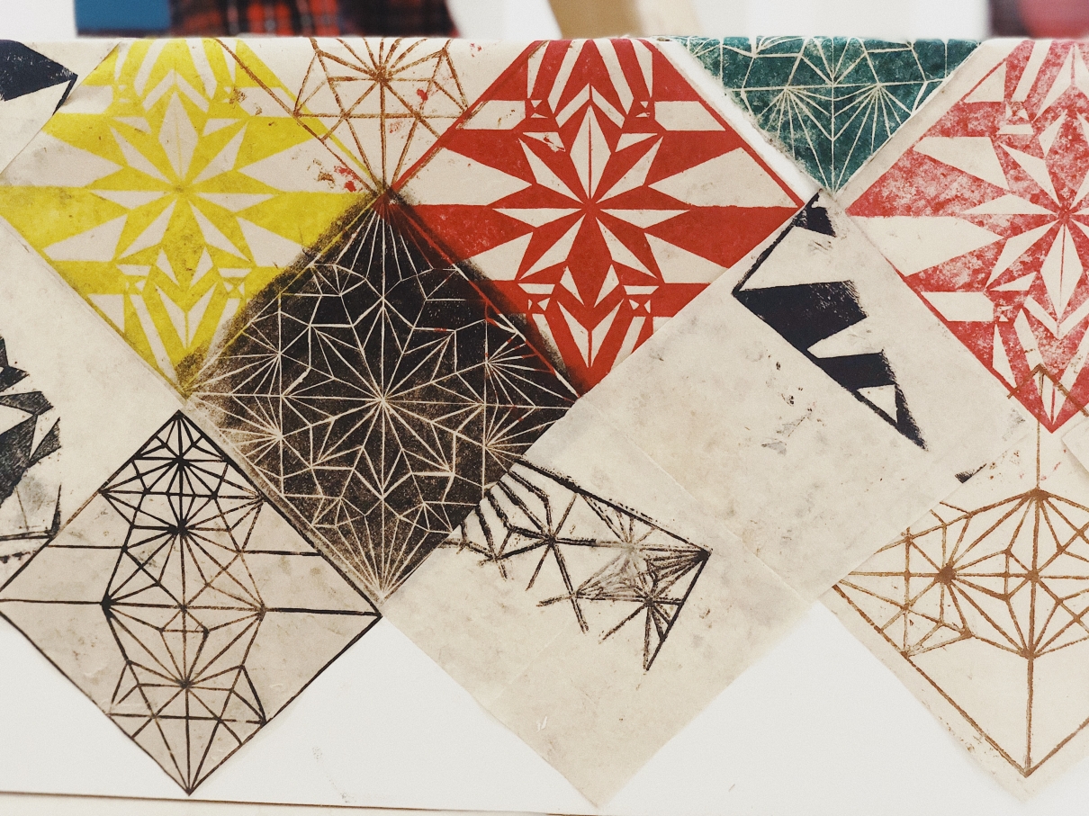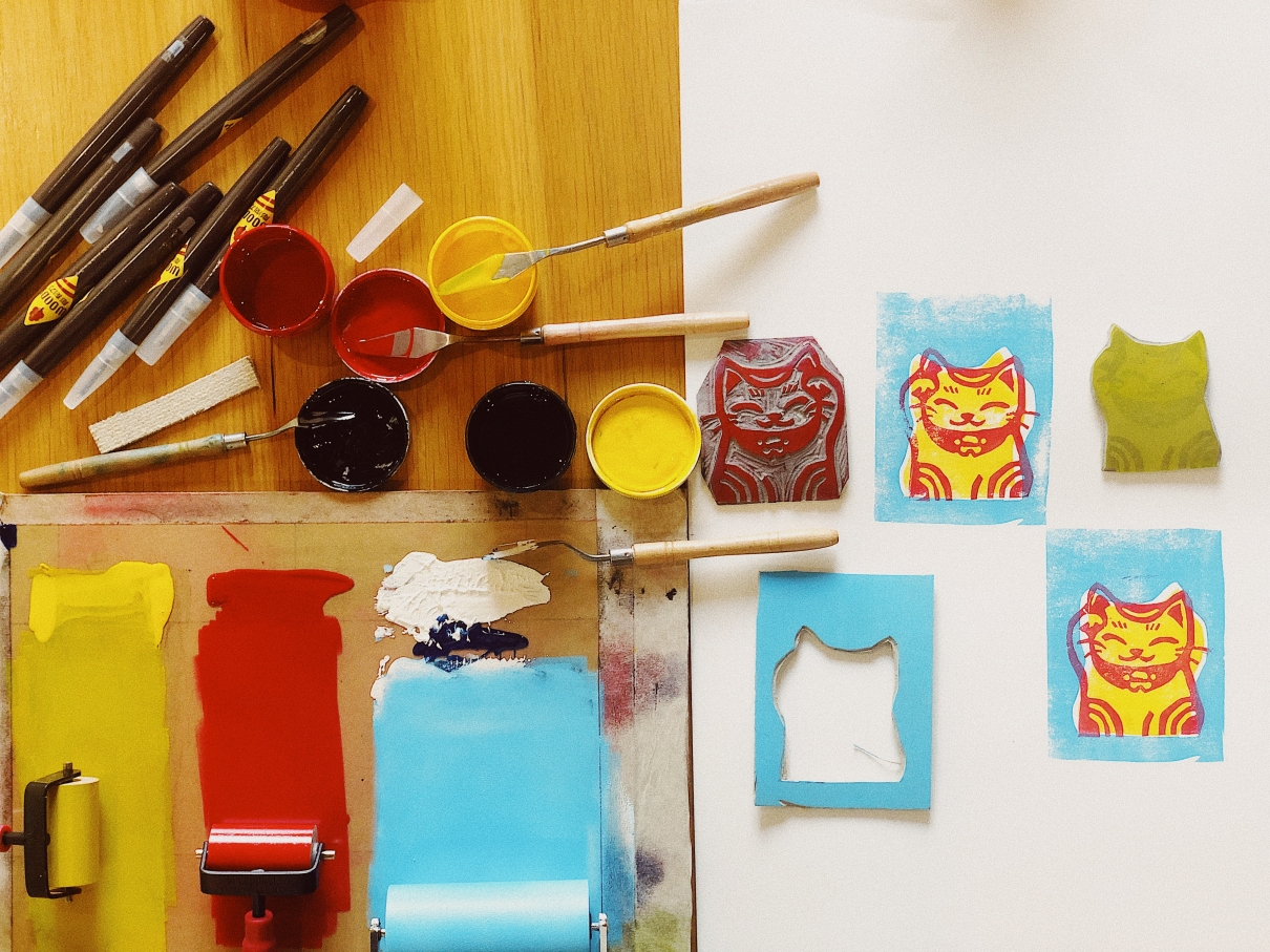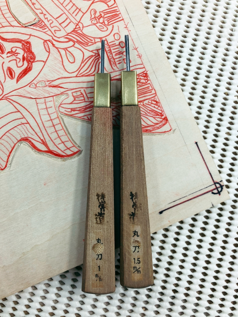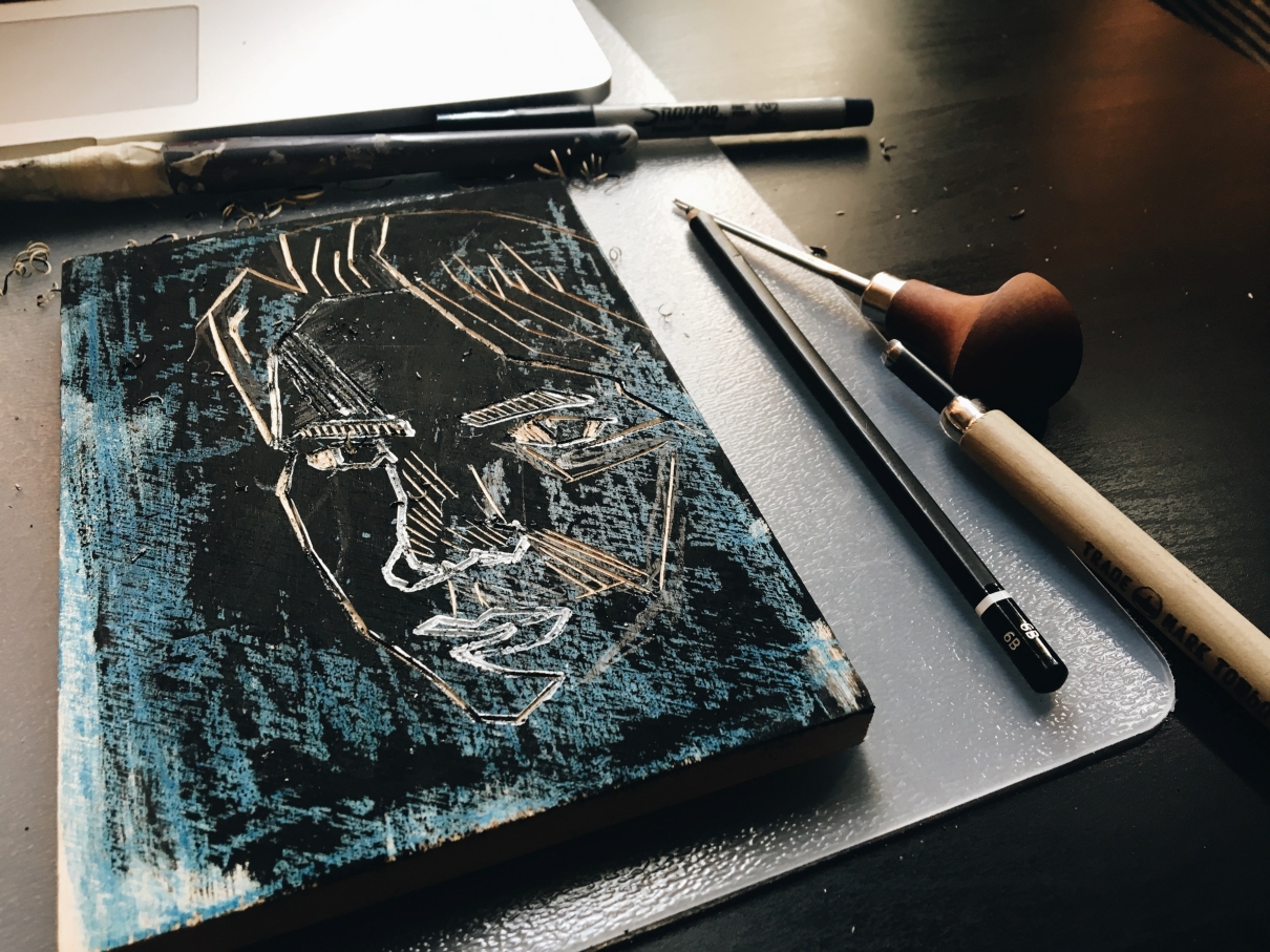Theo những gì tôi từng được học trong workshop của Kai, việc tạo nên một tác phẩm in bắt đầu bằng việc vẽ phác thảo.  Sau đó, sử dụng bộ dụng cụ gồm 5 món, bạn bắt đầu khắc theo từng nét mà mình đã vẽ. Cuối cùng, bạn bôi màu lên và in ra. Lý thuyết thì có vẻ đơn giản như thế, nhưng việc thực hiện đòi hỏi sự tập trung cao độ. Sai một li là đi một dặm. Chỉ cần đục lệch một nét là tác phẩm đã bị hỏng.