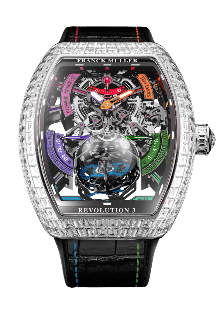 Tiếp đó phải kể đến sự sắp đặt nổi bật của đá quý baguette trên mỗi thiết kế. Đó là một công việc đáng kinh ngạc, thậm chí rất khó bởi những đường cong của vỏ đồng hồ. Tạo tác cũng để tri ân người đồng sáng lập của Franck Muller, Vartan Sirmakes, người đã từng là thợ kim cương lão luyện.