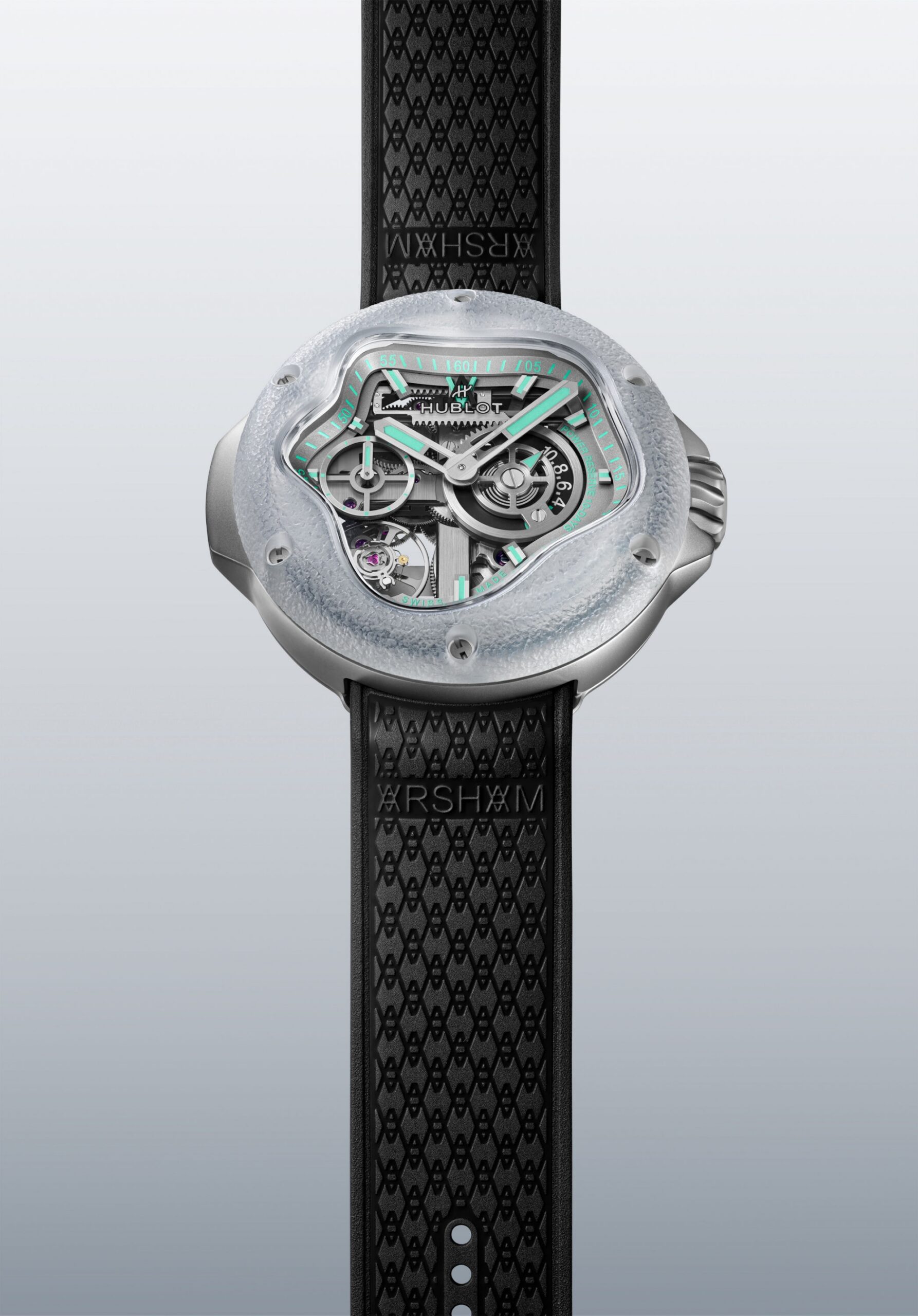 Đây cũng là thiết kế đồng hồ đeo tay đầu tiên của Arsham dành cho Hublot: một tác phẩm điêu khắc có thể đeo, thấm đẫm dấu ấn sáng tạo của anh trong từng đường cong uyển chuyển. Kích thước vỏ 42 mm nhỏ gọn đạt được nhờ tích hợp bộ máy Meca-10 phiên bản thu gọn – bộ máy lên dây cót tay do Hublot phát triển – có thể chiêm ngưỡng rõ nét qua mặt số mở và nắp đáy sapphire.