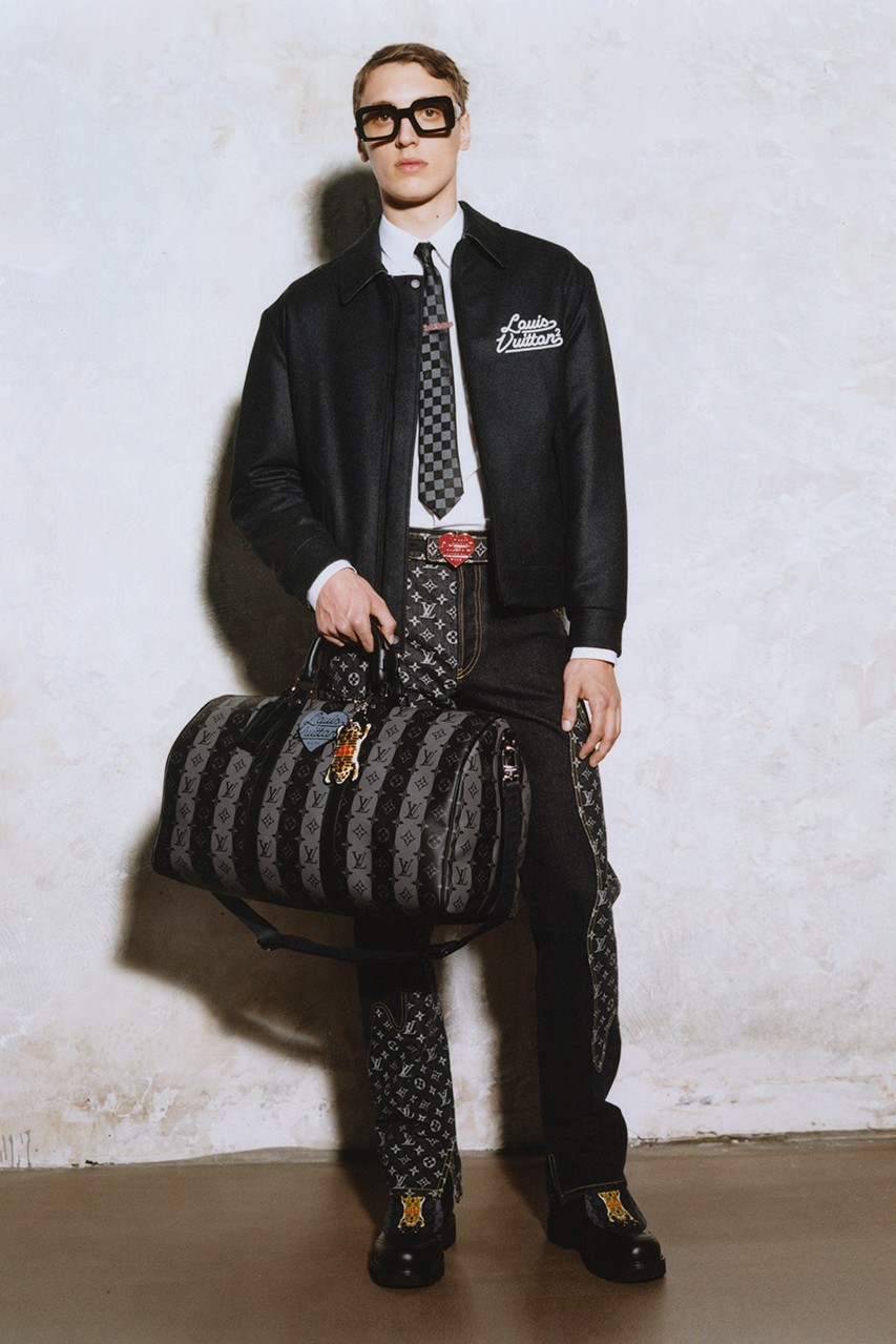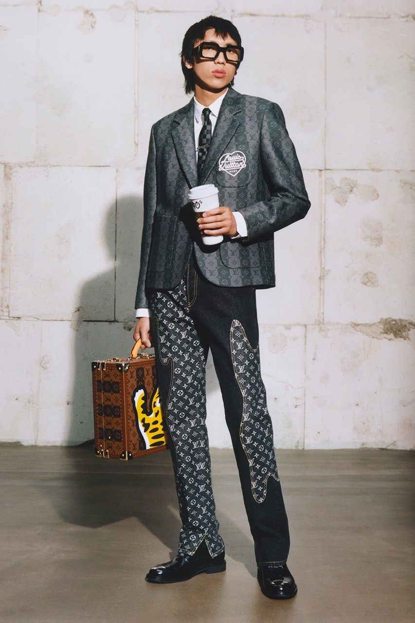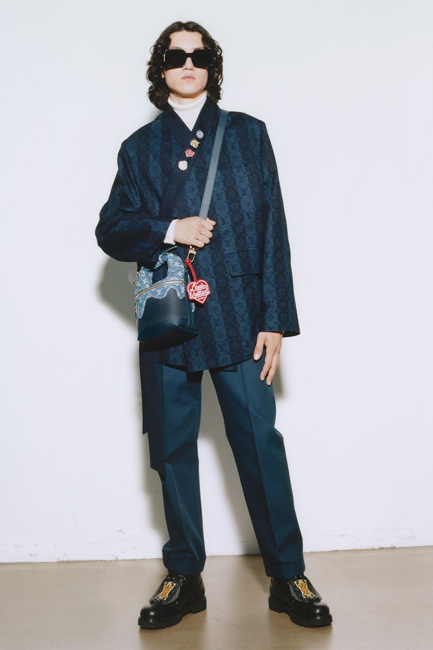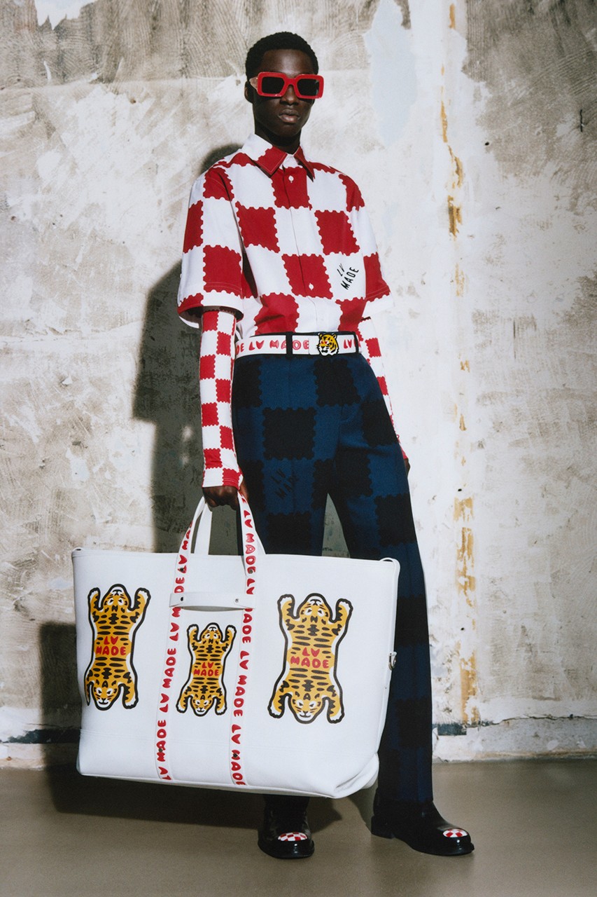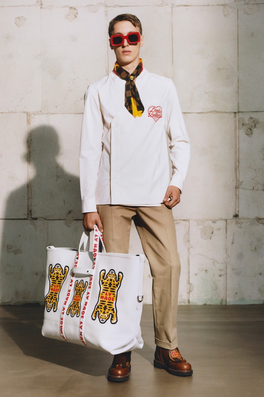 Các biểu tượng kinh điển Human Made của NIGO được “hack” và xuất hiện trên những thiết kế của Louis Vuitton, đáng chú ý nhất là mô-tif hình chú hổ và trái tim màu đỏ. Đặc biệt hơn, dấu ấn cộng hưởng của hai nhà thiết kế lớn còn được thể hiện qua phom dáng của của chiếc áo sơ mi và áo khoác, lấy cảm hứng từ kimono và tem bưu chính. Đi cùng với đó là thiết kế áo khoác được làm bằng vải trám Monogram trứ danh, thường xuất hiện trên các vali và túi du lịch của nhà mốt nước Pháp.