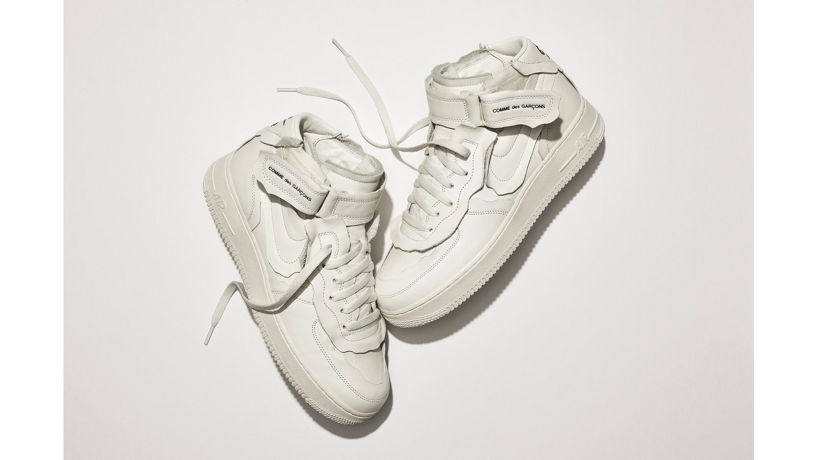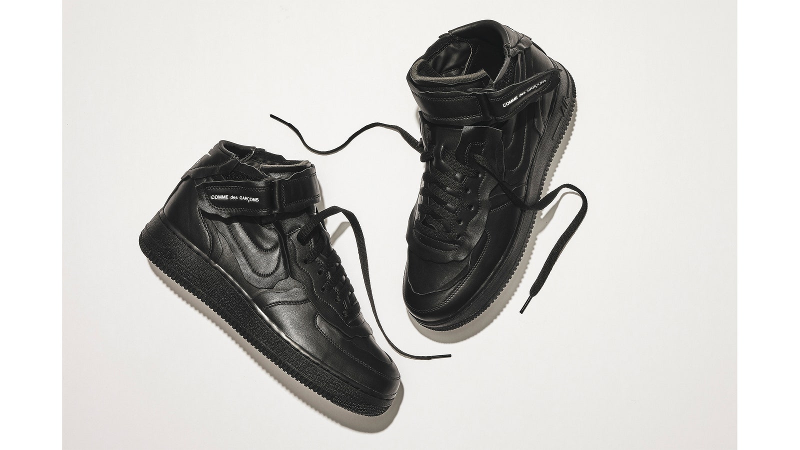 Thoạt nhìn Nike x Comme des Garçons Air Force 1 mang vẻ ngoài tối giản. Kawakubo cải biến hình dáng Air Force với bằng phom dáng mới. Phần đai quấn quanh giày in nổi dòng chữ Comme des Garçons nhằm đánh dấu sự hợp tác đặc biệt.