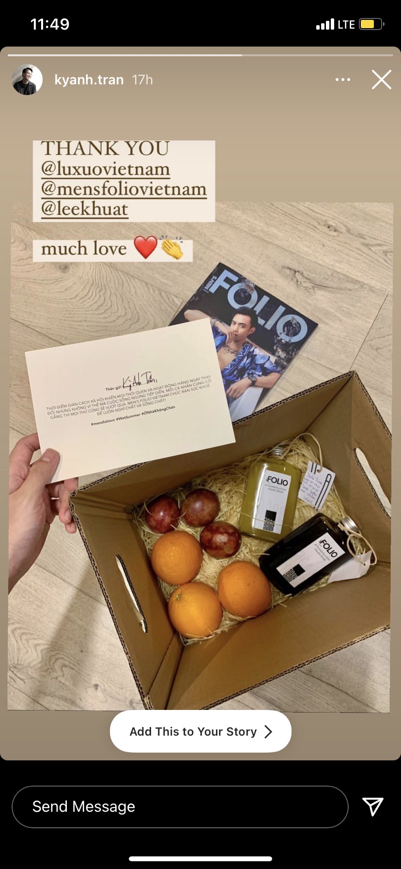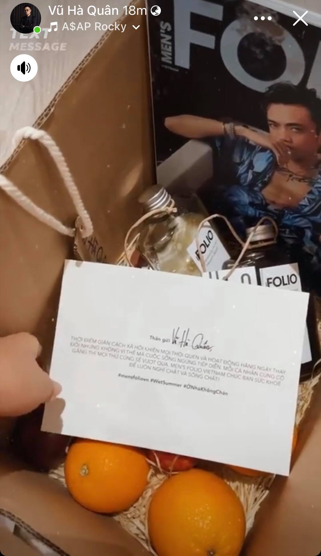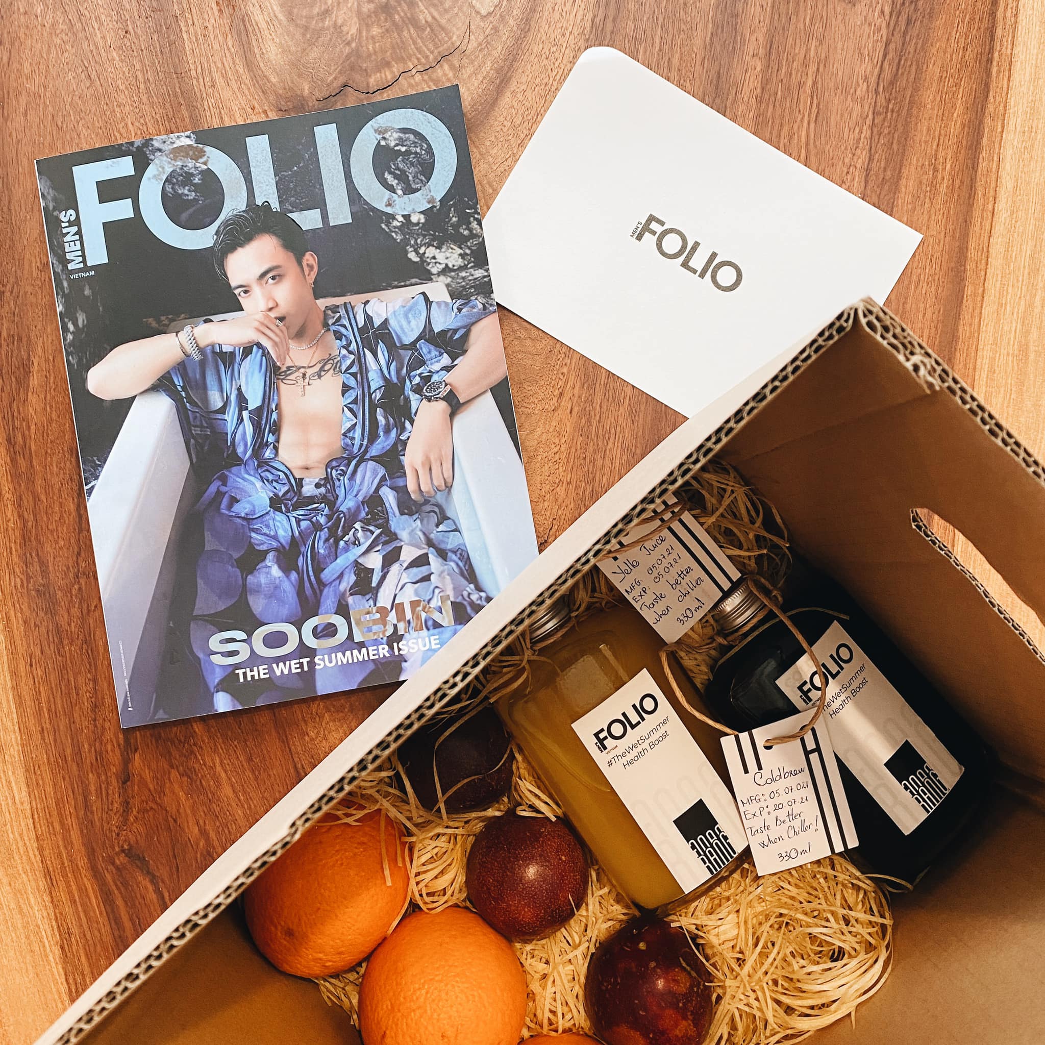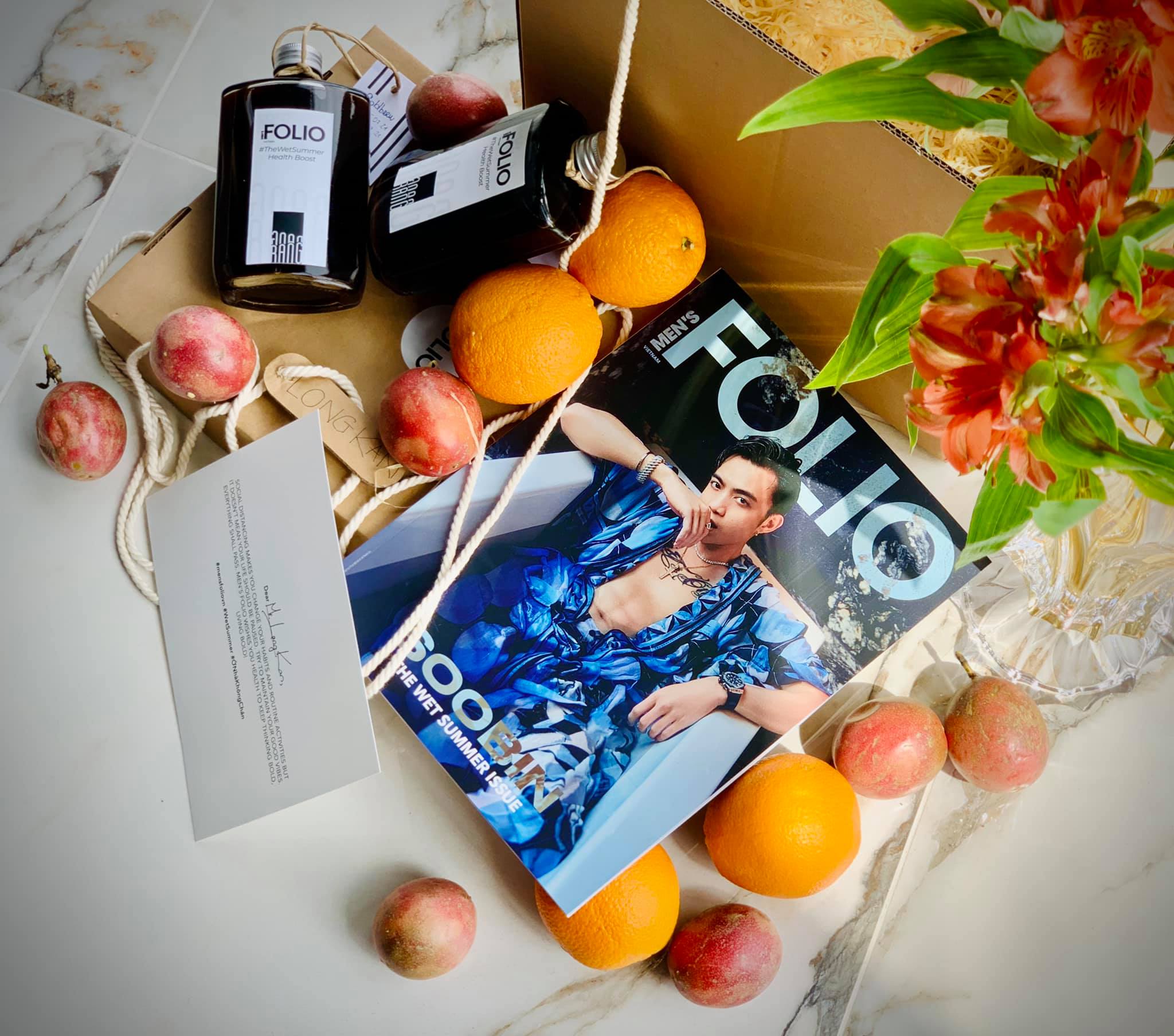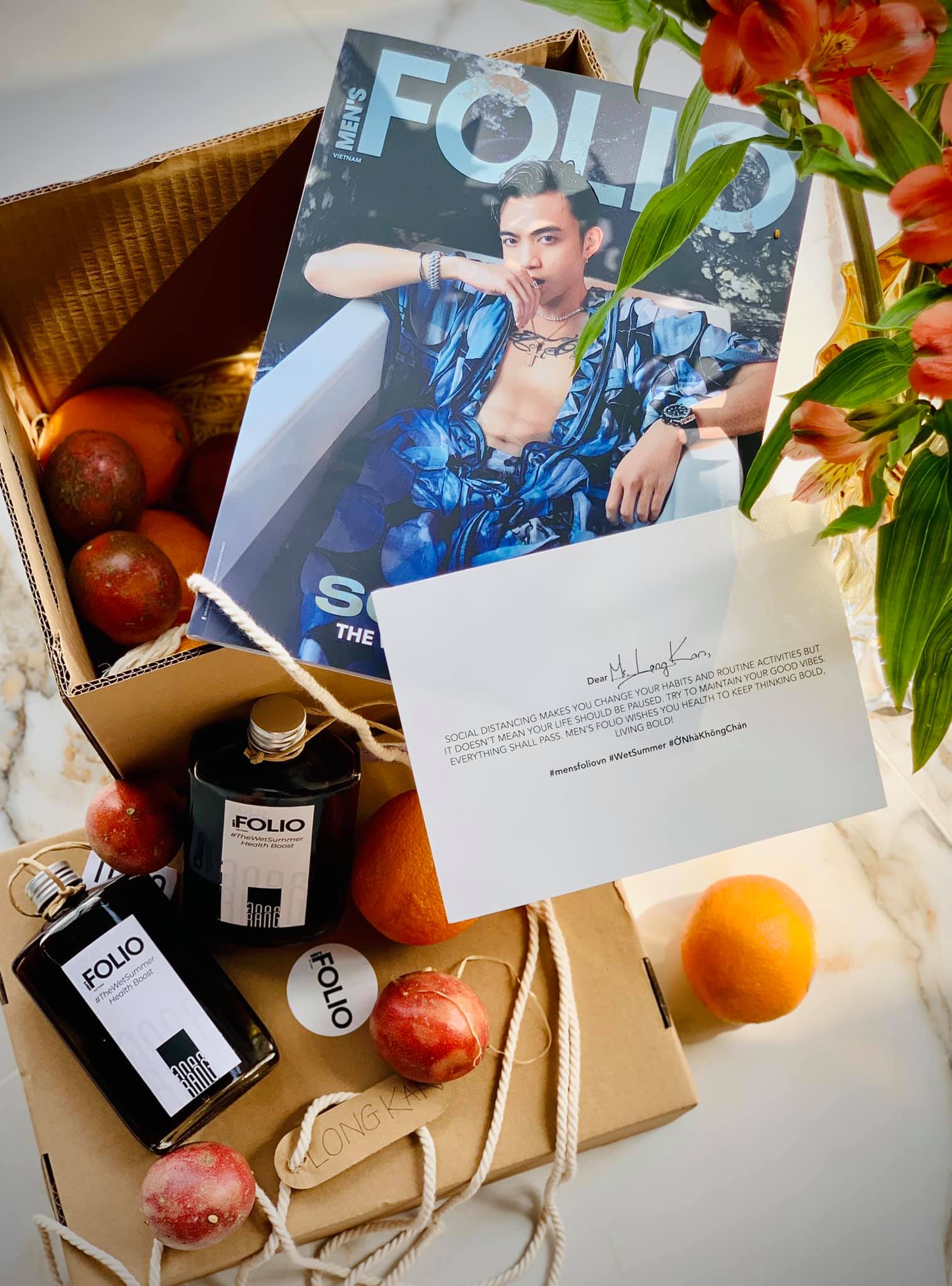 Từng món quà được đội ngũ Men’s Folio Vietnam tự tay lựa chọn và đóng gói. Trong đó bao gồm cam và chanh dây, hai thứ quả có hàm lượng vitamin C cao, giúp cũng cố hệ miễn dịch. Bên cạnh đó là đồ uống giúp giải nhiệt mùa hè: nước trái cây và cold brew. Cuối cùng chính là ấn phẩm #5: The Wet Summer issue cùng một tấm thiệp viết tay. Chỉ trong một buổi chiều, Men’s Folio đã nhận được rất nhiều lời cảm ơn và niềm vui của những người bạn thân thiết sau khi nhận được hộp quà. Điều này đã khiến chúng tôi cảm thấy công sức được đền đáp xứng đáng.