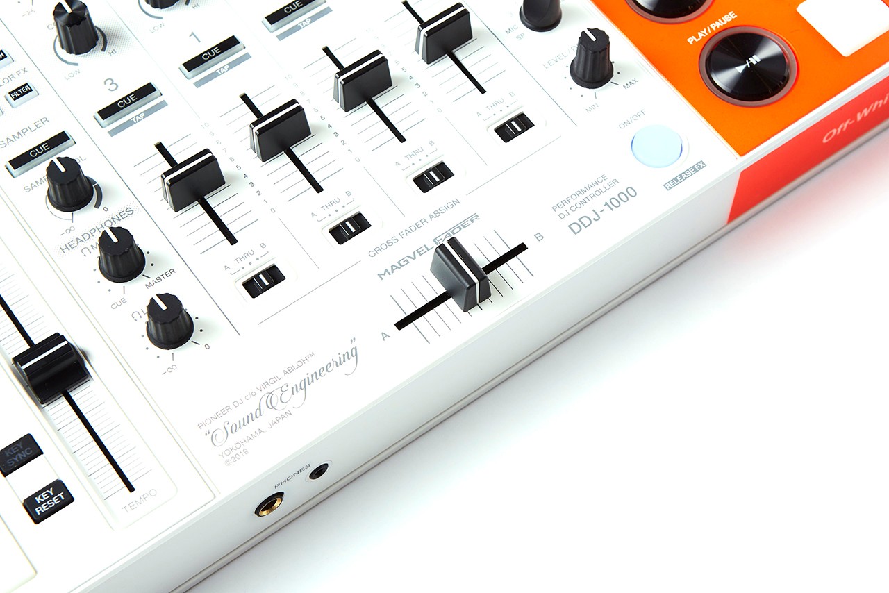 Với thiết kế Pioneer DDJ-1000 làm nền tảng, Off-White ™ tô điểm bảng điều khiển với các điểm nhấn thiết kế đặc trưng cùng tông màu trắng-cam nổi bật. Và chiếc bàn DJ sành điệu này được mang tên DDJ-1000-OW. Bộ điều khiển chính là món item mở màn cho mà cộng tác SOUND ENGINEERING của Abloh, sở hữu nhiều ký hiệu “đặc sản” của Abloh, ví dụ như dấu ngoặc kép biểu tượng của Off-White, cặp logo xuất hiện trên chiếc bàn DJ. Thiết kế hoàn toàn mới còn kế thừa những đặc tính vốn có của dòng sản phẩm CDJ-2000NXS2 và DJM-900NXS2 trong khi vẫn giữ nguyên bố cục 4 kênh.