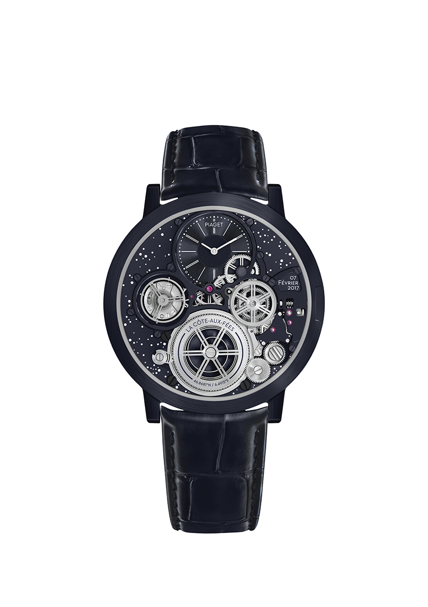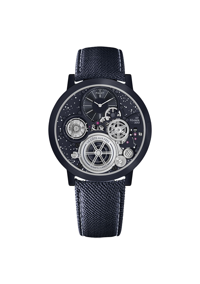 Bắt đầu từ phần mặt số, logo Piaget sử dụng phông chữ giống với kiểu chữ của logo phía trên cơ sở sản xuất ở La Cotê-aux-Fées, ngôi làng nơi Piaget ra đời và vẫn tồn tại đến ngày nay. Hai khung tròn lớn nằm giữa vòng phút biểu thị thời điểm khai sinh của Altiplano Ultimate Concept là 7:47, ngày 7/2/2017 khắc trên cửa sổ nhỏ ở hướng 2 giờ là ngày ra mắt lần đầu, bên cạnh chữ “La Cotê-aux-Fées” trên bánh cóc.